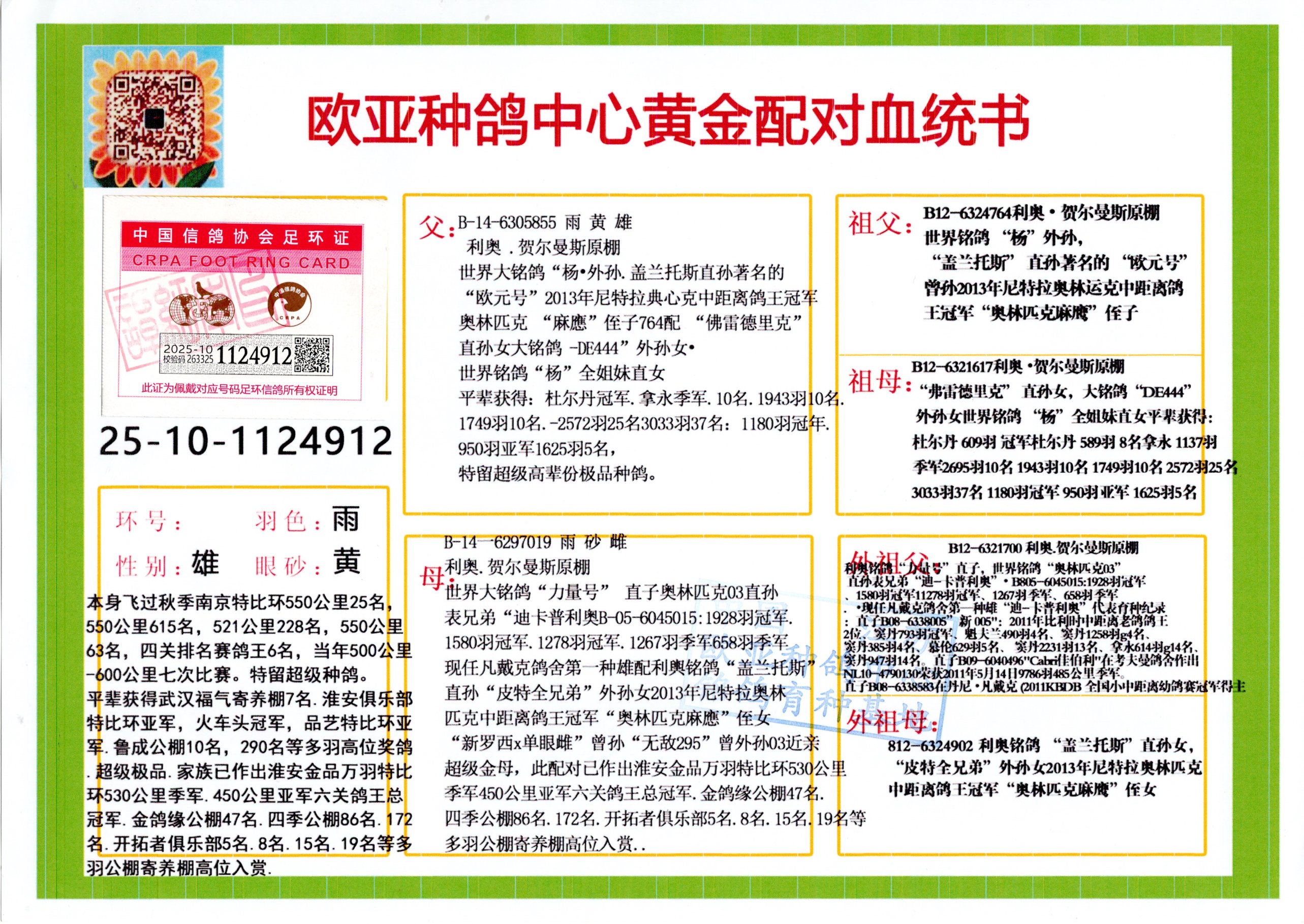 24年秋南京特比环欧亚荣获大团体冠军.小团体冠军551公里大特比13名.14名.16名.19名.20名.21名.24名.26名.27名.28名.42名.52名.54名.57名.65名.66名.68名.70名.71名.72名.74名.76名.80名.82名.83名.84名.85名.86名.90名.92名.110名.116名.121名.122名.128名.131名.158名.161名.164名.165名.166名.172名.174名.177名.182名.195名.196名.201名.205名.208名.210名.216名.253名.269名.275名.276名.294名.296名.299名,,24年秋云南天南铜都公棚决赛415名.天南铜都小棚决赛409名.云南玉活公棚决赛102名.490名.团体32名上笼二羽进二羽,天南铜都大棚506公里决赛445名。热烈祝贺河北省巨鹿县李兰生老师用欧亚泰山号血系连续十一年夺冠军,河北省国家赛冠军.全国季军等多次前十名高位,扬州王军王总用欧亚利奥24年春季获山东翔宇公棚决赛33名盖比53名。南京刘正龙刘总用欧亚盖比获得24年秋山东潍坊国际公棚决赛42名.精英赛30名.三关鸽王71名.决赛86名.加站赛16名.南京市特比环A组鸽王9名.B组鸽王5名.6名.C组鸽王5名.精英赛冠军4名.技能赛A组冠军4名.5名.秦淮区特比环荣获15名.46名.48名.87名。四川西昌徐亮徐总用欧亚利奥获得凉山州聚友决赛177名.第二关亚军双关鸽王19名.三关鸽王105名.云南豪庭公棚决赛603名。热烈祝贺24年四川重庆翔园鸽舍用欧亚泰山号荣获春季400公里冠军.秋季500公里冠军,河北王总用詹森X利奥获得千羽千翔公棚400公里冠军,广东蔡楷焕荣获24年秋爱好者 赛鸽俱乐部三关鸽王季军.一关420公里99名.二关450公里11名.三关520公里32名.单关季军.7名.12名,江西李卫兴荣获贵州红枫公棚8名.共翔俱乐部寄养棚四关综合鸽王30名.一关400公里78名.二关500公里55名.三关520公里37名.四关500公里57名.同父母获公棚18名.雷鸣获得武汉黄浦育翔中心冠军,四川陈文获得四川明鸿俱乐部300公里梦幻2名.3名.4名.9名.10名.13名.14名.15名.31名.34名.40名.41名.42名.43名.69名.71名.72名.73名.74名.94名.95名.97名.98名.99名.419公里决赛荣获总冠军7名.总共归巢9羽,四川徐亮获豪庭决赛603名,山西郑勇获得山西泰鑫公棚决赛255名詹森红狐,热烈祝贺马总获得开尔(飞跃队)决赛9名获奖金1310000万元.第一关52名,天津津福资赛180公里96名.获奖金429543万元,欧亚支持全国鸽友24年秋多人报喜 祝大家取得更好成绩,给欧亚报喜鸽友欧亚决定给每人赠送一羽超级种鸽。欧亚俱乐部特比环多关鸽王成绩:15年秋淮安特比环黑色星期一全会上笼9700多羽,当天无鸽归巢,第二天全会归巢357羽,本舍归巢158羽.前十名八羽.前一百名归巢57羽,16年春季获五关鸽王总冠军,总亚军四名.六名.七名.九名.十名.晶艺俱乐部520公里冠亚季军5名.6名.7名.9名.11名等,火车头冠军.季军6名.8名.9名.10名,16年秋晶艺俱乐部特比环520公里亚军.季军4名.6名.7名.9名,15年春南京白下特比环冠军.亚军.季军6名.7名.8名.9名.10名.指定鸽A B组获得冠军.亚军.季军4名.5名.,17年淮安特比环亚军.4名.5名.7名.8名.10名.六关鸽王总冠军.4名.6名.9名.10名,寄养棚宿迁刘总20羽特比环获冠军.季军.4名.7名.8名.9名等。18年荣获万羽特比环六关鸽王总冠军.总亚军.总季军.6名.8名.十名.单关四羽冠军.二羽亚军.四羽季军.前十名27羽。19年秋万羽特比环六关鸽王总亚军.总季军.5名.8名等,单关二羽冠军.三羽亚军.一羽季军前十名31羽。20年秋淮安市鸽会四关特比环大赛风雨无阻鸽王亚军.鸽王六名,金品俱乐部万羽特比环六关鸽王总冠军,总亚军.四名.五名.六名.七名.八名.十名.前二百名鸽王35羽,单关冠亚季军前十名四十多羽,火车头五关鸽王季军.六名.八名.前二百名鸽王十七羽。20年春荣获淮安五区一市四关鸽王总冠军.亚军.四名.八名.九名。21年秋荣获金品万羽特比环大赛六关鸽王总亚军.总季军.四名.七名.九名.十名.单关冠亚军季军前十名三十多羽。火车头协会鸽王六名.七名.十名.单关前十名十七羽。22年秋荣获鸽王总冠军.总亚军.5名.7名.8名.9名.11名.单关冠亚季军前十名三十多羽,第一关单关前二百名四十多羽,第二关前二百名三十多羽,第三关前二百名四十多羽,第四关前二百名四十多羽,第五关前一百名53羽。23年秋荣获鸽王季军.五名.八名.十名.13名.17名.20名.27名等多羽鸽王.单关前十名二十多羽。公棚.寄养棚部分成绩:16年秋宁夏黄河公棚总冠军电脑戈马力指定通炮冠军,17年送八羽参赛获得鸽王八名进奖四名,支持韩总荣获八名。支持鸽友荣获宁夏中卫公棚决赛总冠军.精英赛冠军,支持18年宁夏黄河公棚决赛冠军詹森X泰山。安徽鼎博寄养棚院内外四关鸽王总冠军.鸽王十七名.三十七名同窝,鸽王39名.42名.58名.67名。18年山东公棚预赛冠军.决赛65名.送八羽进奖五羽.指定获奔驰汽车一辆。支持鸽友获得云南蓝云公棚冠军.盖比X佛卡门。支持鸽友荣获云南银集公棚决赛冠军 詹森427X520血系 速度赛6700羽冠军。17年荣获金马俱乐部寄养棚四关鸽王总冠军.季军.六名.八名.第一关冠军.亚军.季军四名.七名.十一名.金牌教练奖。支持鸽友18年北京费翔公棚预赛九名电脑X桑杰士,支持鸽友荣获陕西威力公棚决赛11名.内蒙古临河寄养棚四关鸽王六名.詹森配泰山,支持河北王总用欧亚詹森427配胡本喜获20年秋开尔青年棚季军。云南东荣公棚16年预赛冠军.决赛77名.17年决赛12名.詹森红狐X泰山,17年平安公棚决赛4名 詹森427。欧亚获得21年金母寄养棚第一关四名.第二关5名.第三关5名.6名.7名.10名.三关鸽王总冠军,四关鸽王14名.十羽鸽王。支持河