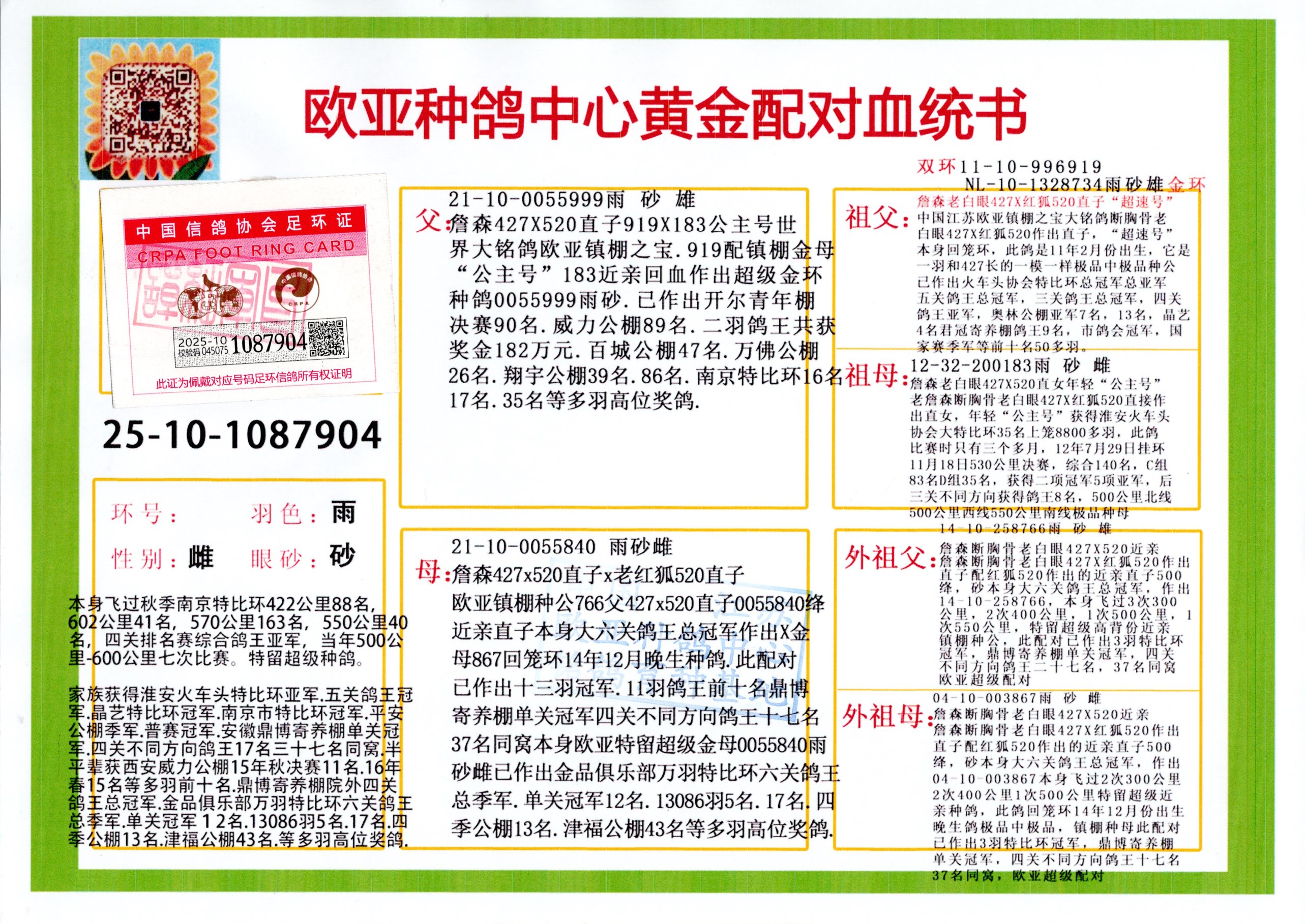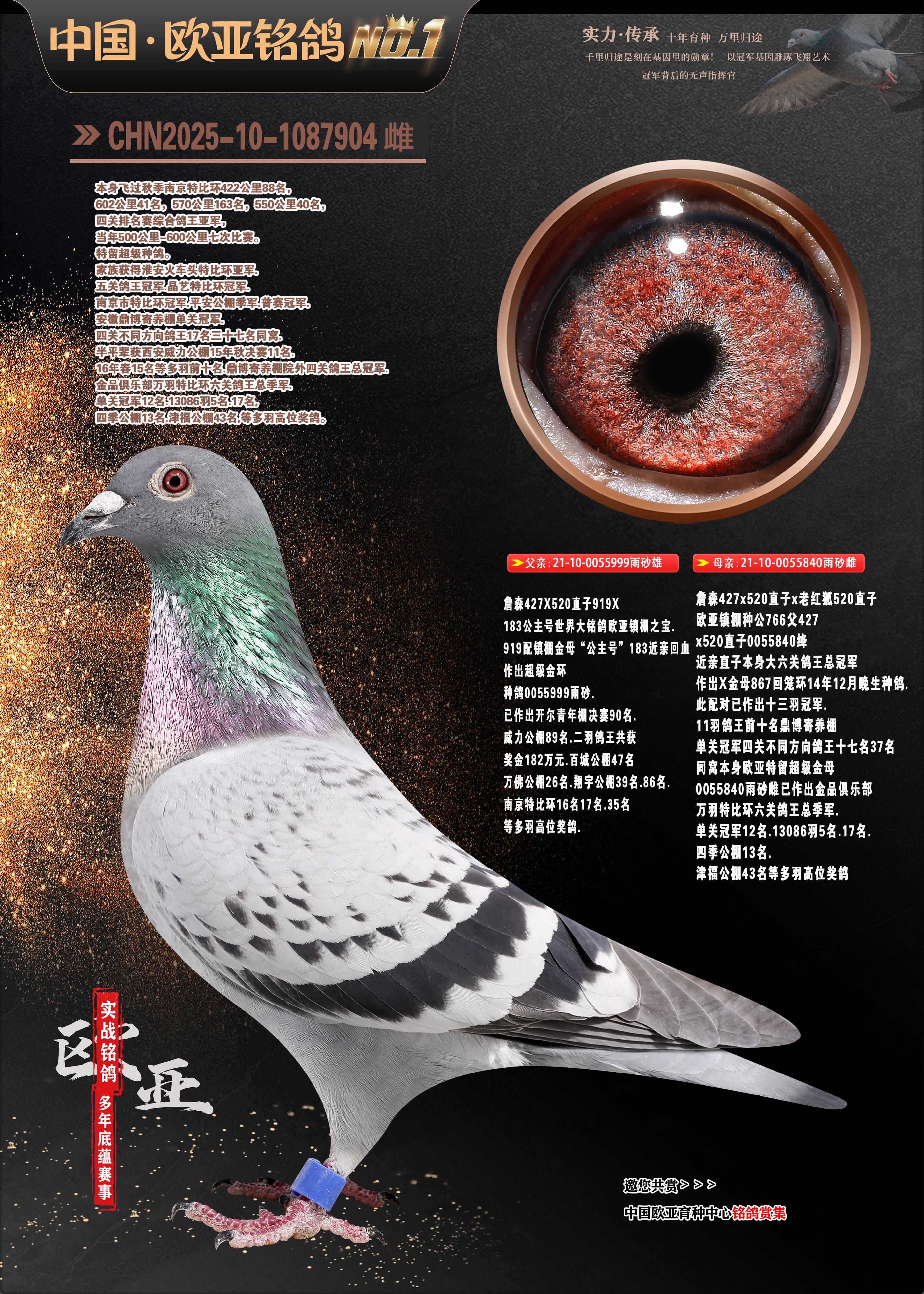24年秋南京特比环欧亚荣获大团体冠军.小团体冠军551公里大特比13名.14名.16名.19名.20名.21名.24名.26名.27名.28名.42名.52名.54名.57名.65名.66名.68名.70名.71名.72名.74名.76名.80名.82名.83名.84名.85名.86名.90名.92名.110名.116名.121名.122名.128名.131名.158名.161名.164名.165名.166名.172名.174名.177名.182名.195名.196名.201名.205名.208名.210名.216名.253名.269名.275名.276名.294名.296名.299名,,24年秋云南天南铜都公棚决赛415名.天南铜都小棚决赛409名.云南玉活公棚决赛102名.490名.团体32名上笼二羽进二羽,天南铜都大棚506公里决赛445名。热烈祝贺河北省巨鹿县李兰生老师用欧亚泰山号血系连续十一年夺冠军,河北省国家赛冠军.全国季军等多次前十名高位,扬州王军王总用欧亚利奥24年春季获山东翔宇公棚决赛33名盖比53名。南京刘正龙刘总用欧亚盖比获得24年秋山东潍坊国际公棚决赛42名.精英赛30名.三关鸽王71名.决赛86名.加站赛16名.南京市特比环A组鸽王9名.B组鸽王5名.6名.C组鸽王5名.精英赛冠军4名.技能赛A组冠军4名.5名.秦淮区特比环荣获15名.46名.48名.87名。四川西昌徐亮徐总用欧亚利奥获得凉山州聚友决赛177名.第二关亚军双关鸽王19名.三关鸽王105名.云南豪庭公棚决赛603名。热烈祝贺24年四川重庆翔园鸽舍用欧亚泰山号荣获春季400公里冠军.秋季500公里冠军,河北王总用詹森X利奥获得千羽千翔公棚400公里冠军,广东蔡楷焕荣获24年秋爱好者 赛鸽俱乐部三关鸽王季军.一关420公里99名.二关450公里11名.三关520公里32名.单关季军.7名.12名,江西李卫兴荣获贵州红枫公棚8名.共翔俱乐部寄养棚四关综合鸽王30名.一关400公里78名.二关500公里55名.三关520公里37名.四关500公里57名.同父母获公棚18名.雷鸣获得武汉黄浦育翔中心冠军,四川陈文获得四川明鸿俱乐部300公里梦幻2名.3名.4名.9名.10名.13名.14名.15名.31名.34名.40名.41名.42名.43名.69名.71名.72名.73名.74名.94名.95名.97名.98名.99名.419公里决赛荣获总冠军7名.总共归巢9羽,四川徐亮获豪庭决赛603名,山西郑勇获得山西泰鑫公棚决赛255名詹森红狐,热烈祝贺马总获得开尔(飞跃队)决赛9名获奖金1310000万元.第一关52名,天津津福资赛180公里96名.获奖金429543万元,欧亚支持全国鸽友24年秋多人报喜 祝大家取得更好成绩,给欧亚报喜鸽友欧亚决定给每人赠送一羽超级种鸽。欧亚俱乐部特比环多关鸽王成绩:15年秋淮安特比环黑色星期一全会上笼9700多羽,当天无鸽归巢,第二天全会归巢357羽,本舍归巢158羽.前十名八羽.前一百名归巢57羽,16年春季获五关鸽王总冠军,总亚军四名.六名.七名.九名.十名.晶艺俱乐部520公里冠亚季军5名.6名.7名.9名.11名等,火车头冠军.季军6名.8名.9名.10名,16年秋晶艺俱乐部特比环520公里亚军.季军4名.6名.7名.9名,15年春南京白下特比环冠军.亚军.季军6名.7名.8名.9名.10名.指定鸽A B组获得冠军.亚军.季军4名.5名.,17年淮安特比环亚军.4名.5名.7名.8名.10名.六关鸽王总冠军.4名.6名.9名.10名,寄养棚宿迁刘总20羽特比环获冠军.季军.4名.7名.8名.9名等。18年荣获万羽特比环六关鸽王总冠军.总亚军.总季军.6名.8名.十名.单关四羽冠军.二羽亚军.四羽季军.前十名27羽。19年秋万羽特比环六关鸽王总亚军.总季军.5名.8名等,单关二羽冠军.三羽亚军.一羽季军前十名31羽。20年秋淮安市鸽会四关特比环大赛风雨无阻鸽王亚军.鸽王六名,金品俱乐部万羽特比环六关鸽王总冠军,总亚军.四名.五名.六名.七名.八名.十名.前二百名鸽王35羽,单关冠亚季军前十名四十多羽,火车头五关鸽王季军.六名.八名.前二百名鸽王十七羽。20年春荣获淮安五区一市四关鸽王总冠军.亚军.四名.八名.九名。21年秋荣获金品万羽特比环大赛六关鸽王总亚军.总季军.四名.七名.九名.十名.单关冠亚军季军前十名三十多羽。火车头协会鸽王六名.七名.十名.单关前十名十七羽。22年秋荣获鸽王总冠军.总亚军.5名.7名.8名.9名.11名.单关冠亚季军前十名三十多羽,第一关单关前二百名四十多羽,第二关前二百名三十多羽,第三关前二百名四十多羽,第四关前二百名四十多羽,第五关前一百名53羽。23年秋荣获鸽王季军.五名.八名.十名.13名.17名.20名.27名等多羽鸽王.单关前十名二十多羽。公棚.寄养棚部分成绩:16年秋宁夏黄河公棚总冠军电脑戈马力指定通炮冠军,17年送八羽参赛获得鸽王八名进奖四名,支持韩总荣获八名。支持鸽友荣获宁夏中卫公棚决赛总冠军.精英赛冠军,支持18年宁夏黄河公棚决赛冠军詹森X泰山。安徽鼎博寄养棚院内外四关鸽王总冠军.鸽王十七名.三十七名同窝,鸽王39名.42名.58名.67名。18年山东公棚预赛冠军.决赛65名.送八羽进奖五羽.指定获奔驰汽车一辆。支持鸽友获得云南蓝云公棚冠军.盖比X佛卡门。支持鸽友荣获云南银集公棚决赛冠军 詹森427X520血系 速度赛6700羽冠军。17年荣获金马俱乐部寄养棚四关鸽王总冠军.季军.六名.八名.第一关冠军.亚军.季军四名.七名.十一名.金牌教练奖。支持鸽友18年北京费翔公棚预赛九名电脑X桑杰士,支持鸽友荣获陕西威力公棚决赛11名.内蒙古临河寄养棚四关鸽王六名.詹森配泰山,支持河北王总用欧亚詹森427配胡本喜获20年秋开尔青年棚季军。云南东荣公棚16年预赛冠军.决赛77名.17年决赛12名.詹森红狐X泰山,17年平安公棚决赛4名 詹森427。欧亚获得21年金母寄养棚第一关四名.第二关5名.第三关5名.6名.7名.10名.三关鸽王总冠军,四关鸽王14名.十羽鸽王。支持河