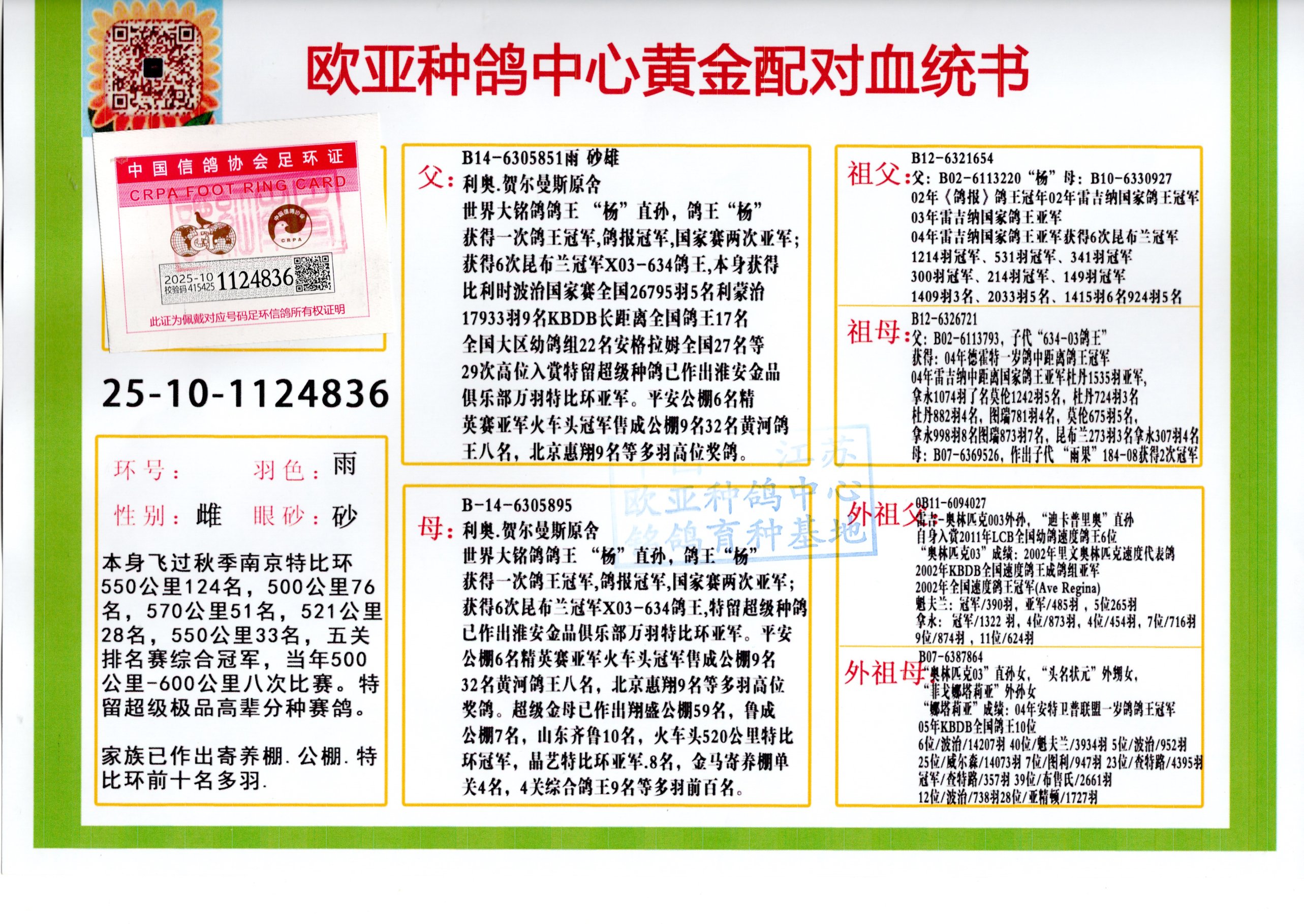24年秋南京特比环欧亚荣获大团体冠军.小团体冠军551公里大特比13名.14名.16名.19名.20名.21名.24名.26名.27名.28名.42名.52名.54名.57名.65名.66名.68名.70名.71名.72名.74名.76名.80名.82名.83名.84名.85名.86名.90名.92名.110名.116名.121名.122名.128名.131名.158名.161名.164名.165名.166名.172名.174名.177名.182名.195名.196名.201名.205名.208名.210名.216名.253名.269名.275名.276名.294名.296名.299名,,24年秋云南天南铜都公棚决赛415名.天南铜都小棚决赛409名.云南玉活公棚决赛102名.490名.团体32名上笼二羽进二羽,天南铜都大棚506公里决赛445名。热烈祝贺河北省巨鹿县李兰生老师用欧亚泰山号血系连续十一年夺冠军,河北省国家赛冠军.全国季军等多次前十名高位,扬州王军王总用欧亚利奥24年春季获山东翔宇公棚决赛33名盖比53名。南京刘正龙刘总用欧亚盖比获得24年秋山东潍坊国际公棚决赛42名.精英赛30名.三关鸽王71名.决赛86名.加站赛16名.南京市特比环A组鸽王9名.B组鸽王5名.6名.C组鸽王5名.精英赛冠军4名.技能赛A组冠军4名.5名.秦淮区特比环荣获15名.46名.48名.87名。四川西昌徐亮徐总用欧亚利奥获得凉山州聚友决赛177名.第二关亚军双关鸽王19名.三关鸽王105名.云南豪庭公棚决赛603名。热烈祝贺24年四川重庆翔园鸽舍用欧亚泰山号荣获春季400公里冠军.秋季500公里冠军,河北王总用詹森X利奥获得千羽千翔公棚400公里冠军,广东蔡楷焕荣获24年秋爱好者 赛鸽俱乐部三关鸽王季军.一关420公里99名.二关450公里11名.三关520公里32名.单关季军.7名.12名,江西李卫兴荣获贵州红枫公棚8名.共翔俱乐部寄养棚四关综合鸽王30名.一关400公里78名.二关500公里55名.三关520公里37名.四关500公里57名.同父母获公棚18名.雷鸣获得武汉黄浦育翔中心冠军,四川陈文获得四川明鸿俱乐部300公里梦幻2名.3名.4名.9名.10名.13名.14名.15名.31名.34名.40名.41名.42名.43名.69名.71名.72名.73名.74名.94名.95名.97名.98名.99名.419公里决赛荣获总冠军7名.总共归巢9羽,四川徐亮获豪庭决赛603名,山西郑勇获得山西泰鑫公棚决赛255名詹森红狐,热烈祝贺马总获得开尔(飞跃队)决赛9名获奖金1310000万元.第一关52名,天津津福资赛180公里96名.获奖金429543万元,欧亚支持全国鸽友24年秋多人报喜 祝大家取得更好成绩,给欧亚报喜鸽友欧亚决定给每人赠送一羽超级种鸽。欧亚俱乐部特比环多关鸽王成绩:15年秋淮安特比环黑色星期一全会上笼9700多羽,当天无鸽归巢,第二天全会归巢357羽,本舍归巢158羽.前十名八羽.前一百名归巢57羽,16年春季获五关鸽王总冠军,总亚军四名.六名.七名.九名.十名.晶艺俱乐部520公里冠亚季军5名.6名.7名.9名.11名等,火车头冠军.季军6名.8名.9名.10名,16年秋晶艺俱乐部特比环520公里亚军.季军4名.6名.7名.9名,15年春南京白下特比环冠军.亚军.季军6名.7名.8名.9名.10名.指定鸽A B组获得冠军.亚军.季军4名.5名.,17年淮安特比环亚军.4名.5名.7名.8名.10名.六关鸽王总冠军.4名.6名.9名.10名,寄养棚宿迁刘总20羽特比环获冠军.季军.4名.7名.8名.9名等。18年荣获万羽特比环六关鸽王总冠军.总亚军.总季军.6名.8名.十名.单关四羽冠军.二羽亚军.四羽季军.前十名27羽。19年秋万羽特比环六关鸽王总亚军.总季军.5名.8名等,单关二羽冠军.三羽亚军.一羽季军前十名31羽。20年秋淮安市鸽会四关特比环大赛风雨无阻鸽王亚军.鸽王六名,金品俱乐部万羽特比环六关鸽王总冠军,总亚军.四名.五名.六名.七名.八名.十名.前二百名鸽王35羽,单关冠亚季军前十名四十多羽,火车头五关鸽王季军.六名.八名.前二百名鸽王十七羽。20年春荣获淮安五区一市四关鸽王总冠军.亚军.四名.八名.九名。21年秋荣获金品万羽特比环大赛六关鸽王总亚军.总季军.四名.七名.九名.十名.单关冠亚军季军前十名三十多羽。火车头协会鸽王六名.七名.十名.单关前十名十七羽。22年秋荣获鸽王总冠军.总亚军.5名.7名.8名.9名.11名.单关冠亚季军前十名三十多羽,第一关单关前二百名四十多羽,第二关前二百名三十多羽,第三关前二百名四十多羽,第四关前二百名四十多羽,第五关前一百名53羽。23年秋荣获鸽王季军.五名.八名.十名.13名.17名.20名.27名等多羽鸽王.单关前十名二十多羽。公棚.寄养棚部分成绩:16年秋宁夏黄河公棚总冠军电脑戈马力指定通炮冠军,17年送八羽参赛获得鸽王八名进奖四名,支持韩总荣获八名。支持鸽友荣获宁夏中卫公棚决赛总冠军.精英赛冠军,支持18年宁夏黄河公棚决赛冠军詹森X泰山。安徽鼎博寄养棚院内外四关鸽王总冠军.鸽王十七名.三十七名同窝,鸽王39名.42名.58名.67名。18年山东公棚预赛冠军.决赛65名.送八羽进奖五羽.指定获奔驰汽车一辆。支持鸽友获得云南蓝云公棚冠军.盖比X佛卡门。支持鸽友荣获云南银集公棚决赛冠军 詹森427X520血系 速度赛6700羽冠军。17年荣获金马俱乐部寄养棚四关鸽王总冠军.季军.六名.八名.第一关冠军.亚军.季军四名.七名.十一名.金牌教练奖。支持鸽友18年北京费翔公棚预赛九名电脑X桑杰士,支持鸽友荣获陕西威力公棚决赛11名.内蒙古临河寄养棚四关鸽王六名.詹森配泰山,支持河北王总用欧亚詹森427配胡本喜获20年秋开尔青年棚季军。云南东荣公棚16年预赛冠军.决赛77名.17年决赛12名.詹森红狐X泰山,17年平安公棚决赛4名 詹森427。欧亚获得21年金母寄养棚第一关四名.第二关5名.第三关5名.6名.7名.10名.三关鸽王总冠军,四关鸽王14名.十羽鸽王。支持河