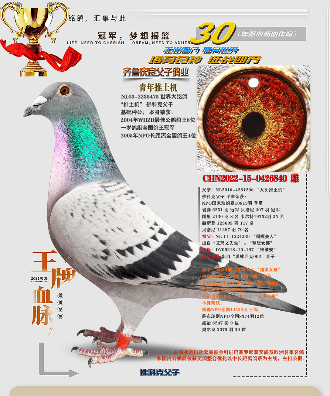 购得你家003血统鸽子今年在临河市1800特比环勇夺三关鸽王二十五名暗指二千五千共获奖金二十多万。地方大奖赛鸽王亚军四名十七名等谢谢刘总输出的好种鸽,鸽好人更好,祝刘总冠军多多,金钱多多。