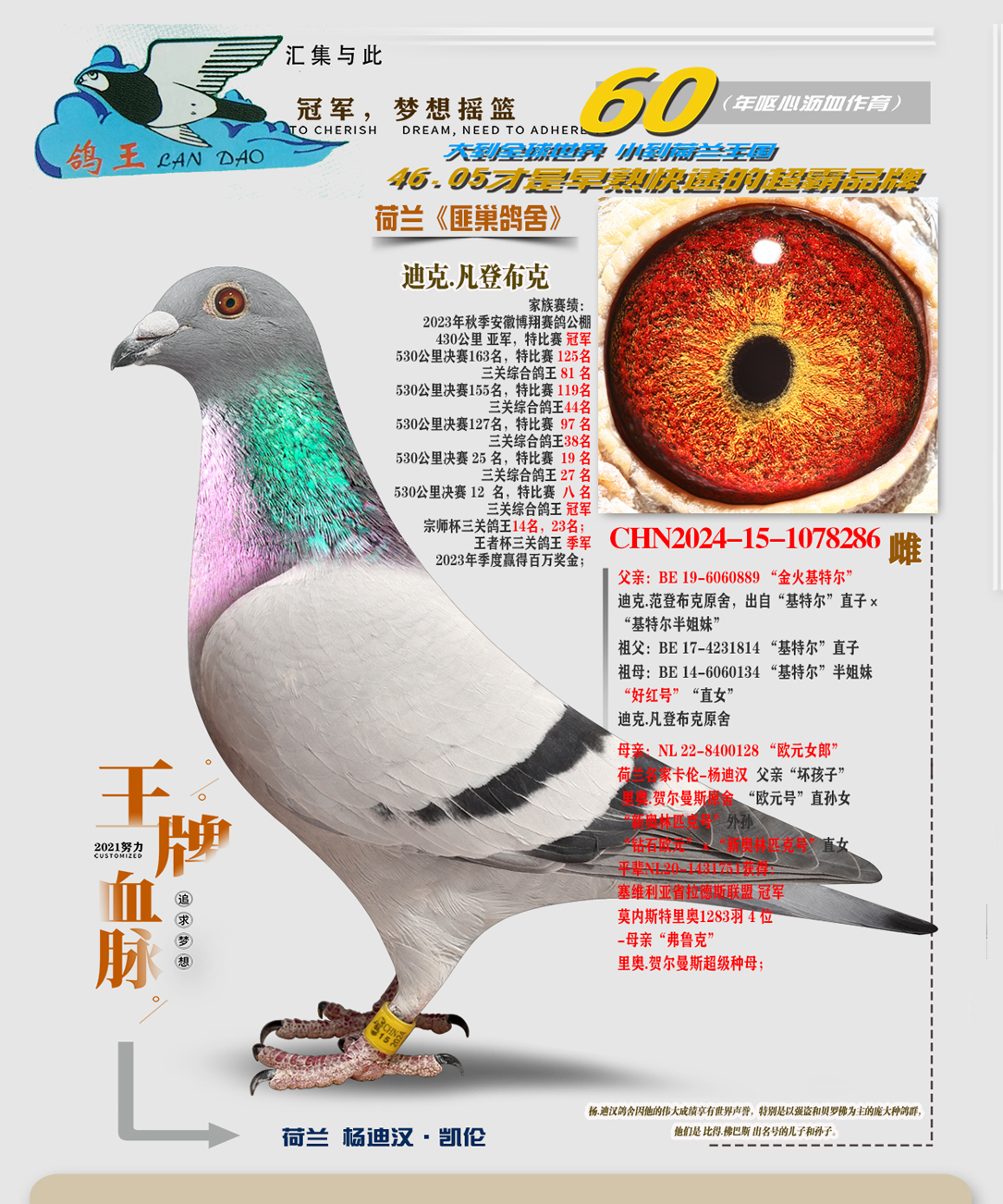 刘总你好!给报喜,我引进你的2016-32-0014055灰雄盖比闪电号近亲。它的直子2020-01-0840803灰。在2020年秋北京国信达公棚获得300公里冠军,500公里20名,双关鸽王,三关鸽王!通指。感谢您的支持!感谢您的优秀种鸽。