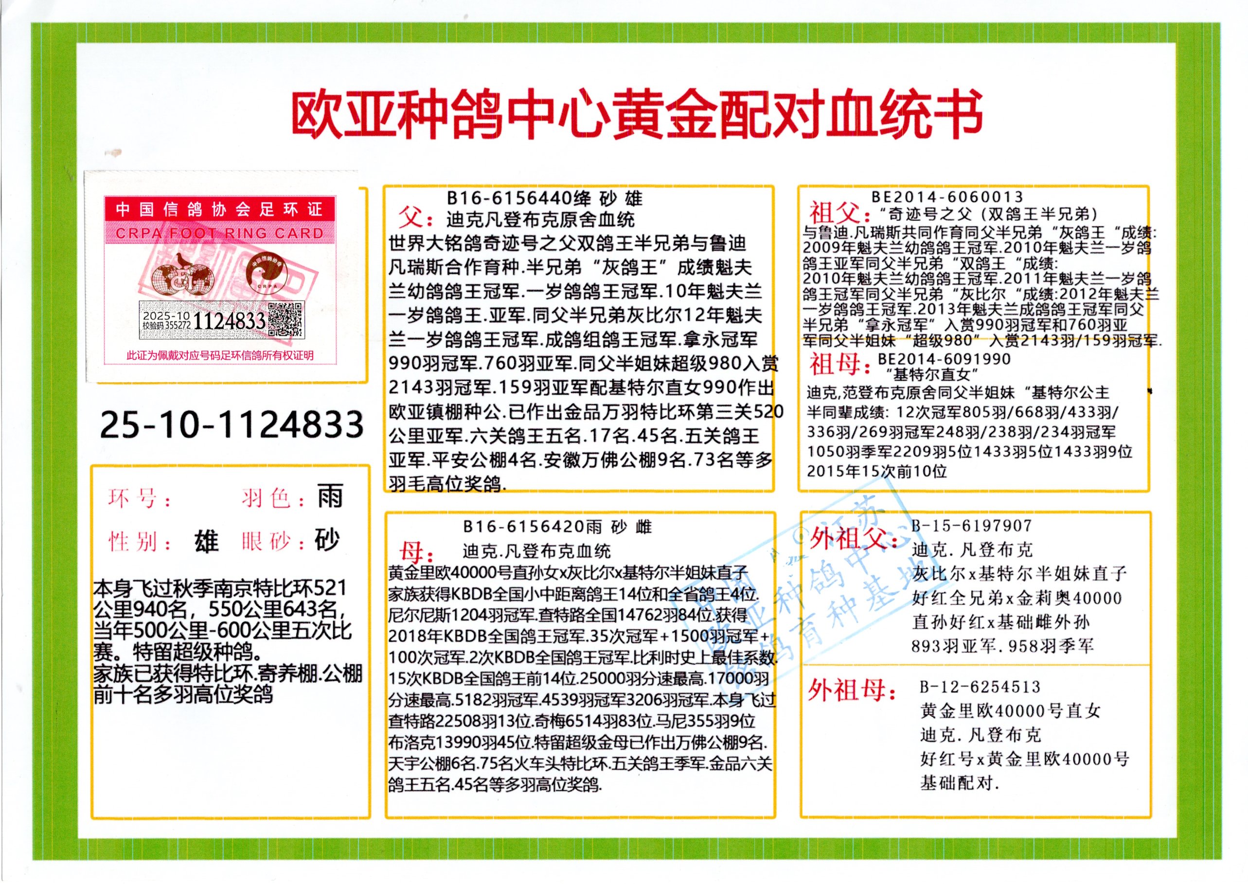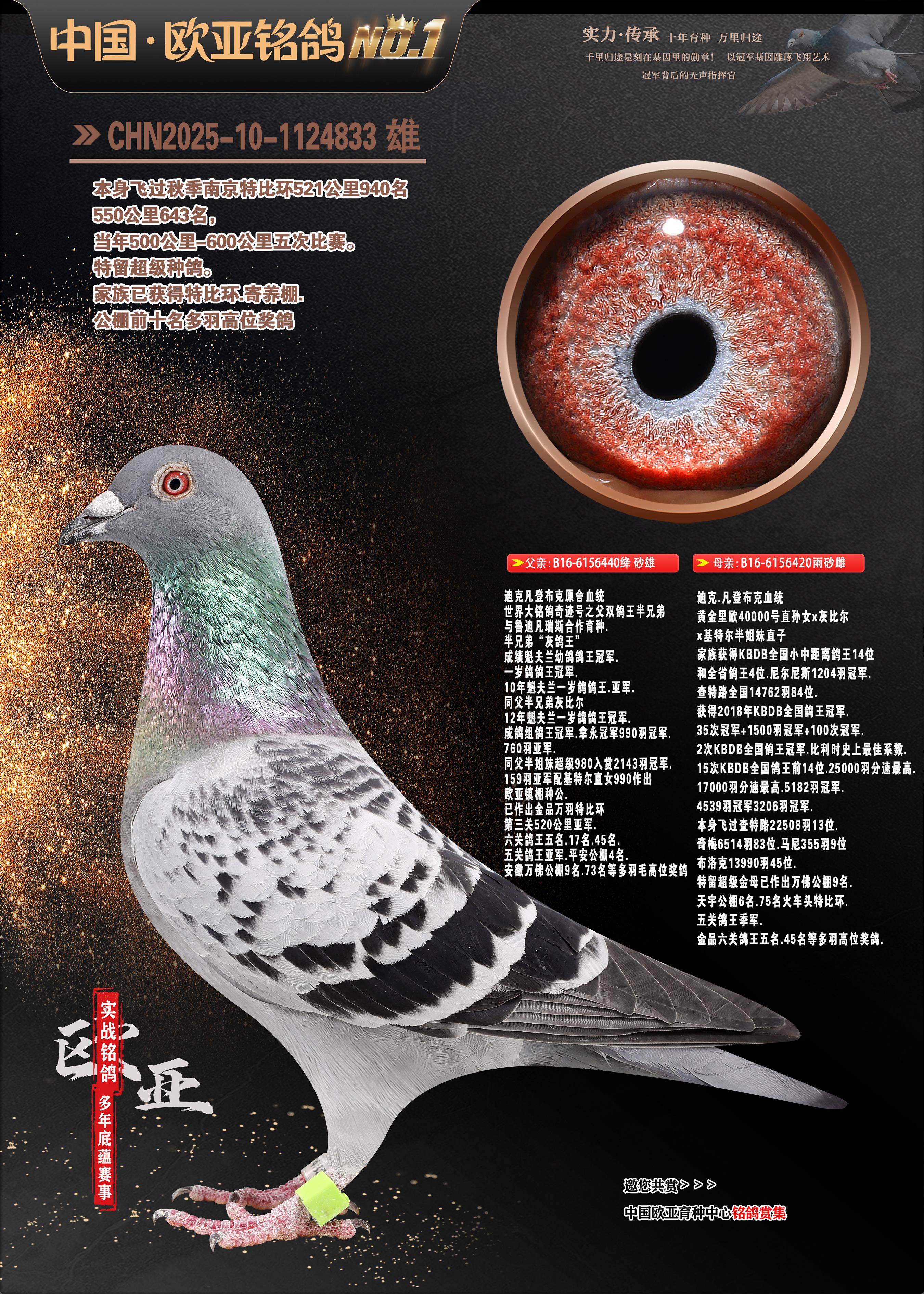 24年秋南京特比环欧亚荣获大团体冠军.小团体冠军551公里大特比13名.14名.16名.19名.20名.21名.24名.26名.27名.28名.42名.52名.54名.57名.65名.66名.68名.70名.71名.72名.74名.76名.80名.82名.83名.84名.85名.86名.90名.92名.110名.116名.121名.122名.128名.131名.158名.161名.164名.165名.166名.172名.174名.177名.182名.195名.196名.201名.205名.208名.210名.216名.253名.269名.275名.276名.294名.296名.299名,,24年秋云南天南铜都公棚决赛415名.天南铜都小棚决赛409名.云南玉活公棚决赛102名.490名.团体32名上笼二羽进二羽,天南铜都大棚506公里决赛445名。热烈祝贺河北省巨鹿县李兰生老师用欧亚泰山号血系连续十一年夺冠军,河北省国家赛冠军.全国季军等多次前十名高位,扬州王军王总用欧亚利奥24年春季获山东翔宇公棚决赛33名盖比53名。南京刘正龙刘总用欧亚盖比获得24年秋山东潍坊国际公棚决赛42名.精英赛30名.三关鸽王71名.决赛86名.加站赛16名.南京市特比环A组鸽王9名.B组鸽王5名.6名.C组鸽王5名.精英赛冠军4名.技能赛A组冠军4名.5名.秦淮区特比环荣获15名.46名.48名.87名。四川西昌徐亮徐总用欧亚利奥获得凉山州聚友决赛177名.第二关亚军双关鸽王19名.三关鸽王105名.云南豪庭公棚决赛603名。热烈祝贺24年四川重庆翔园鸽舍用欧亚泰山号荣获春季400公里冠军.秋季500公里冠军,河北王总用詹森X利奥获得千羽千翔公棚400公里冠军,广东蔡楷焕荣获24年秋爱好者 赛鸽俱乐部三关鸽王季军.一关420公里99名.二关450公里11名.三关520公里32名.单关季军.7名.12名,江西李卫兴荣获贵州红枫公棚8名.共翔俱乐部寄养棚四关综合鸽王30名.一关400公里78名.二关500公里55名.三关520公里37名.四关500公里57名.同父母获公棚18名.雷鸣获得武汉黄浦育翔中心冠军,四川陈文获得四川明鸿俱乐部300公里梦幻2名.3名.4名.9名.10名.13名.14名.15名.31名.34名.40名.41名.42名.43名.69名.71名.72名.73名.74名.94名.95名.97名.98名.99名.419公里决赛荣获总冠军7名.总共归巢9羽,四川徐亮获豪庭决赛603名,山西郑勇获得山西泰鑫公棚决赛255名詹森红狐,热烈祝贺马总获得开尔(飞跃队)决赛9名获奖金1310000万元.第一关52名,天津津福资赛180公里96名.获奖金429543万元,欧亚支持全国鸽友24年秋多人报喜 祝大家取得更好成绩,给欧亚报喜鸽友欧亚决定给每人赠送一羽超级种鸽。欧亚俱乐部特比环多关鸽王成绩:15年秋淮安特比环黑色星期一全会上笼9700多羽,当天无鸽归巢,第二天全会归巢357羽,本舍归巢158羽.前十名八羽.前一百名归巢57羽,16年春季获五关鸽王总冠军,总亚军四名.六名.七名.九名.十名.晶艺俱乐部520公里冠亚季军5名.6名.7名.9名.11名等,火车头冠军.季军6名.8名.9名.10名,16年秋晶艺俱乐部特比环520公里亚军.季军4名.6名.7名.9名,15年春南京白下特比环冠军.亚军.季军6名.7名.8名.9名.10名.指定鸽A B组获得冠军.亚军.季军4名.5名.,17年淮安特比环亚军.4名.5名.7名.8名.10名.六关鸽王总冠军.4名.6名.9名.10名,寄养棚宿迁刘总20羽特比环获冠军.季军.4名.7名.8名.9名等。18年荣获万羽特比环六关鸽王总冠军.总亚军.总季军.6名.8名.十名.单关四羽冠军.二羽亚军.四羽季军.前十名27羽。19年秋万羽特比环六关鸽王总亚军.总季军.5名.8名等,单关二羽冠军.三羽亚军.一羽季军前十名31羽。20年秋淮安市鸽会四关特比环大赛风雨无阻鸽王亚军.鸽王六名,金品俱乐部万羽特比环六关鸽王总冠军,总亚军.四名.五名.六名.七名.八名.十名.前二百名鸽王35羽,单关冠亚季军前十名四十多羽,火车头五关鸽王季军.六名.八名.前二百名鸽王十七羽。20年春荣获淮安五区一市四关鸽王总冠军.亚军.四名.八名.九名。21年秋荣获金品万羽特比环大赛六关鸽王总亚军.总季军.四名.七名.九名.十名.单关冠亚军季军前十名三十多羽。火车头协会鸽王六名.七名.十名.单关前十名十七羽。22年秋荣获鸽王总冠军.总亚军.5名.7名.8名.9名.11名.单关冠亚季军前十名三十多羽,第一关单关前二百名四十多羽,第二关前二百名三十多羽,第三关前二百名四十多羽,第四关前二百名四十多羽,第五关前一百名53羽。23年秋荣获鸽王季军.五名.八名.十名.13名.17名.20名.27名等多羽鸽王.单关前十名二十多羽。公棚.寄养棚部分成绩:16年秋宁夏黄河公棚总冠军电脑戈马力指定通炮冠军,17年送八羽参赛获得鸽王八名进奖四名,支持韩总荣获八名。支持鸽友荣获宁夏中卫公棚决赛总冠军.精英赛冠军,支持18年宁夏黄河公棚决赛冠军詹森X泰山。安徽鼎博寄养棚院内外四关鸽王总冠军.鸽王十七名.三十七名同窝,鸽王39名.42名.58名.67名。18年山东公棚预赛冠军.决赛65名.送八羽进奖五羽.指定获奔驰汽车一辆。支持鸽友获得云南蓝云公棚冠军.盖比X佛卡门。支持鸽友荣获云南银集公棚决赛冠军 詹森427X520血系 速度赛6700羽冠军。17年荣获金马俱乐部寄养棚四关鸽王总冠军.季军.六名.八名.第一关冠军.亚军.季军四名.七名.十一名.金牌教练奖。支持鸽友18年北京费翔公棚预赛九名电脑X桑杰士,支持鸽友荣获陕西威力公棚决赛11名.内蒙古临河寄养棚四关鸽王六名.詹森配泰山,支持河北王总用欧亚詹森427配胡本喜获20年秋开尔青年棚季军。云南东荣公棚16年预赛冠军.决赛77名.17年决赛12名.詹森红狐X泰山,17年平安公棚决赛4名 詹森427。欧亚获得21年金母寄养棚第一关四名.第二关5名.第三关5名.6名.7名.10名.三关鸽王总冠军,四关鸽王14名.十羽鸽王。支持河