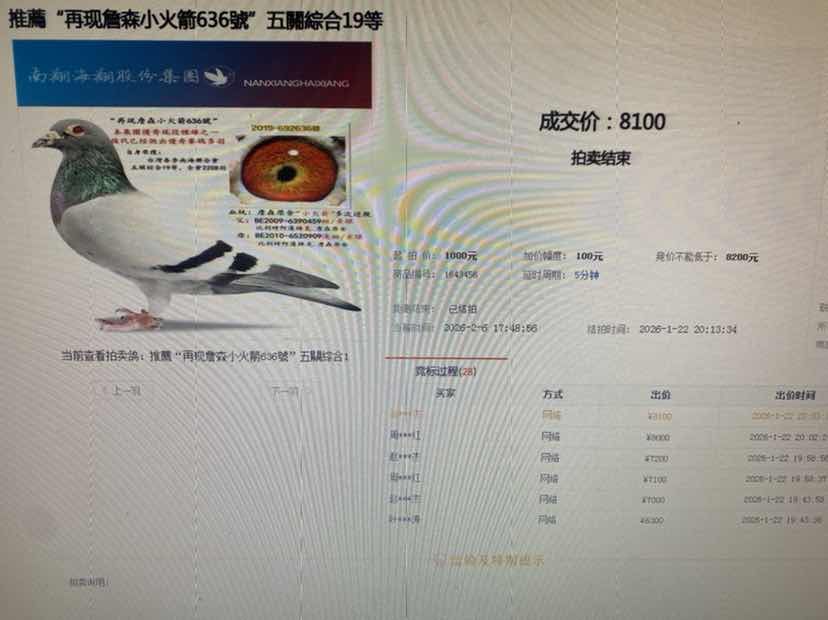 | 1649716 | 弃标鸽“詹森奶酪近親863近親044號”三關綜合25等 | ¥1000元 | 0次 |