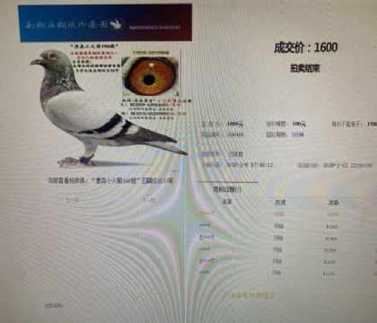 | 1649716 | 弃标鸽“詹森奶酪近親863近親044號”三關綜合25等 | ¥1000元 | 0次 |