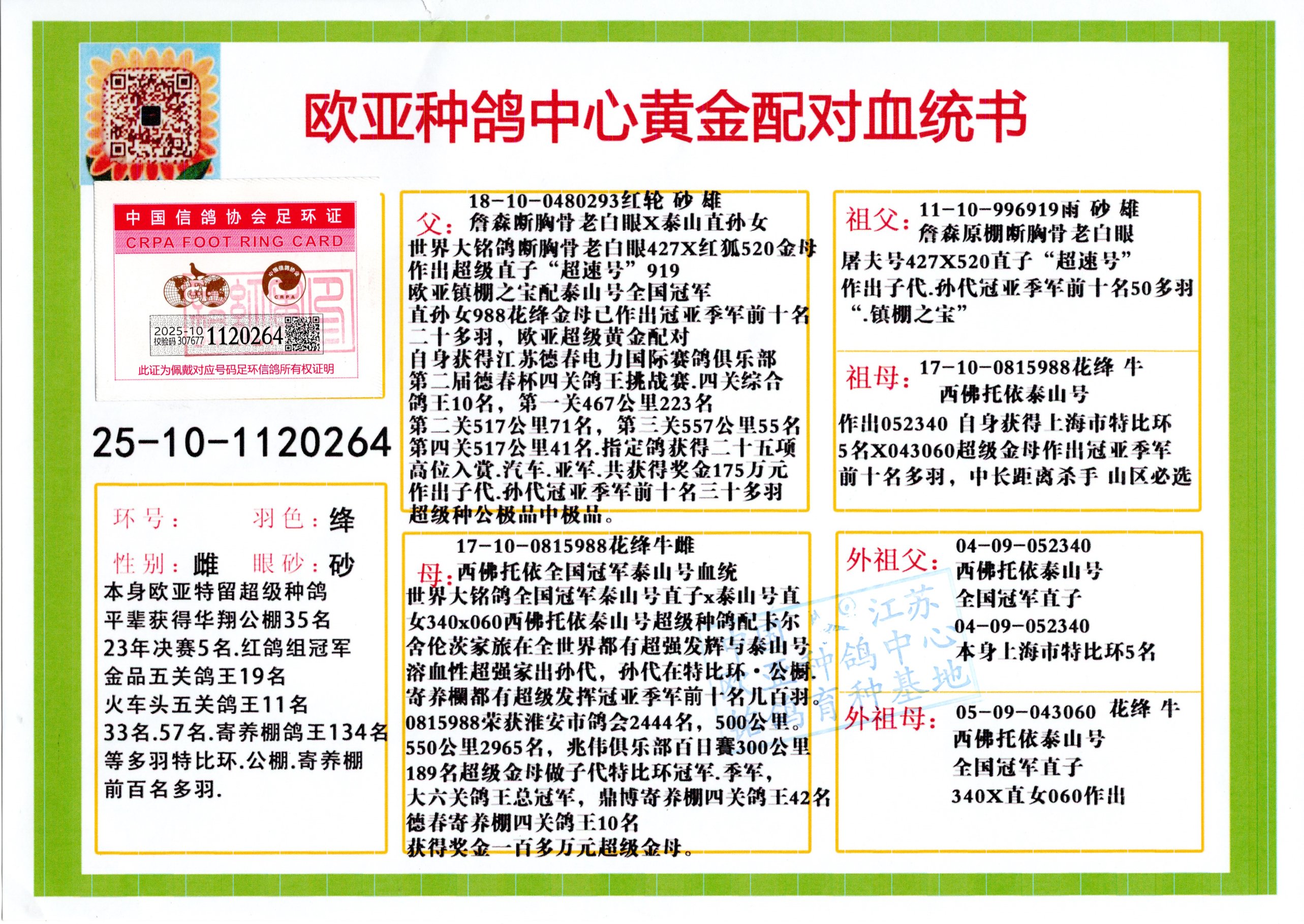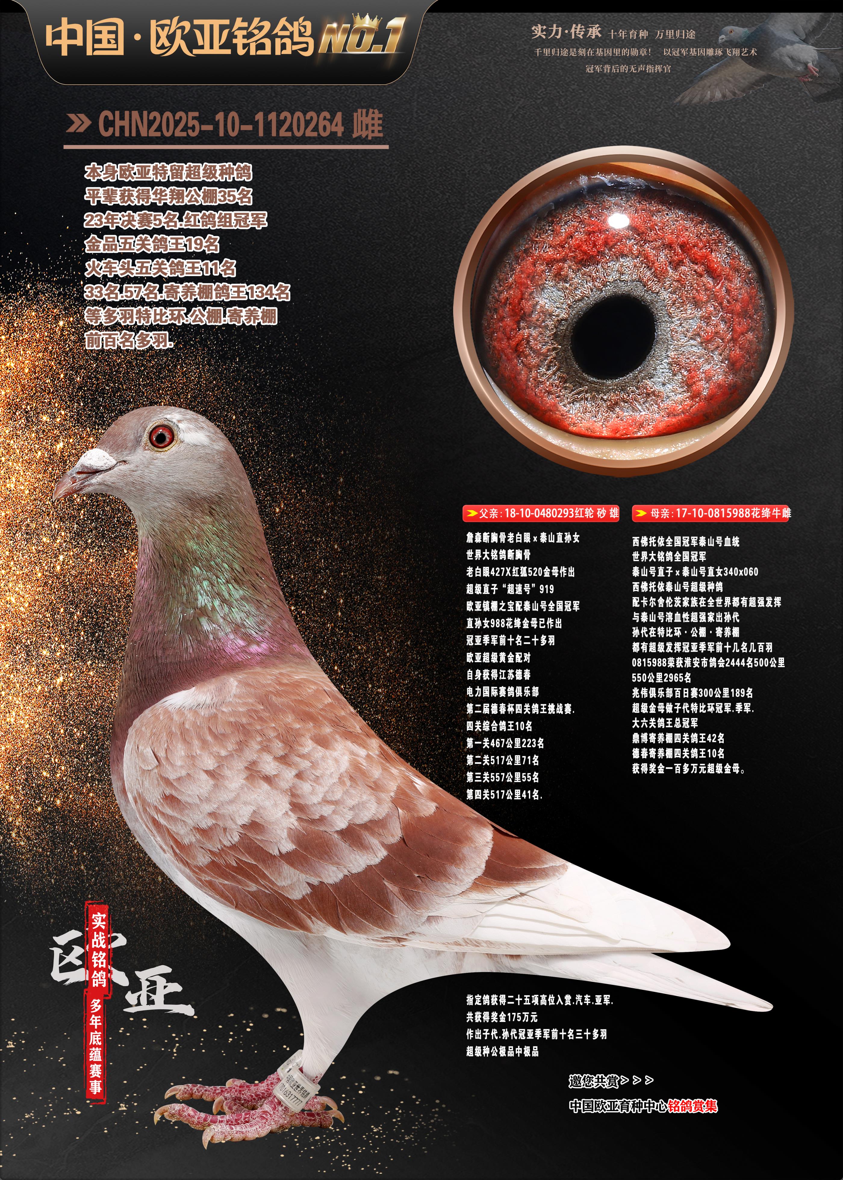 24年秋南京特比环欧亚荣获大团体冠军.小团体冠军551公里大特比13名.14名.16名.19名.20名.21名.24名.26名.27名.28名.42名.52名.54名.57名.65名.66名.68名.70名.71名.72名.74名.76名.80名.82名.83名.84名.85名.86名.90名.92名.110名.116名.121名.122名.128名.131名.158名.161名.164名.165名.166名.172名.174名.177名.182名.195名.196名.201名.205名.208名.210名.216名.253名.269名.275名.276名.294名.296名.299名,,24年秋云南天南铜都公棚决赛415名.天南铜都小棚决赛409名.云南玉活公棚决赛102名.490名.团体32名上笼二羽进二羽,天南铜都大棚506公里决赛445名。热烈祝贺河北省巨鹿县李兰生老师用欧亚泰山号血系连续十一年夺冠军,河北省国家赛冠军.全国季军等多次前十名高位,扬州王军王总用欧亚利奥24年春季获山东翔宇公棚决赛33名盖比53名。南京刘正龙刘总用欧亚盖比获得24年秋山东潍坊国际公棚决赛42名.精英赛30名.三关鸽王71名.决赛86名.加站赛16名.南京市特比环A组鸽王9名.B组鸽王5名.6名.C组鸽王5名.精英赛冠军4名.技能赛A组冠军4名.5名.秦淮区特比环荣获15名.46名.48名.87名。四川西昌徐亮徐总用欧亚利奥获得凉山州聚友决赛177名.第二关亚军双关鸽王19名.三关鸽王105名.云南豪庭公棚决赛603名。热烈祝贺24年四川重庆翔园鸽舍用欧亚泰山号荣获春季400公里冠军.秋季500公里冠军,河北王总用詹森X利奥获得千羽千翔公棚400公里冠军,广东蔡楷焕荣获24年秋爱好者 赛鸽俱乐部三关鸽王季军.一关420公里99名.二关450公里11名.三关520公里32名.单关季军.7名.12名,江西李卫兴荣获贵州红枫公棚8名.共翔俱乐部寄养棚四关综合鸽王30名.一关400公里78名.二关500公里55名.三关520公里37名.四关500公里57名.同父母获公棚18名.雷鸣获得武汉黄浦育翔中心冠军,四川陈文获得四川明鸿俱乐部300公里梦幻2名.3名.4名.9名.10名.13名.14名.15名.31名.34名.40名.41名.42名.43名.69名.71名.72名.73名.74名.94名.95名.97名.98名.99名.419公里决赛荣获总冠军7名.总共归巢9羽,四川徐亮获豪庭决赛603名,山西郑勇获得山西泰鑫公棚决赛255名詹森红狐,热烈祝贺马总获得开尔(飞跃队)决赛9名获奖金1310000万元.第一关52名,天津津福资赛180公里96名.获奖金429543万元,欧亚支持全国鸽友24年秋多人报喜 祝大家取得更好成绩,给欧亚报喜鸽友欧亚决定给每人赠送一羽超级种鸽。欧亚俱乐部特比环多关鸽王成绩:15年秋淮安特比环黑色星期一全会上笼9700多羽,当天无鸽归巢,第二天全会归巢357羽,本舍归巢158羽.前十名八羽.前一百名归巢57羽,16年春季获五关鸽王总冠军,总亚军四名.六名.七名.九名.十名.晶艺俱乐部520公里冠亚季军5名.6名.7名.9名.11名等,火车头冠军.季军6名.8名.9名.10名,16年秋晶艺俱乐部特比环520公里亚军.季军4名.6名.7名.9名,15年春南京白下特比环冠军.亚军.季军6名.7名.8名.9名.10名.指定鸽A B组获得冠军.亚军.季军4名.5名.,17年淮安特比环亚军.4名.5名.7名.8名.10名.六关鸽王总冠军.4名.6名.9名.10名,寄养棚宿迁刘总20羽特比环获冠军.季军.4名.7名.8名.9名等。18年荣获万羽特比环六关鸽王总冠军.总亚军.总季军.6名.8名.十名.单关四羽冠军.二羽亚军.四羽季军.前十名27羽。19年秋万羽特比环六关鸽王总亚军.总季军.5名.8名等,单关二羽冠军.三羽亚军.一羽季军前十名31羽。20年秋淮安市鸽会四关特比环大赛风雨无阻鸽王亚军.鸽王六名,金品俱乐部万羽特比环六关鸽王总冠军,总亚军.四名.五名.六名.七名.八名.十名.前二百名鸽王35羽,单关冠亚季军前十名四十多羽,火车头五关鸽王季军.六名.八名.前二百名鸽王十七羽。20年春荣获淮安五区一市四关鸽王总冠军.亚军.四名.八名.九名。21年秋荣获金品万羽特比环大赛六关鸽王总亚军.总季军.四名.七名.九名.十名.单关冠亚军季军前十名三十多羽。火车头协会鸽王六名.七名.十名.单关前十名十七羽。22年秋荣获鸽王总冠军.总亚军.5名.7名.8名.9名.11名.单关冠亚季军前十名三十多羽,第一关单关前二百名四十多羽,第二关前二百名三十多羽,第三关前二百名四十多羽,第四关前二百名四十多羽,第五关前一百名53羽。23年秋荣获鸽王季军.五名.八名.十名.13名.17名.20名.27名等多羽鸽王.单关前十名二十多羽。公棚.寄养棚部分成绩:16年秋宁夏黄河公棚总冠军电脑戈马力指定通炮冠军,17年送八羽参赛获得鸽王八名进奖四名,支持韩总荣获八名。支持鸽友荣获宁夏中卫公棚决赛总冠军.精英赛冠军,支持18年宁夏黄河公棚决赛冠军詹森X泰山。安徽鼎博寄养棚院内外四关鸽王总冠军.鸽王十七名.三十七名同窝,鸽王39名.42名.58名.67名。18年山东公棚预赛冠军.决赛65名.送八羽进奖五羽.指定获奔驰汽车一辆。支持鸽友获得云南蓝云公棚冠军.盖比X佛卡门。支持鸽友荣获云南银集公棚决赛冠军 詹森427X520血系 速度赛6700羽冠军。17年荣获金马俱乐部寄养棚四关鸽王总冠军.季军.六名.八名.第一关冠军.亚军.季军四名.七名.十一名.金牌教练奖。支持鸽友18年北京费翔公棚预赛九名电脑X桑杰士,支持鸽友荣获陕西威力公棚决赛11名.内蒙古临河寄养棚四关鸽王六名.詹森配泰山,支持河北王总用欧亚詹森427配胡本喜获20年秋开尔青年棚季军。云南东荣公棚16年预赛冠军.决赛77名.17年决赛12名.詹森红狐X泰山,17年平安公棚决赛4名 詹森427。欧亚获得21年金母寄养棚第一关四名.第二关5名.第三关5名.6名.7名.10名.三关鸽王总冠军,四关鸽王14名.十羽鸽王。支持河