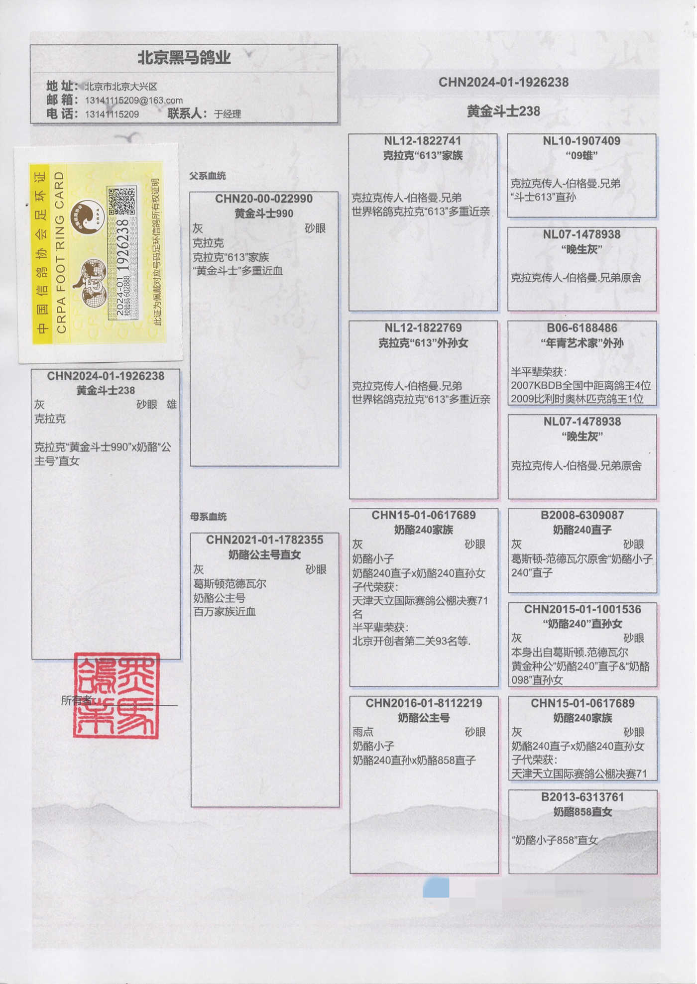 - 当前查看拍卖鸽:克拉克“黄金斗士” 传承238