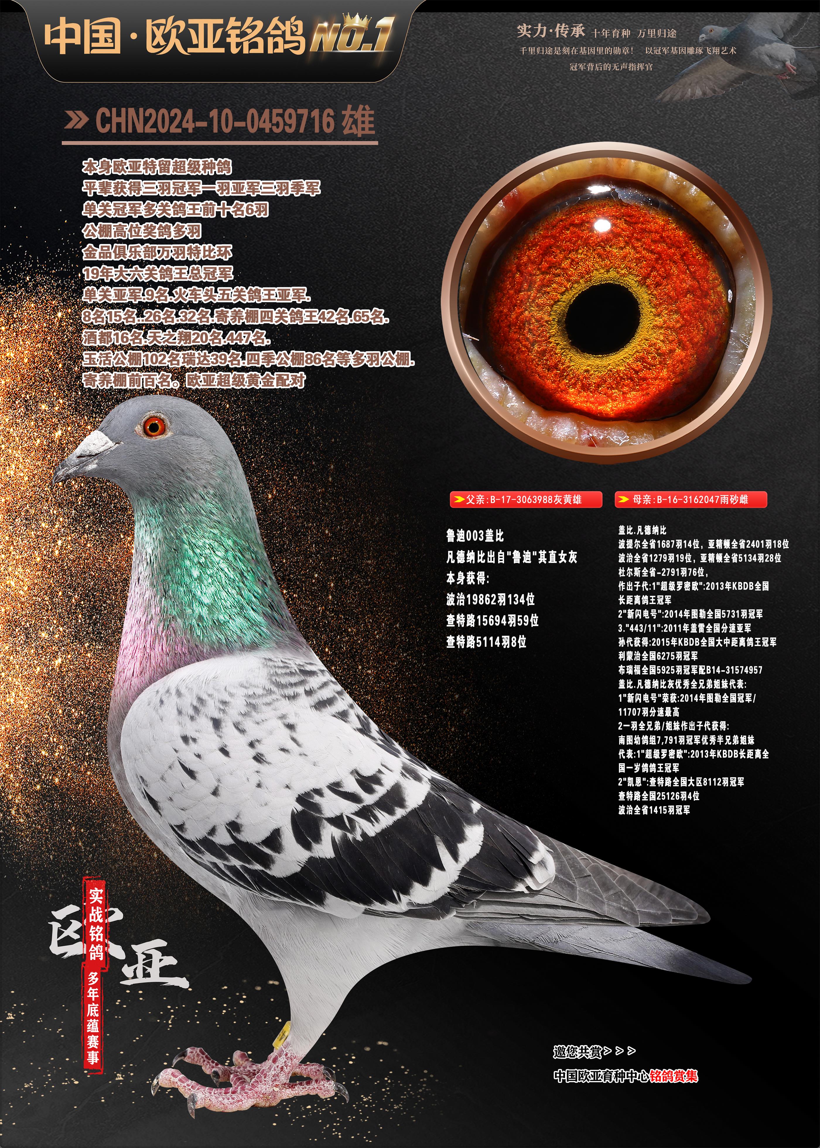 24年秋南京特比环欧亚荣获大团体冠军.小团体冠军551公里大特比13名.14名.16名.19名.20名.21名.24名.26名.27名.28名.42名.52名.54名.57名.65名.66名.68名.70名.71名.72名.74名.76名.80名.82名.83名.84名.85名.86名.90名.92名.110名.116名.121名.122名.128名.131名.158名.161名.164名.165名.166名.172名.174名.177名.182名.195名.196名.201名.205名.208名.210名.216名.253名.269名.275名.276名.294名.296名.299名,,24年秋云南天南铜都公棚决赛415名.天南铜都小棚决赛409名.云南玉活公棚决赛102名.490名.团体32名上笼二羽进二羽,天南铜都大棚506公里决赛445名。热烈祝贺河北省巨鹿县李兰生老师用欧亚泰山号血系连续十一年夺冠军,河北省国家赛冠军.全国季军等多次前十名高位,扬州王军王总用欧亚利奥24年春季获山东翔宇公棚决赛33名盖比53名。南京刘正龙刘总用欧亚盖比获得24年秋山东潍坊国际公棚决赛42名.精英赛30名.三关鸽王71名.决赛86名.加站赛16名.南京市特比环A组鸽王9名.B组鸽王5名.6名.C组鸽王5名.精英赛冠军4名.技能赛A组冠军4名.5名.秦淮区特比环荣获15名.46名.48名.87名。四川西昌徐亮徐总用欧亚利奥获得凉山州聚友决赛177名.第二关亚军双关鸽王19名.三关鸽王105名.云南豪庭公棚决赛603名。热烈祝贺24年四川重庆翔园鸽舍用欧亚泰山号荣获春季400公里冠军.秋季500公里冠军,河北王总用詹森X利奥获得千羽千翔公棚400公里冠军,广东蔡楷焕荣获24年秋爱好者 赛鸽俱乐部三关鸽王季军.一关420公里99名.二关450公里11名.三关520公里32名.单关季军.7名.12名,江西李卫兴荣获贵州红枫公棚8名.共翔俱乐部寄养棚四关综合鸽王30名.一关400公里78名.二关500公里55名.三关520公里37名.四关500公里57名.同父母获公棚18名.雷鸣获得武汉黄浦育翔中心冠军,四川陈文获得四川明鸿俱乐部300公里梦幻2名.3名.4名.9名.10名.13名.14名.15名.31名.34名.40名.41名.42名.43名.69名.71名.72名.73名.74名.94名.95名.97名.98名.99名.419公里决赛荣获总冠军7名.总共归巢9羽,四川徐亮获豪庭决赛603名,山西郑勇获得山西泰鑫公棚决赛255名詹森红狐,热烈祝贺马总获得开尔(飞跃队)决赛9名获奖金1310000万元.第一关52名,天津津福资赛180公里96名.获奖金429543万元,欧亚支持全国鸽友24年秋多人报喜 祝大家取得更好成绩,给欧亚报喜鸽友欧亚决定给每人赠送一羽超级种鸽。欧亚俱乐部特比环多关鸽王成绩:15年秋淮安特比环黑色星期一全会上笼9700多羽,当天无鸽归巢,第二天全会归巢357羽,本舍归巢158羽.前十名八羽.前一百名归巢57羽,16年春季获五关鸽王总冠军,总亚军四名.六名.七名.九名.十名.晶艺俱乐部520公里冠亚季军5名.6名.7名.9名.11名等,火车头冠军.季军6名.8名.9名.10名,16年秋晶艺俱乐部特比环520公里亚军.季军4名.6名.7名.9名,15年春南京白下特比环冠军.亚军.季军6名.7名.8名.9名.10名.指定鸽A B组获得冠军.亚军.季军4名.5名.,17年淮安特比环亚军.4名.5名.7名.8名.10名.六关鸽王总冠军.4名.6名.9名.10名,寄养棚宿迁刘总20羽特比环获冠军.季军.4名.7名.8名.9名等。18年荣获万羽特比环六关鸽王总冠军.总亚军.总季军.6名.8名.十名.单关四羽冠军.二羽亚军.四羽季军.前十名27羽。19年秋万羽特比环六关鸽王总亚军.总季军.5名.8名等,单关二羽冠军.三羽亚军.一羽季军前十名31羽。20年秋淮安市鸽会四关特比环大赛风雨无阻鸽王亚军.鸽王六名,金品俱乐部万羽特比环六关鸽王总冠军,总亚军.四名.五名.六名.七名.八名.十名.前二百名鸽王35羽,单关冠亚季军前十名四十多羽,火车头五关鸽王季军.六名.八名.前二百名鸽王十七羽。20年春荣获淮安五区一市四关鸽王总冠军.亚军.四名.八名.九名。21年秋荣获金品万羽特比环大赛六关鸽王总亚军.总季军.四名.七名.九名.十名.单关冠亚军季军前十名三十多羽。火车头协会鸽王六名.七名.十名.单关前十名十七羽。22年秋荣获鸽王总冠军.总亚军.5名.7名.8名.9名.11名.单关冠亚季军前十名三十多羽,第一关单关前二百名四十多羽,第二关前二百名三十多羽,第三关前二百名四十多羽,第四关前二百名四十多羽,第五关前一百名53羽。23年秋荣获鸽王季军.五名.八名.十名.13名.17名.20名.27名等多羽鸽王.单关前十名二十多羽。公棚.寄养棚部分成绩:16年秋宁夏黄河公棚总冠军电脑戈马力指定通炮冠军,17年送八羽参赛获得鸽王八名进奖四名,支持韩总荣获八名。支持鸽友荣获宁夏中卫公棚决赛总冠军.精英赛冠军,支持18年宁夏黄河公棚决赛冠军詹森X泰山。安徽鼎博寄养棚院内外四关鸽王总冠军.鸽王十七名.三十七名同窝,鸽王39名.42名.58名.67名。18年山东公棚预赛冠军.决赛65名.送八羽进奖五羽.指定获奔驰汽车一辆。支持鸽友获得云南蓝云公棚冠军.盖比X佛卡门。支持鸽友荣获云南银集公棚决赛冠军 詹森427X520血系 速度赛6700羽冠军。17年荣获金马俱乐部寄养棚四关鸽王总冠军.季军.六名.八名.第一关冠军.亚军.季军四名.七名.十一名.金牌教练奖。支持鸽友18年北京费翔公棚预赛九名电脑X桑杰士,支持鸽友荣获陕西威力公棚决赛11名.内蒙古临河寄养棚四关鸽王六名.詹森配泰山,支持河北王总用欧亚詹森427配胡本喜获20年秋开尔青年棚季军。云南东荣公棚16年预赛冠军.决赛77名.17年决赛12名.詹森红狐X泰山,17年平安公棚决赛4名 詹森427。欧亚获得21年金母寄养棚第一关四名.第二关5名.第三关5名.6名.7名.10名.三关鸽王总冠军,四关鸽王14名.十羽鸽王。支持河