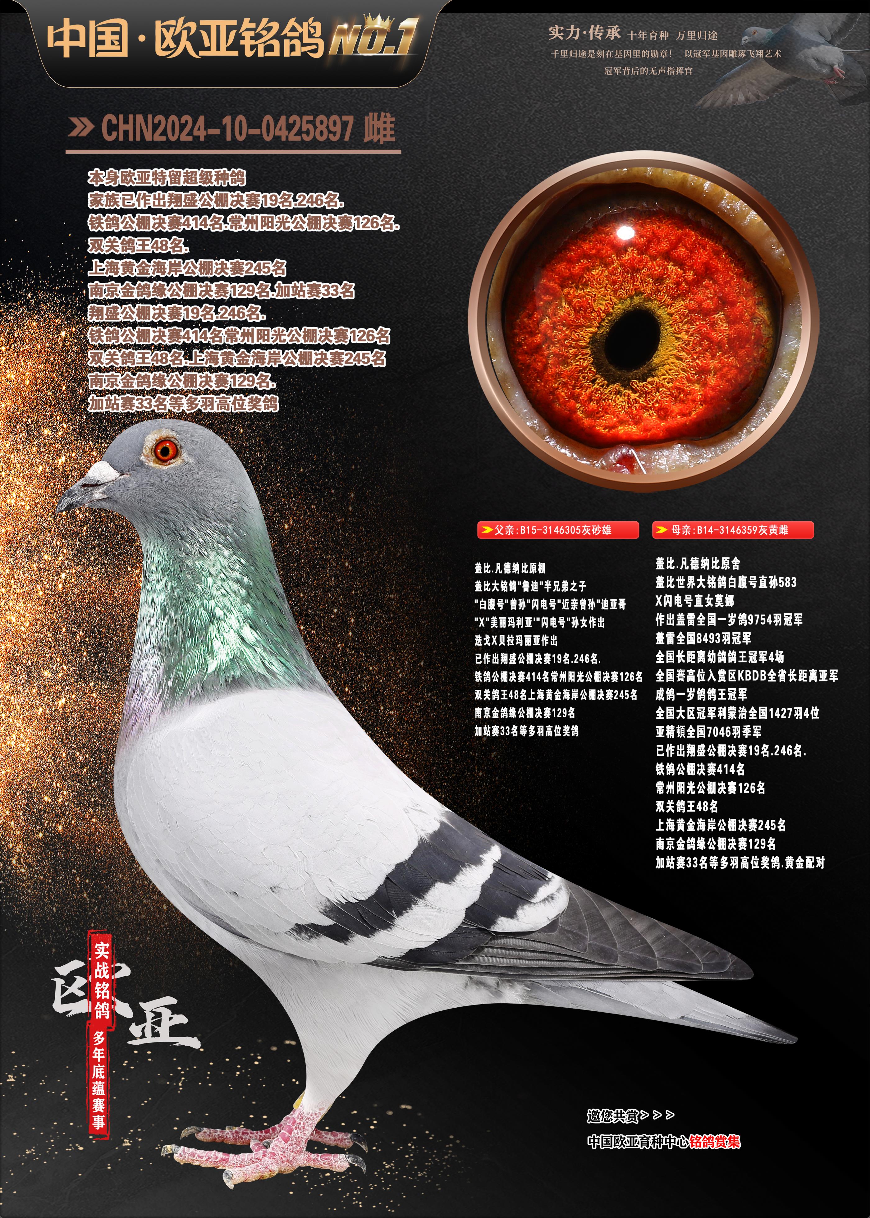 24年秋南京特比环欧亚荣获大团体冠军.小团体冠军551公里大特比13名.14名.16名.19名.20名.21名.24名.26名.27名.28名.42名.52名.54名.57名.65名.66名.68名.70名.71名.72名.74名.76名.80名.82名.83名.84名.85名.86名.90名.92名.110名.116名.121名.122名.128名.131名.158名.161名.164名.165名.166名.172名.174名.177名.182名.195名.196名.201名.205名.208名.210名.216名.253名.269名.275名.276名.294名.296名.299名,,24年秋云南天南铜都公棚决赛415名.天南铜都小棚决赛409名.云南玉活公棚决赛102名.490名.团体32名上笼二羽进二羽,天南铜都大棚506公里决赛445名。热烈祝贺河北省巨鹿县李兰生老师用欧亚泰山号血系连续十一年夺冠军,河北省国家赛冠军.全国季军等多次前十名高位,扬州王军王总用欧亚利奥24年春季获山东翔宇公棚决赛33名盖比53名。南京刘正龙刘总用欧亚盖比获得24年秋山东潍坊国际公棚决赛42名.精英赛30名.三关鸽王71名.决赛86名.加站赛16名.南京市特比环A组鸽王9名.B组鸽王5名.6名.C组鸽王5名.精英赛冠军4名.技能赛A组冠军4名.5名.秦淮区特比环荣获15名.46名.48名.87名。四川西昌徐亮徐总用欧亚利奥获得凉山州聚友决赛177名.第二关亚军双关鸽王19名.三关鸽王105名.云南豪庭公棚决赛603名。热烈祝贺24年四川重庆翔园鸽舍用欧亚泰山号荣获春季400公里冠军.秋季500公里冠军,河北王总用詹森X利奥获得千羽千翔公棚400公里冠军,广东蔡楷焕荣获24年秋爱好者 赛鸽俱乐部三关鸽王季军.一关420公里99名.二关450公里11名.三关520公里32名.单关季军.7名.12名,江西李卫兴荣获贵州红枫公棚8名.共翔俱乐部寄养棚四关综合鸽王30名.一关400公里78名.二关500公里55名.三关520公里37名.四关500公里57名.同父母获公棚18名.雷鸣获得武汉黄浦育翔中心冠军,四川陈文获得四川明鸿俱乐部300公里梦幻2名.3名.4名.9名.10名.13名.14名.15名.31名.34名.40名.41名.42名.43名.69名.71名.72名.73名.74名.94名.95名.97名.98名.99名.419公里决赛荣获总冠军7名.总共归巢9羽,四川徐亮获豪庭决赛603名,山西郑勇获得山西泰鑫公棚决赛255名詹森红狐,热烈祝贺马总获得开尔(飞跃队)决赛9名获奖金1310000万元.第一关52名,天津津福资赛180公里96名.获奖金429543万元,欧亚支持全国鸽友24年秋多人报喜 祝大家取得更好成绩,给欧亚报喜鸽友欧亚决定给每人赠送一羽超级种鸽。欧亚俱乐部特比环多关鸽王成绩:15年秋淮安特比环黑色星期一全会上笼9700多羽,当天无鸽归巢,第二天全会归巢357羽,本舍归巢158羽.前十名八羽.前一百名归巢57羽,16年春季获五关鸽王总冠军,总亚军四名.六名.七名.九名.十名.晶艺俱乐部520公里冠亚季军5名.6名.7名.9名.11名等,火车头冠军.季军6名.8名.9名.10名,16年秋晶艺俱乐部特比环520公里亚军.季军4名.6名.7名.9名,15年春南京白下特比环冠军.亚军.季军6名.7名.8名.9名.10名.指定鸽A B组获得冠军.亚军.季军4名.5名.,17年淮安特比环亚军.4名.5名.7名.8名.10名.六关鸽王总冠军.4名.6名.9名.10名,寄养棚宿迁刘总20羽特比环获冠军.季军.4名.7名.8名.9名等。18年荣获万羽特比环六关鸽王总冠军.总亚军.总季军.6名.8名.十名.单关四羽冠军.二羽亚军.四羽季军.前十名27羽。19年秋万羽特比环六关鸽王总亚军.总季军.5名.8名等,单关二羽冠军.三羽亚军.一羽季军前十名31羽。20年秋淮安市鸽会四关特比环大赛风雨无阻鸽王亚军.鸽王六名,金品俱乐部万羽特比环六关鸽王总冠军,总亚军.四名.五名.六名.七名.八名.十名.前二百名鸽王35羽,单关冠亚季军前十名四十多羽,火车头五关鸽王季军.六名.八名.前二百名鸽王十七羽。20年春荣获淮安五区一市四关鸽王总冠军.亚军.四名.八名.九名。21年秋荣获金品万羽特比环大赛六关鸽王总亚军.总季军.四名.七名.九名.十名.单关冠亚军季军前十名三十多羽。火车头协会鸽王六名.七名.十名.单关前十名十七羽。22年秋荣获鸽王总冠军.总亚军.5名.7名.8名.9名.11名.单关冠亚季军前十名三十多羽,第一关单关前二百名四十多羽,第二关前二百名三十多羽,第三关前二百名四十多羽,第四关前二百名四十多羽,第五关前一百名53羽。23年秋荣获鸽王季军.五名.八名.十名.13名.17名.20名.27名等多羽鸽王.单关前十名二十多羽。公棚.寄养棚部分成绩:16年秋宁夏黄河公棚总冠军电脑戈马力指定通炮冠军,17年送八羽参赛获得鸽王八名进奖四名,支持韩总荣获八名。支持鸽友荣获宁夏中卫公棚决赛总冠军.精英赛冠军,支持18年宁夏黄河公棚决赛冠军詹森X泰山。安徽鼎博寄养棚院内外四关鸽王总冠军.鸽王十七名.三十七名同窝,鸽王39名.42名.58名.67名。18年山东公棚预赛冠军.决赛65名.送八羽进奖五羽.指定获奔驰汽车一辆。支持鸽友获得云南蓝云公棚冠军.盖比X佛卡门。支持鸽友荣获云南银集公棚决赛冠军 詹森427X520血系 速度赛6700羽冠军。17年荣获金马俱乐部寄养棚四关鸽王总冠军.季军.六名.八名.第一关冠军.亚军.季军四名.七名.十一名.金牌教练奖。支持鸽友18年北京费翔公棚预赛九名电脑X桑杰士,支持鸽友荣获陕西威力公棚决赛11名.内蒙古临河寄养棚四关鸽王六名.詹森配泰山,支持河北王总用欧亚詹森427配胡本喜获20年秋开尔青年棚季军。云南东荣公棚16年预赛冠军.决赛77名.17年决赛12名.詹森红狐X泰山,17年平安公棚决赛4名 詹森427。欧亚获得21年金母寄养棚第一关四名.第二关5名.第三关5名.6名.7名.10名.三关鸽王总冠军,四关鸽王14名.十羽鸽王。支持河