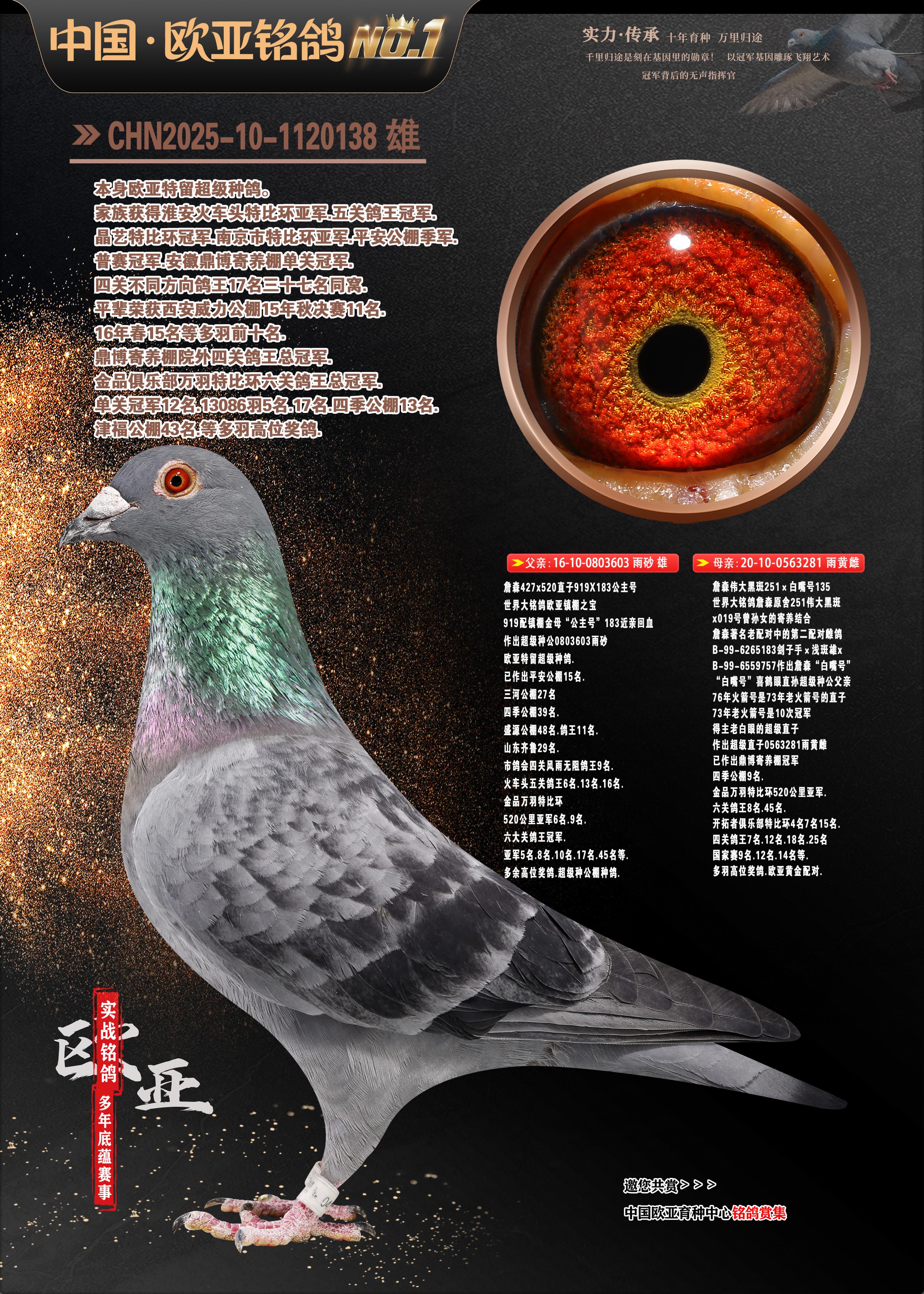 24年秋南京特比环欧亚荣获大团体冠军.小团体冠军551公里大特比13名.14名.16名.19名.20名.21名.24名.26名.27名.28名.42名.52名.54名.57名.65名.66名.68名.70名.71名.72名.74名.76名.80名.82名.83名.84名.85名.86名.90名.92名.110名.116名.121名.122名.128名.131名.158名.161名.164名.165名.166名.172名.174名.177名.182名.195名.196名.201名.205名.208名.210名.216名.253名.269名.275名.276名.294名.296名.299名,,24年秋云南天南铜都公棚决赛415名.天南铜都小棚决赛409名.云南玉活公棚决赛102名.490名.团体32名上笼二羽进二羽,天南铜都大棚506公里决赛445名。热烈祝贺河北省巨鹿县李兰生老师用欧亚泰山号血系连续十一年夺冠军,河北省国家赛冠军.全国季军等多次前十名高位,扬州王军王总用欧亚利奥24年春季获山东翔宇公棚决赛33名盖比53名。南京刘正龙刘总用欧亚盖比获得24年秋山东潍坊国际公棚决赛42名.精英赛30名.三关鸽王71名.决赛86名.加站赛16名.南京市特比环A组鸽王9名.B组鸽王5名.6名.C组鸽王5名.精英赛冠军4名.技能赛A组冠军4名.5名.秦淮区特比环荣获15名.46名.48名.87名。四川西昌徐亮徐总用欧亚利奥获得凉山州聚友决赛177名.第二关亚军双关鸽王19名.三关鸽王105名.云南豪庭公棚决赛603名。热烈祝贺24年四川重庆翔园鸽舍用欧亚泰山号荣获春季400公里冠军.秋季500公里冠军,河北王总用詹森X利奥获得千羽千翔公棚400公里冠军,广东蔡楷焕荣获24年秋爱好者 赛鸽俱乐部三关鸽王季军.一关420公里99名.二关450公里11名.三关520公里32名.单关季军.7名.12名,江西李卫兴荣获贵州红枫公棚8名.共翔俱乐部寄养棚四关综合鸽王30名.一关400公里78名.二关500公里55名.三关520公里37名.四关500公里57名.同父母获公棚18名.雷鸣获得武汉黄浦育翔中心冠军,四川陈文获得四川明鸿俱乐部300公里梦幻2名.3名.4名.9名.10名.13名.14名.15名.31名.34名.40名.41名.42名.43名.69名.71名.72名.73名.74名.94名.95名.97名.98名.99名.419公里决赛荣获总冠军7名.总共归巢9羽,四川徐亮获豪庭决赛603名,山西郑勇获得山西泰鑫公棚决赛255名詹森红狐,热烈祝贺马总获得开尔(飞跃队)决赛9名获奖金1310000万元.第一关52名,天津津福资赛180公里96名.获奖金429543万元,欧亚支持全国鸽友24年秋多人报喜 祝大家取得更好成绩,给欧亚报喜鸽友欧亚决定给每人赠送一羽超级种鸽。欧亚俱乐部特比环多关鸽王成绩:15年秋淮安特比环黑色星期一全会上笼9700多羽,当天无鸽归巢,第二天全会归巢357羽,本舍归巢158羽.前十名八羽.前一百名归巢57羽,16年春季获五关鸽王总冠军,总亚军四名.六名.七名.九名.十名.晶艺俱乐部520公里冠亚季军5名.6名.7名.9名.11名等,火车头冠军.季军6名.8名.9名.10名,16年秋晶艺俱乐部特比环520公里亚军.季军4名.6名.7名.9名,15年春南京白下特比环冠军.亚军.季军6名.7名.8名.9名.10名.指定鸽A B组获得冠军.亚军.季军4名.5名.,17年淮安特比环亚军.4名.5名.7名.8名.10名.六关鸽王总冠军.4名.6名.9名.10名,寄养棚宿迁刘总20羽特比环获冠军.季军.4名.7名.8名.9名等。18年荣获万羽特比环六关鸽王总冠军.总亚军.总季军.6名.8名.十名.单关四羽冠军.二羽亚军.四羽季军.前十名27羽。19年秋万羽特比环六关鸽王总亚军.总季军.5名.8名等,单关二羽冠军.三羽亚军.一羽季军前十名31羽。20年秋淮安市鸽会四关特比环大赛风雨无阻鸽王亚军.鸽王六名,金品俱乐部万羽特比环六关鸽王总冠军,总亚军.四名.五名.六名.七名.八名.十名.前二百名鸽王35羽,单关冠亚季军前十名四十多羽,火车头五关鸽王季军.六名.八名.前二百名鸽王十七羽。20年春荣获淮安五区一市四关鸽王总冠军.亚军.四名.八名.九名。21年秋荣获金品万羽特比环大赛六关鸽王总亚军.总季军.四名.七名.九名.十名.单关冠亚军季军前十名三十多羽。火车头协会鸽王六名.七名.十名.单关前十名十七羽。22年秋荣获鸽王总冠军.总亚军.5名.7名.8名.9名.11名.单关冠亚季军前十名三十多羽,第一关单关前二百名四十多羽,第二关前二百名三十多羽,第三关前二百名四十多羽,第四关前二百名四十多羽,第五关前一百名53羽。23年秋荣获鸽王季军.五名.八名.十名.13名.17名.20名.27名等多羽鸽王.单关前十名二十多羽。公棚.寄养棚部分成绩:16年秋宁夏黄河公棚总冠军电脑戈马力指定通炮冠军,17年送八羽参赛获得鸽王八名进奖四名,支持韩总荣获八名。支持鸽友荣获宁夏中卫公棚决赛总冠军.精英赛冠军,支持18年宁夏黄河公棚决赛冠军詹森X泰山。安徽鼎博寄养棚院内外四关鸽王总冠军.鸽王十七名.三十七名同窝,鸽王39名.42名.58名.67名。18年山东公棚预赛冠军.决赛65名.送八羽进奖五羽.指定获奔驰汽车一辆。支持鸽友获得云南蓝云公棚冠军.盖比X佛卡门。支持鸽友荣获云南银集公棚决赛冠军 詹森427X520血系 速度赛6700羽冠军。17年荣获金马俱乐部寄养棚四关鸽王总冠军.季军.六名.八名.第一关冠军.亚军.季军四名.七名.十一名.金牌教练奖。支持鸽友18年北京费翔公棚预赛九名电脑X桑杰士,支持鸽友荣获陕西威力公棚决赛11名.内蒙古临河寄养棚四关鸽王六名.詹森配泰山,支持河北王总用欧亚詹森427配胡本喜获20年秋开尔青年棚季军。云南东荣公棚16年预赛冠军.决赛77名.17年决赛12名.詹森红狐X泰山,17年平安公棚决赛4名 詹森427。欧亚获得21年金母寄养棚第一关四名.第二关5名.第三关5名.6名.7名.10名.三关鸽王总冠军,四关鸽王14名.十羽鸽王。支持河