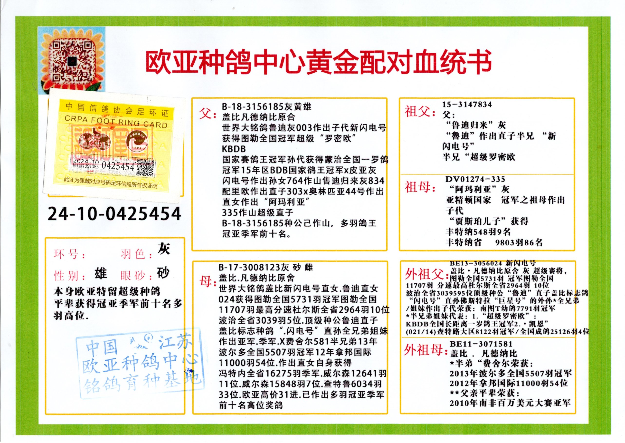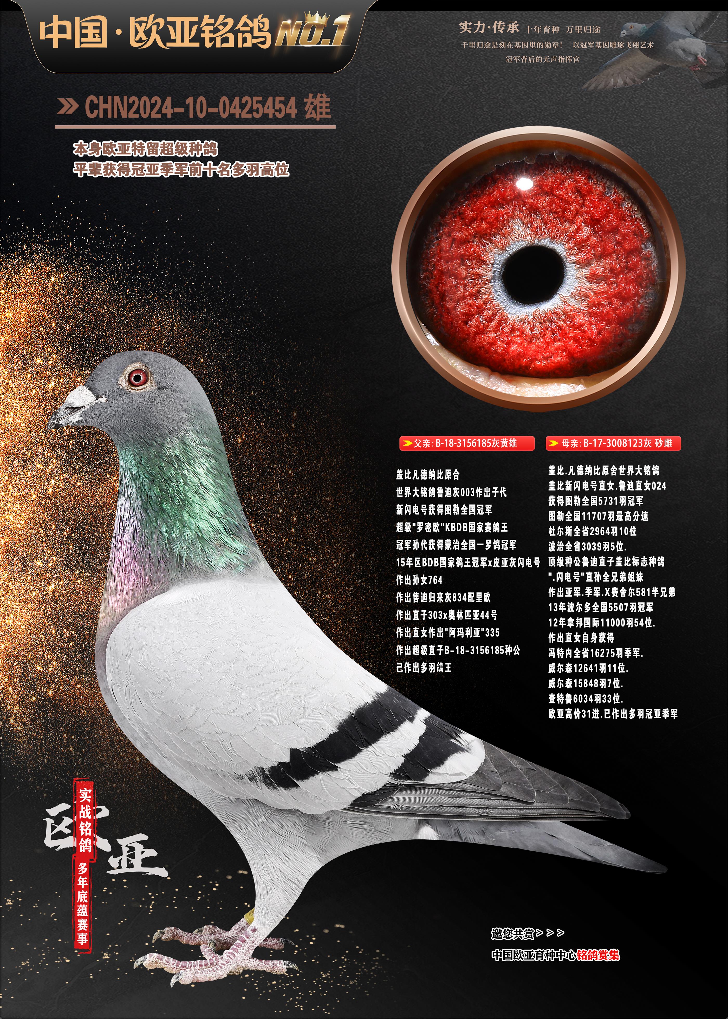 24年秋南京特比环欧亚荣获大团体冠军.小团体冠军551公里大特比13名.14名.16名.19名.20名.21名.24名.26名.27名.28名.42名.52名.54名.57名.65名.66名.68名.70名.71名.72名.74名.76名.80名.82名.83名.84名.85名.86名.90名.92名.110名.116名.121名.122名.128名.131名.158名.161名.164名.165名.166名.172名.174名.177名.182名.195名.196名.201名.205名.208名.210名.216名.253名.269名.275名.276名.294名.296名.299名,,24年秋云南天南铜都公棚决赛415名.天南铜都小棚决赛409名.云南玉活公棚决赛102名.490名.团体32名上笼二羽进二羽,天南铜都大棚506公里决赛445名。热烈祝贺河北省巨鹿县李兰生老师用欧亚泰山号血系连续十一年夺冠军,河北省国家赛冠军.全国季军等多次前十名高位,扬州王军王总用欧亚利奥24年春季获山东翔宇公棚决赛33名盖比53名。南京刘正龙刘总用欧亚盖比获得24年秋山东潍坊国际公棚决赛42名.精英赛30名.三关鸽王71名.决赛86名.加站赛16名.南京市特比环A组鸽王9名.B组鸽王5名.6名.C组鸽王5名.精英赛冠军4名.技能赛A组冠军4名.5名.秦淮区特比环荣获15名.46名.48名.87名。四川西昌徐亮徐总用欧亚利奥获得凉山州聚友决赛177名.第二关亚军双关鸽王19名.三关鸽王105名.云南豪庭公棚决赛603名。热烈祝贺24年四川重庆翔园鸽舍用欧亚泰山号荣获春季400公里冠军.秋季500公里冠军,河北王总用詹森X利奥获得千羽千翔公棚400公里冠军,广东蔡楷焕荣获24年秋爱好者 赛鸽俱乐部三关鸽王季军.一关420公里99名.二关450公里11名.三关520公里32名.单关季军.7名.12名,江西李卫兴荣获贵州红枫公棚8名.共翔俱乐部寄养棚四关综合鸽王30名.一关400公里78名.二关500公里55名.三关520公里37名.四关500公里57名.同父母获公棚18名.雷鸣获得武汉黄浦育翔中心冠军,四川陈文获得四川明鸿俱乐部300公里梦幻2名.3名.4名.9名.10名.13名.14名.15名.31名.34名.40名.41名.42名.43名.69名.71名.72名.73名.74名.94名.95名.97名.98名.99名.419公里决赛荣获总冠军7名.总共归巢9羽,四川徐亮获豪庭决赛603名,山西郑勇获得山西泰鑫公棚决赛255名詹森红狐,热烈祝贺马总获得开尔(飞跃队)决赛9名获奖金1310000万元.第一关52名,天津津福资赛180公里96名.获奖金429543万元,欧亚支持全国鸽友24年秋多人报喜 祝大家取得更好成绩,给欧亚报喜鸽友欧亚决定给每人赠送一羽超级种鸽。欧亚俱乐部特比环多关鸽王成绩:15年秋淮安特比环黑色星期一全会上笼9700多羽,当天无鸽归巢,第二天全会归巢357羽,本舍归巢158羽.前十名八羽.前一百名归巢57羽,16年春季获五关鸽王总冠军,总亚军四名.六名.七名.九名.十名.晶艺俱乐部520公里冠亚季军5名.6名.7名.9名.11名等,火车头冠军.季军6名.8名.9名.10名,16年秋晶艺俱乐部特比环520公里亚军.季军4名.6名.7名.9名,15年春南京白下特比环冠军.亚军.季军6名.7名.8名.9名.10名.指定鸽A B组获得冠军.亚军.季军4名.5名.,17年淮安特比环亚军.4名.5名.7名.8名.10名.六关鸽王总冠军.4名.6名.9名.10名,寄养棚宿迁刘总20羽特比环获冠军.季军.4名.7名.8名.9名等。18年荣获万羽特比环六关鸽王总冠军.总亚军.总季军.6名.8名.十名.单关四羽冠军.二羽亚军.四羽季军.前十名27羽。19年秋万羽特比环六关鸽王总亚军.总季军.5名.8名等,单关二羽冠军.三羽亚军.一羽季军前十名31羽。20年秋淮安市鸽会四关特比环大赛风雨无阻鸽王亚军.鸽王六名,金品俱乐部万羽特比环六关鸽王总冠军,总亚军.四名.五名.六名.七名.八名.十名.前二百名鸽王35羽,单关冠亚季军前十名四十多羽,火车头五关鸽王季军.六名.八名.前二百名鸽王十七羽。20年春荣获淮安五区一市四关鸽王总冠军.亚军.四名.八名.九名。21年秋荣获金品万羽特比环大赛六关鸽王总亚军.总季军.四名.七名.九名.十名.单关冠亚军季军前十名三十多羽。火车头协会鸽王六名.七名.十名.单关前十名十七羽。22年秋荣获鸽王总冠军.总亚军.5名.7名.8名.9名.11名.单关冠亚季军前十名三十多羽,第一关单关前二百名四十多羽,第二关前二百名三十多羽,第三关前二百名四十多羽,第四关前二百名四十多羽,第五关前一百名53羽。23年秋荣获鸽王季军.五名.八名.十名.13名.17名.20名.27名等多羽鸽王.单关前十名二十多羽。公棚.寄养棚部分成绩:16年秋宁夏黄河公棚总冠军电脑戈马力指定通炮冠军,17年送八羽参赛获得鸽王八名进奖四名,支持韩总荣获八名。支持鸽友荣获宁夏中卫公棚决赛总冠军.精英赛冠军,支持18年宁夏黄河公棚决赛冠军詹森X泰山。安徽鼎博寄养棚院内外四关鸽王总冠军.鸽王十七名.三十七名同窝,鸽王39名.42名.58名.67名。18年山东公棚预赛冠军.决赛65名.送八羽进奖五羽.指定获奔驰汽车一辆。支持鸽友获得云南蓝云公棚冠军.盖比X佛卡门。支持鸽友荣获云南银集公棚决赛冠军 詹森427X520血系 速度赛6700羽冠军。17年荣获金马俱乐部寄养棚四关鸽王总冠军.季军.六名.八名.第一关冠军.亚军.季军四名.七名.十一名.金牌教练奖。支持鸽友18年北京费翔公棚预赛九名电脑X桑杰士,支持鸽友荣获陕西威力公棚决赛11名.内蒙古临河寄养棚四关鸽王六名.詹森配泰山,支持河北王总用欧亚詹森427配胡本喜获20年秋开尔青年棚季军。云南东荣公棚16年预赛冠军.决赛77名.17年决赛12名.詹森红狐X泰山,17年平安公棚决赛4名 詹森427。欧亚获得21年金母寄养棚第一关四名.第二关5名.第三关5名.6名.7名.10名.三关鸽王总冠军,四关鸽王14名.十羽鸽王。支持河