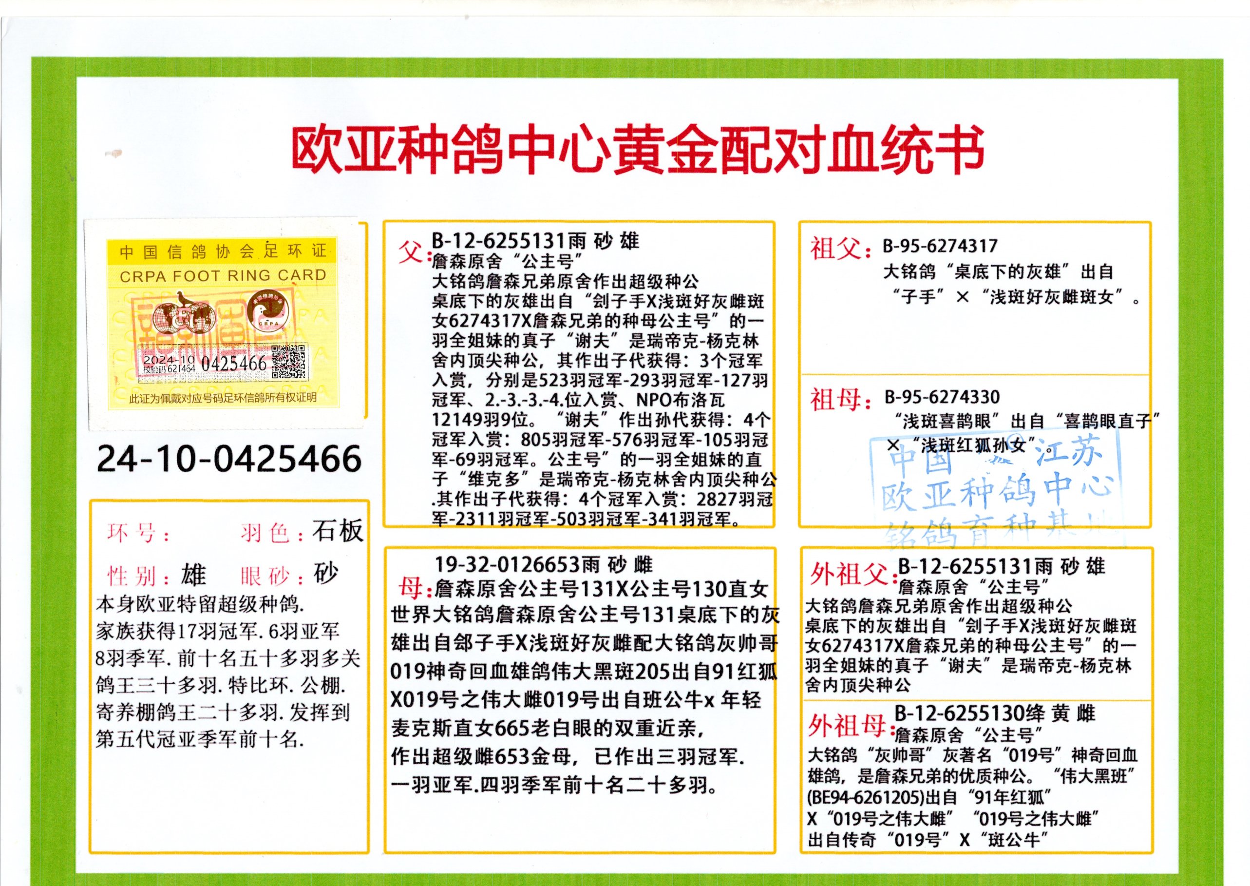 24年秋南京特比环欧亚荣获大团体冠军.小团体冠军551公里大特比13名.14名.16名.19名.20名.21名.24名.26名.27名.28名.42名.52名.54名.57名.65名.66名.68名.70名.71名.72名.74名.76名.80名.82名.83名.84名.85名.86名.90名.92名.110名.116名.121名.122名.128名.131名.158名.161名.164名.165名.166名.172名.174名.177名.182名.195名.196名.201名.205名.208名.210名.216名.253名.269名.275名.276名.294名.296名.299名,,24年秋云南天南铜都公棚决赛415名.天南铜都小棚决赛409名.云南玉活公棚决赛102名.490名.团体32名上笼二羽进二羽,天南铜都大棚506公里决赛445名。热烈祝贺河北省巨鹿县李兰生老师用欧亚泰山号血系连续十一年夺冠军,河北省国家赛冠军.全国季军等多次前十名高位,扬州王军王总用欧亚利奥24年春季获山东翔宇公棚决赛33名盖比53名。南京刘正龙刘总用欧亚盖比获得24年秋山东潍坊国际公棚决赛42名.精英赛30名.三关鸽王71名.决赛86名.加站赛16名.南京市特比环A组鸽王9名.B组鸽王5名.6名.C组鸽王5名.精英赛冠军4名.技能赛A组冠军4名.5名.秦淮区特比环荣获15名.46名.48名.87名。四川西昌徐亮徐总用欧亚利奥获得凉山州聚友决赛177名.第二关亚军双关鸽王19名.三关鸽王105名.云南豪庭公棚决赛603名。热烈祝贺24年四川重庆翔园鸽舍用欧亚泰山号荣获春季400公里冠军.秋季500公里冠军,河北王总用詹森X利奥获得千羽千翔公棚400公里冠军,广东蔡楷焕荣获24年秋爱好者 赛鸽俱乐部三关鸽王季军.一关420公里99名.二关450公里11名.三关520公里32名.单关季军.7名.12名,江西李卫兴荣获贵州红枫公棚8名.共翔俱乐部寄养棚四关综合鸽王30名.一关400公里78名.二关500公里55名.三关520公里37名.四关500公里57名.同父母获公棚18名.雷鸣获得武汉黄浦育翔中心冠军,四川陈文获得四川明鸿俱乐部300公里梦幻2名.3名.4名.9名.10名.13名.14名.15名.31名.34名.40名.41名.42名.43名.69名.71名.72名.73名.74名.94名.95名.97名.98名.99名.419公里决赛荣获总冠军7名.总共归巢9羽,四川徐亮获豪庭决赛603名,山西郑勇获得山西泰鑫公棚决赛255名詹森红狐,热烈祝贺马总获得开尔(飞跃队)决赛9名获奖金1310000万元.第一关52名,天津津福资赛180公里96名.获奖金429543万元,欧亚支持全国鸽友24年秋多人报喜 祝大家取得更好成绩,给欧亚报喜鸽友欧亚决定给每人赠送一羽超级种鸽。欧亚俱乐部特比环多关鸽王成绩:15年秋淮安特比环黑色星期一全会上笼9700多羽,当天无鸽归巢,第二天全会归巢357羽,本舍归巢158羽.前十名八羽.前一百名归巢57羽,16年春季获五关鸽王总冠军,总亚军四名.六名.七名.九名.十名.晶艺俱乐部520公里冠亚季军5名.6名.7名.9名.11名等,火车头冠军.季军6名.8名.9名.10名,16年秋晶艺俱乐部特比环520公里亚军.季军4名.6名.7名.9名,15年春南京白下特比环冠军.亚军.季军6名.7名.8名.9名.10名.指定鸽A B组获得冠军.亚军.季军4名.5名.,17年淮安特比环亚军.4名.5名.7名.8名.10名.六关鸽王总冠军.4名.6名.9名.10名,寄养棚宿迁刘总20羽特比环获冠军.季军.4名.7名.8名.9名等。18年荣获万羽特比环六关鸽王总冠军.总亚军.总季军.6名.8名.十名.单关四羽冠军.二羽亚军.四羽季军.前十名27羽。19年秋万羽特比环六关鸽王总亚军.总季军.5名.8名等,单关二羽冠军.三羽亚军.一羽季军前十名31羽。20年秋淮安市鸽会四关特比环大赛风雨无阻鸽王亚军.鸽王六名,金品俱乐部万羽特比环六关鸽王总冠军,总亚军.四名.五名.六名.七名.八名.十名.前二百名鸽王35羽,单关冠亚季军前十名四十多羽,火车头五关鸽王季军.六名.八名.前二百名鸽王十七羽。20年春荣获淮安五区一市四关鸽王总冠军.亚军.四名.八名.九名。21年秋荣获金品万羽特比环大赛六关鸽王总亚军.总季军.四名.七名.九名.十名.单关冠亚军季军前十名三十多羽。火车头协会鸽王六名.七名.十名.单关前十名十七羽。22年秋荣获鸽王总冠军.总亚军.5名.7名.8名.9名.11名.单关冠亚季军前十名三十多羽,第一关单关前二百名四十多羽,第二关前二百名三十多羽,第三关前二百名四十多羽,第四关前二百名四十多羽,第五关前一百名53羽。23年秋荣获鸽王季军.五名.八名.十名.13名.17名.20名.27名等多羽鸽王.单关前十名二十多羽。公棚.寄养棚部分成绩:16年秋宁夏黄河公棚总冠军电脑戈马力指定通炮冠军,17年送八羽参赛获得鸽王八名进奖四名,支持韩总荣获八名。支持鸽友荣获宁夏中卫公棚决赛总冠军.精英赛冠军,支持18年宁夏黄河公棚决赛冠军詹森X泰山。安徽鼎博寄养棚院内外四关鸽王总冠军.鸽王十七名.三十七名同窝,鸽王39名.42名.58名.67名。18年山东公棚预赛冠军.决赛65名.送八羽进奖五羽.指定获奔驰汽车一辆。支持鸽友获得云南蓝云公棚冠军.盖比X佛卡门。支持鸽友荣获云南银集公棚决赛冠军 詹森427X520血系 速度赛6700羽冠军。17年荣获金马俱乐部寄养棚四关鸽王总冠军.季军.六名.八名.第一关冠军.亚军.季军四名.七名.十一名.金牌教练奖。支持鸽友18年北京费翔公棚预赛九名电脑X桑杰士,支持鸽友荣获陕西威力公棚决赛11名.内蒙古临河寄养棚四关鸽王六名.詹森配泰山,支持河北王总用欧亚詹森427配胡本喜获20年秋开尔青年棚季军。云南东荣公棚16年预赛冠军.决赛77名.17年决赛12名.詹森红狐X泰山,17年平安公棚决赛4名 詹森427。欧亚获得21年金母寄养棚第一关四名.第二关5名.第三关5名.6名.7名.10名.三关鸽王总冠军,四关鸽王14名.十羽鸽王。支持河