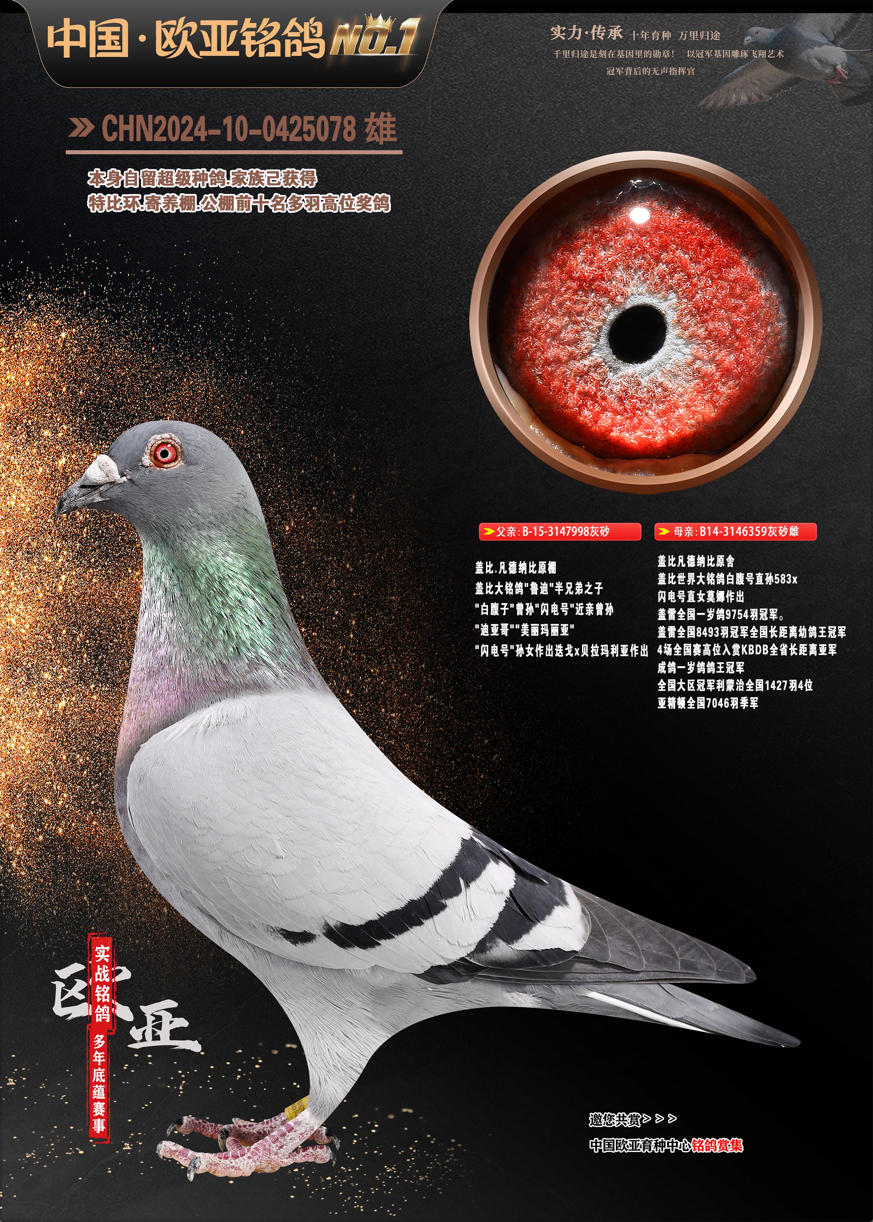 24年秋南京特比环欧亚荣获大团体冠军.小团体冠军551公里大特比13名.14名.16名.19名.20名.21名.24名.26名.27名.28名.42名.52名.54名.57名.65名.66名.68名.70名.71名.72名.74名.76名.80名.82名.83名.84名.85名.86名.90名.92名.110名.116名.121名.122名.128名.131名.158名.161名.164名.165名.166名.172名.174名.177名.182名.195名.196名.201名.205名.208名.210名.216名.253名.269名.275名.276名.294名.296名.299名,,24年秋云南天南铜都公棚决赛415名.天南铜都小棚决赛409名.云南玉活公棚决赛102名.490名.团体32名上笼二羽进二羽,天南铜都大棚506公里决赛445名。热烈祝贺河北省巨鹿县李兰生老师用欧亚泰山号血系连续十一年夺冠军,河北省国家赛冠军.全国季军等多次前十名高位,扬州王军王总用欧亚利奥24年春季获山东翔宇公棚决赛33名盖比53名。南京刘正龙刘总用欧亚盖比获得24年秋山东潍坊国际公棚决赛42名.精英赛30名.三关鸽王71名.决赛86名.加站赛16名.南京市特比环A组鸽王9名.B组鸽王5名.6名.C组鸽王5名.精英赛冠军4名.技能赛A组冠军4名.5名.秦淮区特比环荣获15名.46名.48名.87名。四川西昌徐亮徐总用欧亚利奥获得凉山州聚友决赛177名.第二关亚军双关鸽王19名.三关鸽王105名.云南豪庭公棚决赛603名。热烈祝贺24年四川重庆翔园鸽舍用欧亚泰山号荣获春季400公里冠军.秋季500公里冠军,河北王总用詹森X利奥获得千羽千翔公棚400公里冠军,广东蔡楷焕荣获24年秋爱好者 赛鸽俱乐部三关鸽王季军.一关420公里99名.二关450公里11名.三关520公里32名.单关季军.7名.12名,江西李卫兴荣获贵州红枫公棚8名.共翔俱乐部寄养棚四关综合鸽王30名.一关400公里78名.二关500公里55名.三关520公里37名.四关500公里57名.同父母获公棚18名.雷鸣获得武汉黄浦育翔中心冠军,四川陈文获得四川明鸿俱乐部300公里梦幻2名.3名.4名.9名.10名.13名.14名.15名.31名.34名.40名.41名.42名.43名.69名.71名.72名.73名.74名.94名.95名.97名.98名.99名.419公里决赛荣获总冠军7名.总共归巢9羽,四川徐亮获豪庭决赛603名,山西郑勇获得山西泰鑫公棚决赛255名詹森红狐,热烈祝贺马总获得开尔(飞跃队)决赛9名获奖金1310000万元.第一关52名,天津津福资赛180公里96名.获奖金429543万元,欧亚支持全国鸽友24年秋多人报喜 祝大家取得更好成绩,给欧亚报喜鸽友欧亚决定给每人赠送一羽超级种鸽。欧亚俱乐部特比环多关鸽王成绩:15年秋淮安特比环黑色星期一全会上笼9700多羽,当天无鸽归巢,第二天全会归巢357羽,本舍归巢158羽.前十名八羽.前一百名归巢57羽,16年春季获五关鸽王总冠军,总亚军四名.六名.七名.九名.十名.晶艺俱乐部520公里冠亚季军5名.6名.7名.9名.11名等,火车头冠军.季军6名.8名.9名.10名,16年秋晶艺俱乐部特比环520公里亚军.季军4名.6名.7名.9名,15年春南京白下特比环冠军.亚军.季军6名.7名.8名.9名.10名.指定鸽A B组获得冠军.亚军.季军4名.5名.,17年淮安特比环亚军.4名.5名.7名.8名.10名.六关鸽王总冠军.4名.6名.9名.10名,寄养棚宿迁刘总20羽特比环获冠军.季军.4名.7名.8名.9名等。18年荣获万羽特比环六关鸽王总冠军.总亚军.总季军.6名.8名.十名.单关四羽冠军.二羽亚军.四羽季军.前十名27羽。19年秋万羽特比环六关鸽王总亚军.总季军.5名.8名等,单关二羽冠军.三羽亚军.一羽季军前十名31羽。20年秋淮安市鸽会四关特比环大赛风雨无阻鸽王亚军.鸽王六名,金品俱乐部万羽特比环六关鸽王总冠军,总亚军.四名.五名.六名.七名.八名.十名.前二百名鸽王35羽,单关冠亚季军前十名四十多羽,火车头五关鸽王季军.六名.八名.前二百名鸽王十七羽。20年春荣获淮安五区一市四关鸽王总冠军.亚军.四名.八名.九名。21年秋荣获金品万羽特比环大赛六关鸽王总亚军.总季军.四名.七名.九名.十名.单关冠亚军季军前十名三十多羽。火车头协会鸽王六名.七名.十名.单关前十名十七羽。22年秋荣获鸽王总冠军.总亚军.5名.7名.8名.9名.11名.单关冠亚季军前十名三十多羽,第一关单关前二百名四十多羽,第二关前二百名三十多羽,第三关前二百名四十多羽,第四关前二百名四十多羽,第五关前一百名53羽。23年秋荣获鸽王季军.五名.八名.十名.13名.17名.20名.27名等多羽鸽王.单关前十名二十多羽。公棚.寄养棚部分成绩:16年秋宁夏黄河公棚总冠军电脑戈马力指定通炮冠军,17年送八羽参赛获得鸽王八名进奖四名,支持韩总荣获八名。支持鸽友荣获宁夏中卫公棚决赛总冠军.精英赛冠军,支持18年宁夏黄河公棚决赛冠军詹森X泰山。安徽鼎博寄养棚院内外四关鸽王总冠军.鸽王十七名.三十七名同窝,鸽王39名.42名.58名.67名。18年山东公棚预赛冠军.决赛65名.送八羽进奖五羽.指定获奔驰汽车一辆。支持鸽友获得云南蓝云公棚冠军.盖比X佛卡门。支持鸽友荣获云南银集公棚决赛冠军 詹森427X520血系 速度赛6700羽冠军。17年荣获金马俱乐部寄养棚四关鸽王总冠军.季军.六名.八名.第一关冠军.亚军.季军四名.七名.十一名.金牌教练奖。支持鸽友18年北京费翔公棚预赛九名电脑X桑杰士,支持鸽友荣获陕西威力公棚决赛11名.内蒙古临河寄养棚四关鸽王六名.詹森配泰山,支持河北王总用欧亚詹森427配胡本喜获20年秋开尔青年棚季军。云南东荣公棚16年预赛冠军.决赛77名.17年决赛12名.詹森红狐X泰山,17年平安公棚决赛4名 詹森427。欧亚获得21年金母寄养棚第一关四名.第二关5名.第三关5名.6名.7名.10名.三关鸽王总冠军,四关鸽王14名.十羽鸽王。支持河