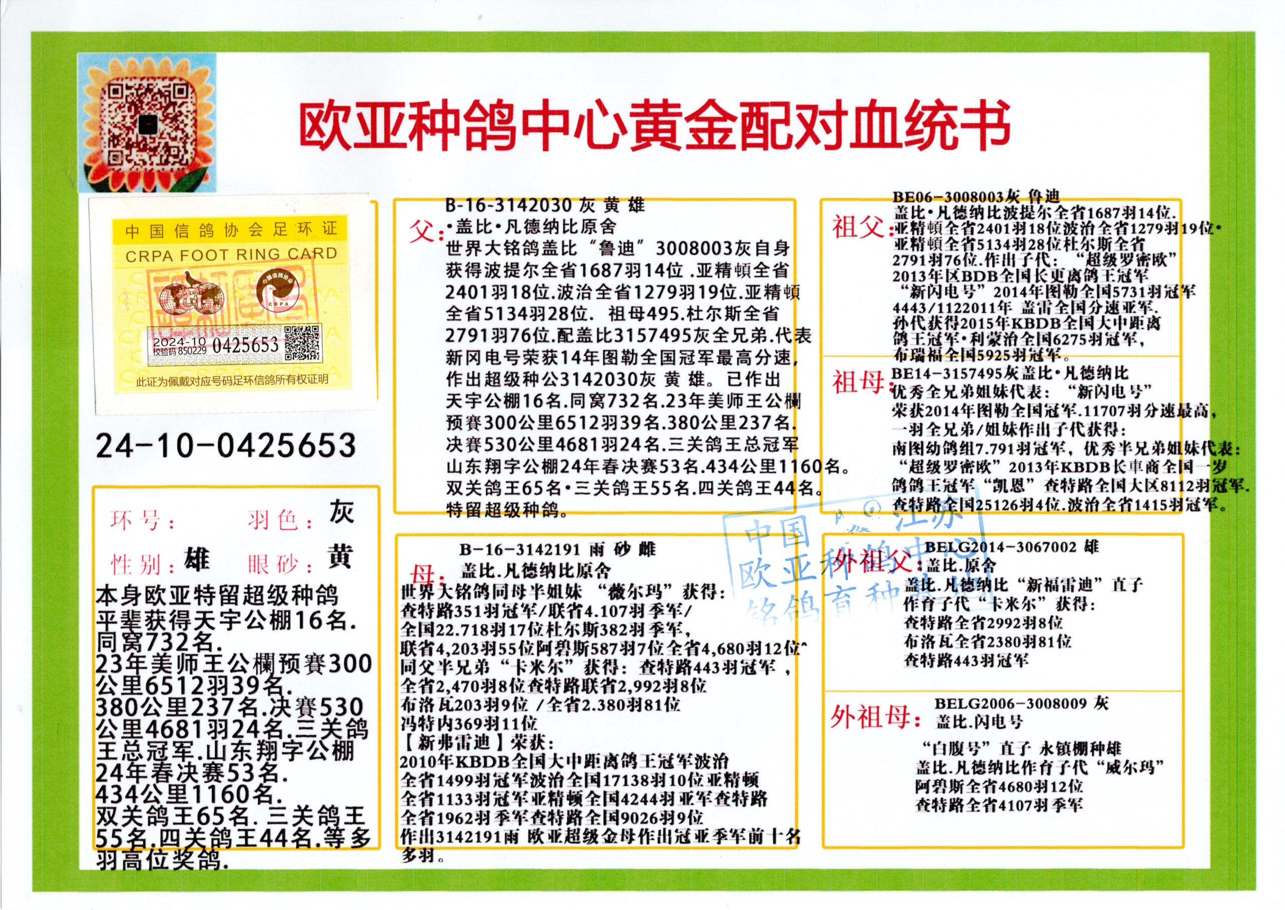 24年秋南京特比环欧亚荣获大团体冠军.小团体冠军551公里大特比13名.14名.16名.19名.20名.21名.24名.26名.27名.28名.42名.52名.54名.57名.65名.66名.68名.70名.71名.72名.74名.76名.80名.82名.83名.84名.85名.86名.90名.92名.110名.116名.121名.122名.128名.131名.158名.161名.164名.165名.166名.172名.174名.177名.182名.195名.196名.201名.205名.208名.210名.216名.253名.269名.275名.276名.294名.296名.299名,,24年秋云南天南铜都公棚决赛415名.天南铜都小棚决赛409名.云南玉活公棚决赛102名.490名.团体32名上笼二羽进二羽,天南铜都大棚506公里决赛445名。热烈祝贺河北省巨鹿县李兰生老师用欧亚泰山号血系连续十一年夺冠军,河北省国家赛冠军.全国季军等多次前十名高位,扬州王军王总用欧亚利奥24年春季获山东翔宇公棚决赛33名盖比53名。南京刘正龙刘总用欧亚盖比获得24年秋山东潍坊国际公棚决赛42名.精英赛30名.三关鸽王71名.决赛86名.加站赛16名.南京市特比环A组鸽王9名.B组鸽王5名.6名.C组鸽王5名.精英赛冠军4名.技能赛A组冠军4名.5名.秦淮区特比环荣获15名.46名.48名.87名。四川西昌徐亮徐总用欧亚利奥获得凉山州聚友决赛177名.第二关亚军双关鸽王19名.三关鸽王105名.云南豪庭公棚决赛603名。热烈祝贺24年四川重庆翔园鸽舍用欧亚泰山号荣获春季400公里冠军.秋季500公里冠军,河北王总用詹森X利奥获得千羽千翔公棚400公里冠军,广东蔡楷焕荣获24年秋爱好者 赛鸽俱乐部三关鸽王季军.一关420公里99名.二关450公里11名.三关520公里32名.单关季军.7名.12名,江西李卫兴荣获贵州红枫公棚8名.共翔俱乐部寄养棚四关综合鸽王30名.一关400公里78名.二关500公里55名.三关520公里37名.四关500公里57名.同父母获公棚18名.雷鸣获得武汉黄浦育翔中心冠军,四川陈文获得四川明鸿俱乐部300公里梦幻2名.3名.4名.9名.10名.13名.14名.15名.31名.34名.40名.41名.42名.43名.69名.71名.72名.73名.74名.94名.95名.97名.98名.99名.419公里决赛荣获总冠军7名.总共归巢9羽,四川徐亮获豪庭决赛603名,山西郑勇获得山西泰鑫公棚决赛255名詹森红狐,热烈祝贺马总获得开尔(飞跃队)决赛9名获奖金1310000万元.第一关52名,天津津福资赛180公里96名.获奖金429543万元,欧亚支持全国鸽友24年秋多人报喜 祝大家取得更好成绩,给欧亚报喜鸽友欧亚决定给每人赠送一羽超级种鸽。欧亚俱乐部特比环多关鸽王成绩:15年秋淮安特比环黑色星期一全会上笼9700多羽,当天无鸽归巢,第二天全会归巢357羽,本舍归巢158羽.前十名八羽.前一百名归巢57羽,16年春季获五关鸽王总冠军,总亚军四名.六名.七名.九名.十名.晶艺俱乐部520公里冠亚季军5名.6名.7名.9名.11名等,火车头冠军.季军6名.8名.9名.10名,16年秋晶艺俱乐部特比环520公里亚军.季军4名.6名.7名.9名,15年春南京白下特比环冠军.亚军.季军6名.7名.8名.9名.10名.指定鸽A B组获得冠军.亚军.季军4名.5名.,17年淮安特比环亚军.4名.5名.7名.8名.10名.六关鸽王总冠军.4名.6名.9名.10名,寄养棚宿迁刘总20羽特比环获冠军.季军.4名.7名.8名.9名等。18年荣获万羽特比环六关鸽王总冠军.总亚军.总季军.6名.8名.十名.单关四羽冠军.二羽亚军.四羽季军.前十名27羽。19年秋万羽特比环六关鸽王总亚军.总季军.5名.8名等,单关二羽冠军.三羽亚军.一羽季军前十名31羽。20年秋淮安市鸽会四关特比环大赛风雨无阻鸽王亚军.鸽王六名,金品俱乐部万羽特比环六关鸽王总冠军,总亚军.四名.五名.六名.七名.八名.十名.前二百名鸽王35羽,单关冠亚季军前十名四十多羽,火车头五关鸽王季军.六名.八名.前二百名鸽王十七羽。20年春荣获淮安五区一市四关鸽王总冠军.亚军.四名.八名.九名。21年秋荣获金品万羽特比环大赛六关鸽王总亚军.总季军.四名.七名.九名.十名.单关冠亚军季军前十名三十多羽。火车头协会鸽王六名.七名.十名.单关前十名十七羽。22年秋荣获鸽王总冠军.总亚军.5名.7名.8名.9名.11名.单关冠亚季军前十名三十多羽,第一关单关前二百名四十多羽,第二关前二百名三十多羽,第三关前二百名四十多羽,第四关前二百名四十多羽,第五关前一百名53羽。23年秋荣获鸽王季军.五名.八名.十名.13名.17名.20名.27名等多羽鸽王.单关前十名二十多羽。公棚.寄养棚部分成绩:16年秋宁夏黄河公棚总冠军电脑戈马力指定通炮冠军,17年送八羽参赛获得鸽王八名进奖四名,支持韩总荣获八名。支持鸽友荣获宁夏中卫公棚决赛总冠军.精英赛冠军,支持18年宁夏黄河公棚决赛冠军詹森X泰山。安徽鼎博寄养棚院内外四关鸽王总冠军.鸽王十七名.三十七名同窝,鸽王39名.42名.58名.67名。18年山东公棚预赛冠军.决赛65名.送八羽进奖五羽.指定获奔驰汽车一辆。支持鸽友获得云南蓝云公棚冠军.盖比X佛卡门。支持鸽友荣获云南银集公棚决赛冠军 詹森427X520血系 速度赛6700羽冠军。17年荣获金马俱乐部寄养棚四关鸽王总冠军.季军.六名.八名.第一关冠军.亚军.季军四名.七名.十一名.金牌教练奖。支持鸽友18年北京费翔公棚预赛九名电脑X桑杰士,支持鸽友荣获陕西威力公棚决赛11名.内蒙古临河寄养棚四关鸽王六名.詹森配泰山,支持河北王总用欧亚詹森427配胡本喜获20年秋开尔青年棚季军。云南东荣公棚16年预赛冠军.决赛77名.17年决赛12名.詹森红狐X泰山,17年平安公棚决赛4名 詹森427。欧亚获得21年金母寄养棚第一关四名.第二关5名.第三关5名.6名.7名.10名.三关鸽王总冠军,四关鸽王14名.十羽鸽王。支持河