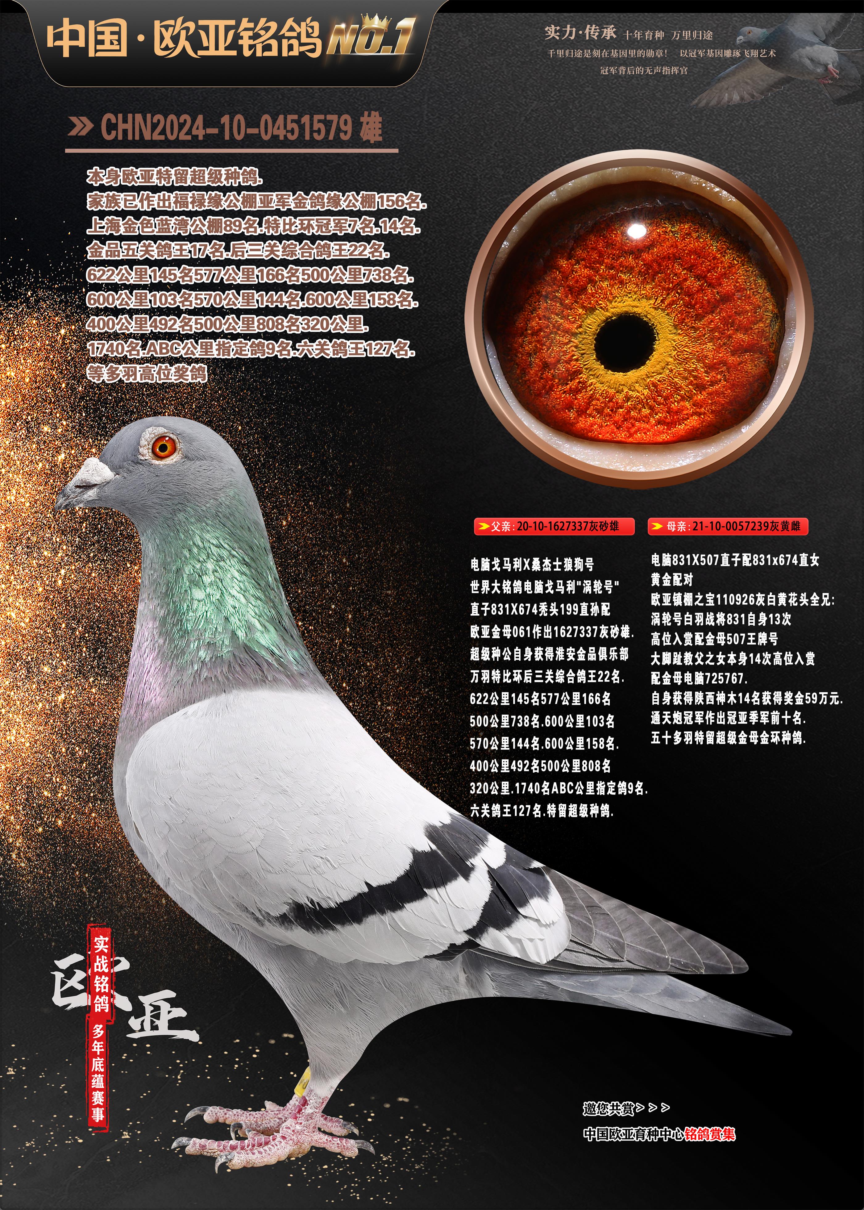 24年秋南京特比环欧亚荣获大团体冠军.小团体冠军551公里大特比13名.14名.16名.19名.20名.21名.24名.26名.27名.28名.42名.52名.54名.57名.65名.66名.68名.70名.71名.72名.74名.76名.80名.82名.83名.84名.85名.86名.90名.92名.110名.116名.121名.122名.128名.131名.158名.161名.164名.165名.166名.172名.174名.177名.182名.195名.196名.201名.205名.208名.210名.216名.253名.269名.275名.276名.294名.296名.299名,,24年秋云南天南铜都公棚决赛415名.天南铜都小棚决赛409名.云南玉活公棚决赛102名.490名.团体32名上笼二羽进二羽,天南铜都大棚506公里决赛445名。热烈祝贺河北省巨鹿县李兰生老师用欧亚泰山号血系连续十一年夺冠军,河北省国家赛冠军.全国季军等多次前十名高位,扬州王军王总用欧亚利奥24年春季获山东翔宇公棚决赛33名盖比53名。南京刘正龙刘总用欧亚盖比获得24年秋山东潍坊国际公棚决赛42名.精英赛30名.三关鸽王71名.决赛86名.加站赛16名.南京市特比环A组鸽王9名.B组鸽王5名.6名.C组鸽王5名.精英赛冠军4名.技能赛A组冠军4名.5名.秦淮区特比环荣获15名.46名.48名.87名。四川西昌徐亮徐总用欧亚利奥获得凉山州聚友决赛177名.第二关亚军双关鸽王19名.三关鸽王105名.云南豪庭公棚决赛603名。热烈祝贺24年四川重庆翔园鸽舍用欧亚泰山号荣获春季400公里冠军.秋季500公里冠军,河北王总用詹森X利奥获得千羽千翔公棚400公里冠军,广东蔡楷焕荣获24年秋爱好者 赛鸽俱乐部三关鸽王季军.一关420公里99名.二关450公里11名.三关520公里32名.单关季军.7名.12名,江西李卫兴荣获贵州红枫公棚8名.共翔俱乐部寄养棚四关综合鸽王30名.一关400公里78名.二关500公里55名.三关520公里37名.四关500公里57名.同父母获公棚18名.雷鸣获得武汉黄浦育翔中心冠军,四川陈文获得四川明鸿俱乐部300公里梦幻2名.3名.4名.9名.10名.13名.14名.15名.31名.34名.40名.41名.42名.43名.69名.71名.72名.73名.74名.94名.95名.97名.98名.99名.419公里决赛荣获总冠军7名.总共归巢9羽,四川徐亮获豪庭决赛603名,山西郑勇获得山西泰鑫公棚决赛255名詹森红狐,热烈祝贺马总获得开尔(飞跃队)决赛9名获奖金1310000万元.第一关52名,天津津福资赛180公里96名.获奖金429543万元,欧亚支持全国鸽友24年秋多人报喜 祝大家取得更好成绩,给欧亚报喜鸽友欧亚决定给每人赠送一羽超级种鸽。欧亚俱乐部特比环多关鸽王成绩:15年秋淮安特比环黑色星期一全会上笼9700多羽,当天无鸽归巢,第二天全会归巢357羽,本舍归巢158羽.前十名八羽.前一百名归巢57羽,16年春季获五关鸽王总冠军,总亚军四名.六名.七名.九名.十名.晶艺俱乐部520公里冠亚季军5名.6名.7名.9名.11名等,火车头冠军.季军6名.8名.9名.10名,16年秋晶艺俱乐部特比环520公里亚军.季军4名.6名.7名.9名,15年春南京白下特比环冠军.亚军.季军6名.7名.8名.9名.10名.指定鸽A B组获得冠军.亚军.季军4名.5名.,17年淮安特比环亚军.4名.5名.7名.8名.10名.六关鸽王总冠军.4名.6名.9名.10名,寄养棚宿迁刘总20羽特比环获冠军.季军.4名.7名.8名.9名等。18年荣获万羽特比环六关鸽王总冠军.总亚军.总季军.6名.8名.十名.单关四羽冠军.二羽亚军.四羽季军.前十名27羽。19年秋万羽特比环六关鸽王总亚军.总季军.5名.8名等,单关二羽冠军.三羽亚军.一羽季军前十名31羽。20年秋淮安市鸽会四关特比环大赛风雨无阻鸽王亚军.鸽王六名,金品俱乐部万羽特比环六关鸽王总冠军,总亚军.四名.五名.六名.七名.八名.十名.前二百名鸽王35羽,单关冠亚季军前十名四十多羽,火车头五关鸽王季军.六名.八名.前二百名鸽王十七羽。20年春荣获淮安五区一市四关鸽王总冠军.亚军.四名.八名.九名。21年秋荣获金品万羽特比环大赛六关鸽王总亚军.总季军.四名.七名.九名.十名.单关冠亚军季军前十名三十多羽。火车头协会鸽王六名.七名.十名.单关前十名十七羽。22年秋荣获鸽王总冠军.总亚军.5名.7名.8名.9名.11名.单关冠亚季军前十名三十多羽,第一关单关前二百名四十多羽,第二关前二百名三十多羽,第三关前二百名四十多羽,第四关前二百名四十多羽,第五关前一百名53羽。23年秋荣获鸽王季军.五名.八名.十名.13名.17名.20名.27名等多羽鸽王.单关前十名二十多羽。公棚.寄养棚部分成绩:16年秋宁夏黄河公棚总冠军电脑戈马力指定通炮冠军,17年送八羽参赛获得鸽王八名进奖四名,支持韩总荣获八名。支持鸽友荣获宁夏中卫公棚决赛总冠军.精英赛冠军,支持18年宁夏黄河公棚决赛冠军詹森X泰山。安徽鼎博寄养棚院内外四关鸽王总冠军.鸽王十七名.三十七名同窝,鸽王39名.42名.58名.67名。18年山东公棚预赛冠军.决赛65名.送八羽进奖五羽.指定获奔驰汽车一辆。支持鸽友获得云南蓝云公棚冠军.盖比X佛卡门。支持鸽友荣获云南银集公棚决赛冠军 詹森427X520血系 速度赛6700羽冠军。17年荣获金马俱乐部寄养棚四关鸽王总冠军.季军.六名.八名.第一关冠军.亚军.季军四名.七名.十一名.金牌教练奖。支持鸽友18年北京费翔公棚预赛九名电脑X桑杰士,支持鸽友荣获陕西威力公棚决赛11名.内蒙古临河寄养棚四关鸽王六名.詹森配泰山,支持河北王总用欧亚詹森427配胡本喜获20年秋开尔青年棚季军。云南东荣公棚16年预赛冠军.决赛77名.17年决赛12名.詹森红狐X泰山,17年平安公棚决赛4名 詹森427。欧亚获得21年金母寄养棚第一关四名.第二关5名.第三关5名.6名.7名.10名.三关鸽王总冠军,四关鸽王14名.十羽鸽王。支持河