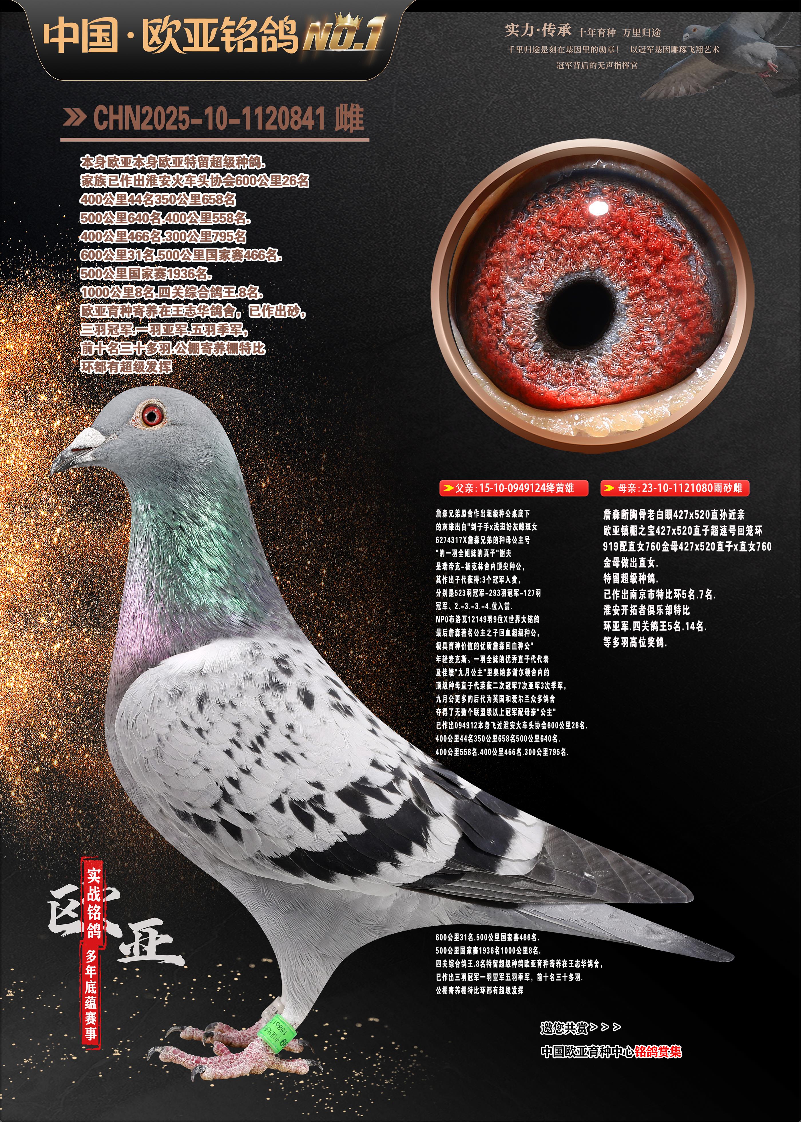 24年秋南京特比环欧亚荣获大团体冠军.小团体冠军551公里大特比13名.14名.16名.19名.20名.21名.24名.26名.27名.28名.42名.52名.54名.57名.65名.66名.68名.70名.71名.72名.74名.76名.80名.82名.83名.84名.85名.86名.90名.92名.110名.116名.121名.122名.128名.131名.158名.161名.164名.165名.166名.172名.174名.177名.182名.195名.196名.201名.205名.208名.210名.216名.253名.269名.275名.276名.294名.296名.299名,,24年秋云南天南铜都公棚决赛415名.天南铜都小棚决赛409名.云南玉活公棚决赛102名.490名.团体32名上笼二羽进二羽,天南铜都大棚506公里决赛445名。热烈祝贺河北省巨鹿县李兰生老师用欧亚泰山号血系连续十一年夺冠军,河北省国家赛冠军.全国季军等多次前十名高位,扬州王军王总用欧亚利奥24年春季获山东翔宇公棚决赛33名盖比53名。南京刘正龙刘总用欧亚盖比获得24年秋山东潍坊国际公棚决赛42名.精英赛30名.三关鸽王71名.决赛86名.加站赛16名.南京市特比环A组鸽王9名.B组鸽王5名.6名.C组鸽王5名.精英赛冠军4名.技能赛A组冠军4名.5名.秦淮区特比环荣获15名.46名.48名.87名。四川西昌徐亮徐总用欧亚利奥获得凉山州聚友决赛177名.第二关亚军双关鸽王19名.三关鸽王105名.云南豪庭公棚决赛603名。热烈祝贺24年四川重庆翔园鸽舍用欧亚泰山号荣获春季400公里冠军.秋季500公里冠军,河北王总用詹森X利奥获得千羽千翔公棚400公里冠军,广东蔡楷焕荣获24年秋爱好者 赛鸽俱乐部三关鸽王季军.一关420公里99名.二关450公里11名.三关520公里32名.单关季军.7名.12名,江西李卫兴荣获贵州红枫公棚8名.共翔俱乐部寄养棚四关综合鸽王30名.一关400公里78名.二关500公里55名.三关520公里37名.四关500公里57名.同父母获公棚18名.雷鸣获得武汉黄浦育翔中心冠军,四川陈文获得四川明鸿俱乐部300公里梦幻2名.3名.4名.9名.10名.13名.14名.15名.31名.34名.40名.41名.42名.43名.69名.71名.72名.73名.74名.94名.95名.97名.98名.99名.419公里决赛荣获总冠军7名.总共归巢9羽,四川徐亮获豪庭决赛603名,山西郑勇获得山西泰鑫公棚决赛255名詹森红狐,热烈祝贺马总获得开尔(飞跃队)决赛9名获奖金1310000万元.第一关52名,天津津福资赛180公里96名.获奖金429543万元,欧亚支持全国鸽友24年秋多人报喜 祝大家取得更好成绩,给欧亚报喜鸽友欧亚决定给每人赠送一羽超级种鸽。欧亚俱乐部特比环多关鸽王成绩:15年秋淮安特比环黑色星期一全会上笼9700多羽,当天无鸽归巢,第二天全会归巢357羽,本舍归巢158羽.前十名八羽.前一百名归巢57羽,16年春季获五关鸽王总冠军,总亚军四名.六名.七名.九名.十名.晶艺俱乐部520公里冠亚季军5名.6名.7名.9名.11名等,火车头冠军.季军6名.8名.9名.10名,16年秋晶艺俱乐部特比环520公里亚军.季军4名.6名.7名.9名,15年春南京白下特比环冠军.亚军.季军6名.7名.8名.9名.10名.指定鸽A B组获得冠军.亚军.季军4名.5名.,17年淮安特比环亚军.4名.5名.7名.8名.10名.六关鸽王总冠军.4名.6名.9名.10名,寄养棚宿迁刘总20羽特比环获冠军.季军.4名.7名.8名.9名等。18年荣获万羽特比环六关鸽王总冠军.总亚军.总季军.6名.8名.十名.单关四羽冠军.二羽亚军.四羽季军.前十名27羽。19年秋万羽特比环六关鸽王总亚军.总季军.5名.8名等,单关二羽冠军.三羽亚军.一羽季军前十名31羽。20年秋淮安市鸽会四关特比环大赛风雨无阻鸽王亚军.鸽王六名,金品俱乐部万羽特比环六关鸽王总冠军,总亚军.四名.五名.六名.七名.八名.十名.前二百名鸽王35羽,单关冠亚季军前十名四十多羽,火车头五关鸽王季军.六名.八名.前二百名鸽王十七羽。20年春荣获淮安五区一市四关鸽王总冠军.亚军.四名.八名.九名。21年秋荣获金品万羽特比环大赛六关鸽王总亚军.总季军.四名.七名.九名.十名.单关冠亚军季军前十名三十多羽。火车头协会鸽王六名.七名.十名.单关前十名十七羽。22年秋荣获鸽王总冠军.总亚军.5名.7名.8名.9名.11名.单关冠亚季军前十名三十多羽,第一关单关前二百名四十多羽,第二关前二百名三十多羽,第三关前二百名四十多羽,第四关前二百名四十多羽,第五关前一百名53羽。23年秋荣获鸽王季军.五名.八名.十名.13名.17名.20名.27名等多羽鸽王.单关前十名二十多羽。公棚.寄养棚部分成绩:16年秋宁夏黄河公棚总冠军电脑戈马力指定通炮冠军,17年送八羽参赛获得鸽王八名进奖四名,支持韩总荣获八名。支持鸽友荣获宁夏中卫公棚决赛总冠军.精英赛冠军,支持18年宁夏黄河公棚决赛冠军詹森X泰山。安徽鼎博寄养棚院内外四关鸽王总冠军.鸽王十七名.三十七名同窝,鸽王39名.42名.58名.67名。18年山东公棚预赛冠军.决赛65名.送八羽进奖五羽.指定获奔驰汽车一辆。支持鸽友获得云南蓝云公棚冠军.盖比X佛卡门。支持鸽友荣获云南银集公棚决赛冠军 詹森427X520血系 速度赛6700羽冠军。17年荣获金马俱乐部寄养棚四关鸽王总冠军.季军.六名.八名.第一关冠军.亚军.季军四名.七名.十一名.金牌教练奖。支持鸽友18年北京费翔公棚预赛九名电脑X桑杰士,支持鸽友荣获陕西威力公棚决赛11名.内蒙古临河寄养棚四关鸽王六名.詹森配泰山,支持河北王总用欧亚詹森427配胡本喜获20年秋开尔青年棚季军。云南东荣公棚16年预赛冠军.决赛77名.17年决赛12名.詹森红狐X泰山,17年平安公棚决赛4名 詹森427。欧亚获得21年金母寄养棚第一关四名.第二关5名.第三关5名.6名.7名.10名.三关鸽王总冠军,四关鸽王14名.十羽鸽王。支持河