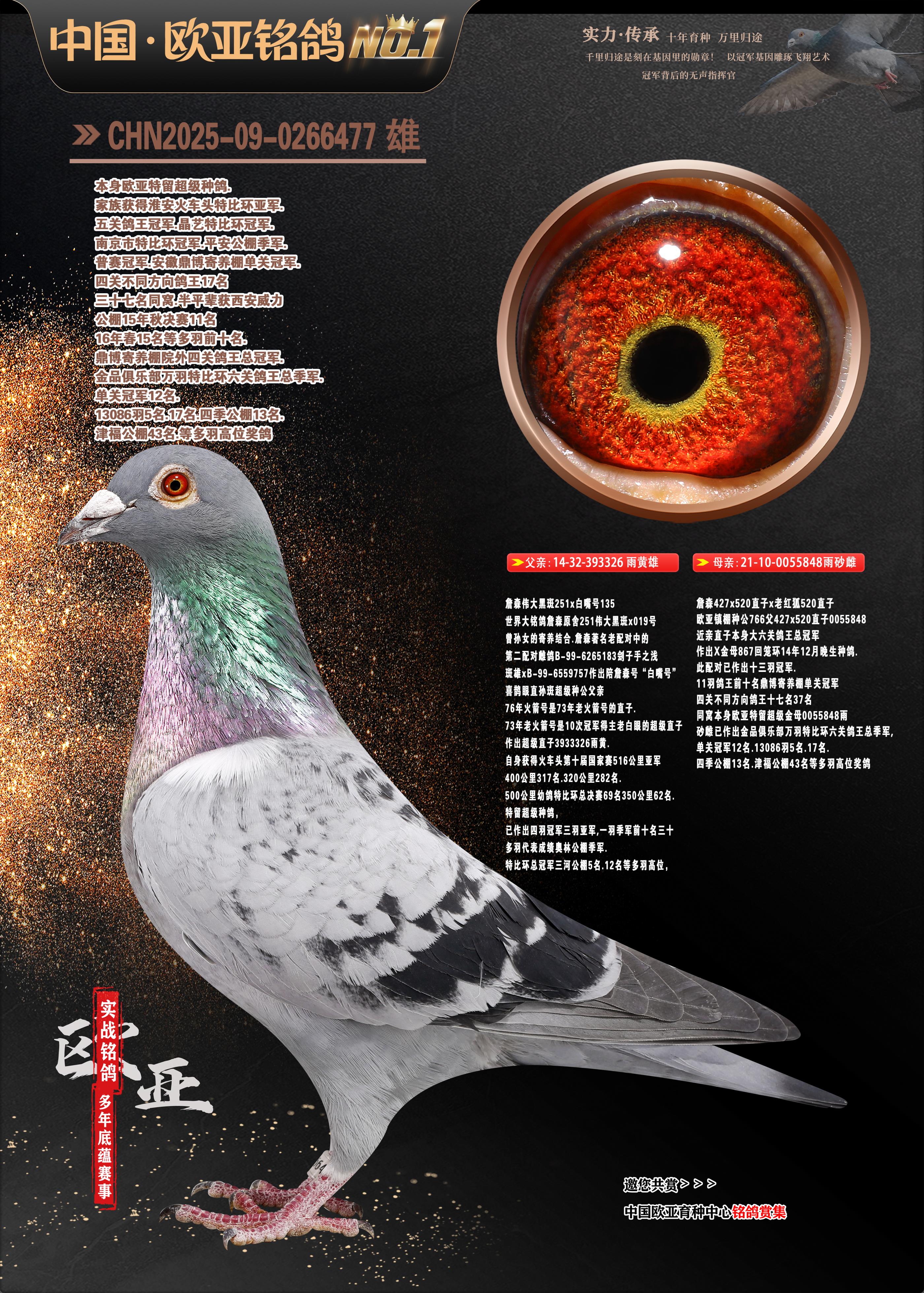 24年秋南京特比环欧亚荣获大团体冠军.小团体冠军551公里大特比13名.14名.16名.19名.20名.21名.24名.26名.27名.28名.42名.52名.54名.57名.65名.66名.68名.70名.71名.72名.74名.76名.80名.82名.83名.84名.85名.86名.90名.92名.110名.116名.121名.122名.128名.131名.158名.161名.164名.165名.166名.172名.174名.177名.182名.195名.196名.201名.205名.208名.210名.216名.253名.269名.275名.276名.294名.296名.299名,,24年秋云南天南铜都公棚决赛415名.天南铜都小棚决赛409名.云南玉活公棚决赛102名.490名.团体32名上笼二羽进二羽,天南铜都大棚506公里决赛445名。热烈祝贺河北省巨鹿县李兰生老师用欧亚泰山号血系连续十一年夺冠军,河北省国家赛冠军.全国季军等多次前十名高位,扬州王军王总用欧亚利奥24年春季获山东翔宇公棚决赛33名盖比53名。南京刘正龙刘总用欧亚盖比获得24年秋山东潍坊国际公棚决赛42名.精英赛30名.三关鸽王71名.决赛86名.加站赛16名.南京市特比环A组鸽王9名.B组鸽王5名.6名.C组鸽王5名.精英赛冠军4名.技能赛A组冠军4名.5名.秦淮区特比环荣获15名.46名.48名.87名。四川西昌徐亮徐总用欧亚利奥获得凉山州聚友决赛177名.第二关亚军双关鸽王19名.三关鸽王105名.云南豪庭公棚决赛603名。热烈祝贺24年四川重庆翔园鸽舍用欧亚泰山号荣获春季400公里冠军.秋季500公里冠军,河北王总用詹森X利奥获得千羽千翔公棚400公里冠军,广东蔡楷焕荣获24年秋爱好者 赛鸽俱乐部三关鸽王季军.一关420公里99名.二关450公里11名.三关520公里32名.单关季军.7名.12名,江西李卫兴荣获贵州红枫公棚8名.共翔俱乐部寄养棚四关综合鸽王30名.一关400公里78名.二关500公里55名.三关520公里37名.四关500公里57名.同父母获公棚18名.雷鸣获得武汉黄浦育翔中心冠军,四川陈文获得四川明鸿俱乐部300公里梦幻2名.3名.4名.9名.10名.13名.14名.15名.31名.34名.40名.41名.42名.43名.69名.71名.72名.73名.74名.94名.95名.97名.98名.99名.419公里决赛荣获总冠军7名.总共归巢9羽,四川徐亮获豪庭决赛603名,山西郑勇获得山西泰鑫公棚决赛255名詹森红狐,热烈祝贺马总获得开尔(飞跃队)决赛9名获奖金1310000万元.第一关52名,天津津福资赛180公里96名.获奖金429543万元,欧亚支持全国鸽友24年秋多人报喜 祝大家取得更好成绩,给欧亚报喜鸽友欧亚决定给每人赠送一羽超级种鸽。欧亚俱乐部特比环多关鸽王成绩:15年秋淮安特比环黑色星期一全会上笼9700多羽,当天无鸽归巢,第二天全会归巢357羽,本舍归巢158羽.前十名八羽.前一百名归巢57羽,16年春季获五关鸽王总冠军,总亚军四名.六名.七名.九名.十名.晶艺俱乐部520公里冠亚季军5名.6名.7名.9名.11名等,火车头冠军.季军6名.8名.9名.10名,16年秋晶艺俱乐部特比环520公里亚军.季军4名.6名.7名.9名,15年春南京白下特比环冠军.亚军.季军6名.7名.8名.9名.10名.指定鸽A B组获得冠军.亚军.季军4名.5名.,17年淮安特比环亚军.4名.5名.7名.8名.10名.六关鸽王总冠军.4名.6名.9名.10名,寄养棚宿迁刘总20羽特比环获冠军.季军.4名.7名.8名.9名等。18年荣获万羽特比环六关鸽王总冠军.总亚军.总季军.6名.8名.十名.单关四羽冠军.二羽亚军.四羽季军.前十名27羽。19年秋万羽特比环六关鸽王总亚军.总季军.5名.8名等,单关二羽冠军.三羽亚军.一羽季军前十名31羽。20年秋淮安市鸽会四关特比环大赛风雨无阻鸽王亚军.鸽王六名,金品俱乐部万羽特比环六关鸽王总冠军,总亚军.四名.五名.六名.七名.八名.十名.前二百名鸽王35羽,单关冠亚季军前十名四十多羽,火车头五关鸽王季军.六名.八名.前二百名鸽王十七羽。20年春荣获淮安五区一市四关鸽王总冠军.亚军.四名.八名.九名。21年秋荣获金品万羽特比环大赛六关鸽王总亚军.总季军.四名.七名.九名.十名.单关冠亚军季军前十名三十多羽。火车头协会鸽王六名.七名.十名.单关前十名十七羽。22年秋荣获鸽王总冠军.总亚军.5名.7名.8名.9名.11名.单关冠亚季军前十名三十多羽,第一关单关前二百名四十多羽,第二关前二百名三十多羽,第三关前二百名四十多羽,第四关前二百名四十多羽,第五关前一百名53羽。23年秋荣获鸽王季军.五名.八名.十名.13名.17名.20名.27名等多羽鸽王.单关前十名二十多羽。公棚.寄养棚部分成绩:16年秋宁夏黄河公棚总冠军电脑戈马力指定通炮冠军,17年送八羽参赛获得鸽王八名进奖四名,支持韩总荣获八名。支持鸽友荣获宁夏中卫公棚决赛总冠军.精英赛冠军,支持18年宁夏黄河公棚决赛冠军詹森X泰山。安徽鼎博寄养棚院内外四关鸽王总冠军.鸽王十七名.三十七名同窝,鸽王39名.42名.58名.67名。18年山东公棚预赛冠军.决赛65名.送八羽进奖五羽.指定获奔驰汽车一辆。支持鸽友获得云南蓝云公棚冠军.盖比X佛卡门。支持鸽友荣获云南银集公棚决赛冠军 詹森427X520血系 速度赛6700羽冠军。17年荣获金马俱乐部寄养棚四关鸽王总冠军.季军.六名.八名.第一关冠军.亚军.季军四名.七名.十一名.金牌教练奖。支持鸽友18年北京费翔公棚预赛九名电脑X桑杰士,支持鸽友荣获陕西威力公棚决赛11名.内蒙古临河寄养棚四关鸽王六名.詹森配泰山,支持河北王总用欧亚詹森427配胡本喜获20年秋开尔青年棚季军。云南东荣公棚16年预赛冠军.决赛77名.17年决赛12名.詹森红狐X泰山,17年平安公棚决赛4名 詹森427。欧亚获得21年金母寄养棚第一关四名.第二关5名.第三关5名.6名.7名.10名.三关鸽王总冠军,四关鸽王14名.十羽鸽王。支持河