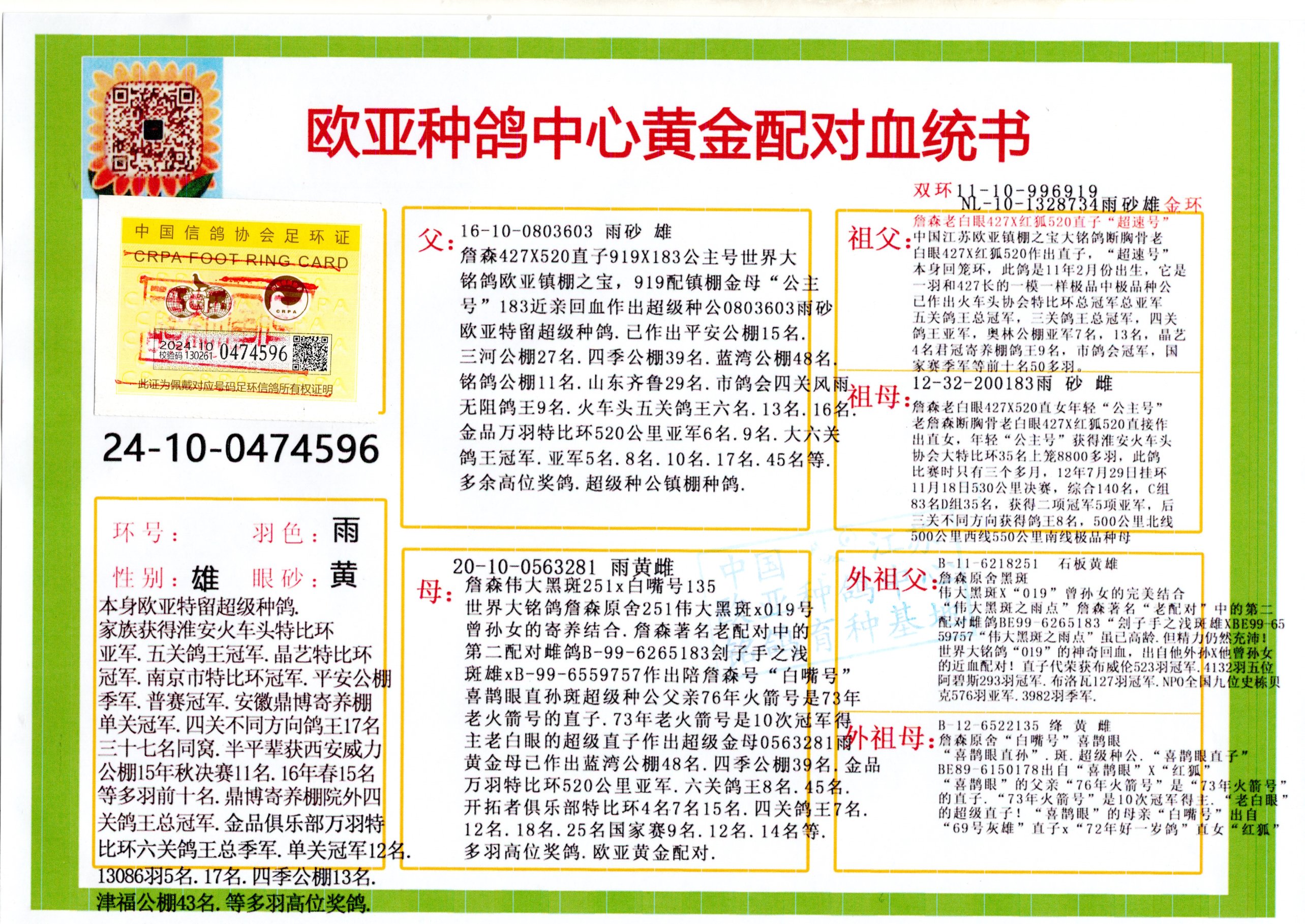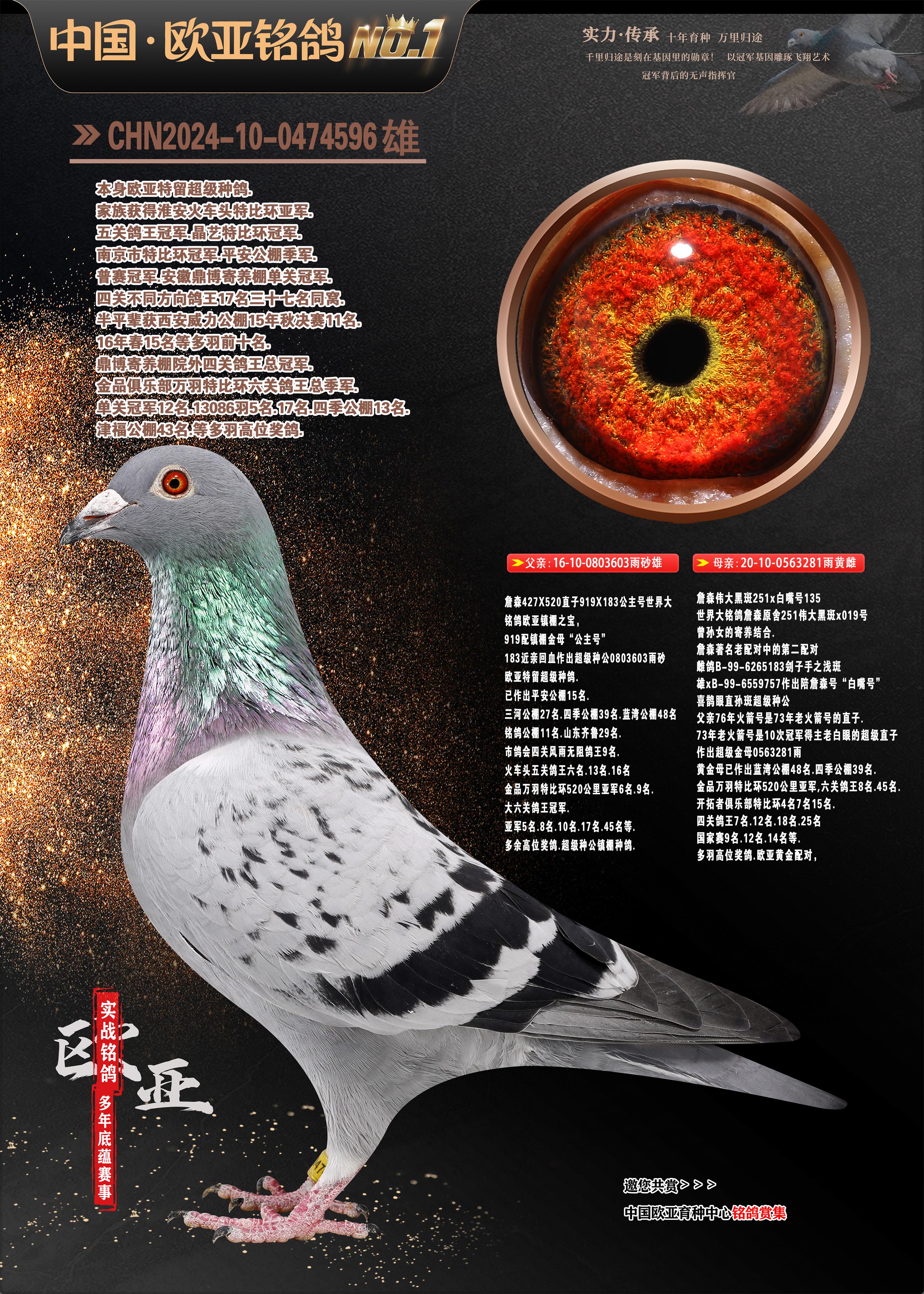 24年秋南京特比环欧亚荣获大团体冠军.小团体冠军551公里大特比13名.14名.16名.19名.20名.21名.24名.26名.27名.28名.42名.52名.54名.57名.65名.66名.68名.70名.71名.72名.74名.76名.80名.82名.83名.84名.85名.86名.90名.92名.110名.116名.121名.122名.128名.131名.158名.161名.164名.165名.166名.172名.174名.177名.182名.195名.196名.201名.205名.208名.210名.216名.253名.269名.275名.276名.294名.296名.299名,,24年秋云南天南铜都公棚决赛415名.天南铜都小棚决赛409名.云南玉活公棚决赛102名.490名.团体32名上笼二羽进二羽,天南铜都大棚506公里决赛445名。热烈祝贺河北省巨鹿县李兰生老师用欧亚泰山号血系连续十一年夺冠军,河北省国家赛冠军.全国季军等多次前十名高位,扬州王军王总用欧亚利奥24年春季获山东翔宇公棚决赛33名盖比53名。南京刘正龙刘总用欧亚盖比获得24年秋山东潍坊国际公棚决赛42名.精英赛30名.三关鸽王71名.决赛86名.加站赛16名.南京市特比环A组鸽王9名.B组鸽王5名.6名.C组鸽王5名.精英赛冠军4名.技能赛A组冠军4名.5名.秦淮区特比环荣获15名.46名.48名.87名。四川西昌徐亮徐总用欧亚利奥获得凉山州聚友决赛177名.第二关亚军双关鸽王19名.三关鸽王105名.云南豪庭公棚决赛603名。热烈祝贺24年四川重庆翔园鸽舍用欧亚泰山号荣获春季400公里冠军.秋季500公里冠军,河北王总用詹森X利奥获得千羽千翔公棚400公里冠军,广东蔡楷焕荣获24年秋爱好者 赛鸽俱乐部三关鸽王季军.一关420公里99名.二关450公里11名.三关520公里32名.单关季军.7名.12名,江西李卫兴荣获贵州红枫公棚8名.共翔俱乐部寄养棚四关综合鸽王30名.一关400公里78名.二关500公里55名.三关520公里37名.四关500公里57名.同父母获公棚18名.雷鸣获得武汉黄浦育翔中心冠军,四川陈文获得四川明鸿俱乐部300公里梦幻2名.3名.4名.9名.10名.13名.14名.15名.31名.34名.40名.41名.42名.43名.69名.71名.72名.73名.74名.94名.95名.97名.98名.99名.419公里决赛荣获总冠军7名.总共归巢9羽,四川徐亮获豪庭决赛603名,山西郑勇获得山西泰鑫公棚决赛255名詹森红狐,热烈祝贺马总获得开尔(飞跃队)决赛9名获奖金1310000万元.第一关52名,天津津福资赛180公里96名.获奖金429543万元,欧亚支持全国鸽友24年秋多人报喜 祝大家取得更好成绩,给欧亚报喜鸽友欧亚决定给每人赠送一羽超级种鸽。欧亚俱乐部特比环多关鸽王成绩:15年秋淮安特比环黑色星期一全会上笼9700多羽,当天无鸽归巢,第二天全会归巢357羽,本舍归巢158羽.前十名八羽.前一百名归巢57羽,16年春季获五关鸽王总冠军,总亚军四名.六名.七名.九名.十名.晶艺俱乐部520公里冠亚季军5名.6名.7名.9名.11名等,火车头冠军.季军6名.8名.9名.10名,16年秋晶艺俱乐部特比环520公里亚军.季军4名.6名.7名.9名,15年春南京白下特比环冠军.亚军.季军6名.7名.8名.9名.10名.指定鸽A B组获得冠军.亚军.季军4名.5名.,17年淮安特比环亚军.4名.5名.7名.8名.10名.六关鸽王总冠军.4名.6名.9名.10名,寄养棚宿迁刘总20羽特比环获冠军.季军.4名.7名.8名.9名等。18年荣获万羽特比环六关鸽王总冠军.总亚军.总季军.6名.8名.十名.单关四羽冠军.二羽亚军.四羽季军.前十名27羽。19年秋万羽特比环六关鸽王总亚军.总季军.5名.8名等,单关二羽冠军.三羽亚军.一羽季军前十名31羽。20年秋淮安市鸽会四关特比环大赛风雨无阻鸽王亚军.鸽王六名,金品俱乐部万羽特比环六关鸽王总冠军,总亚军.四名.五名.六名.七名.八名.十名.前二百名鸽王35羽,单关冠亚季军前十名四十多羽,火车头五关鸽王季军.六名.八名.前二百名鸽王十七羽。20年春荣获淮安五区一市四关鸽王总冠军.亚军.四名.八名.九名。21年秋荣获金品万羽特比环大赛六关鸽王总亚军.总季军.四名.七名.九名.十名.单关冠亚军季军前十名三十多羽。火车头协会鸽王六名.七名.十名.单关前十名十七羽。22年秋荣获鸽王总冠军.总亚军.5名.7名.8名.9名.11名.单关冠亚季军前十名三十多羽,第一关单关前二百名四十多羽,第二关前二百名三十多羽,第三关前二百名四十多羽,第四关前二百名四十多羽,第五关前一百名53羽。23年秋荣获鸽王季军.五名.八名.十名.13名.17名.20名.27名等多羽鸽王.单关前十名二十多羽。公棚.寄养棚部分成绩:16年秋宁夏黄河公棚总冠军电脑戈马力指定通炮冠军,17年送八羽参赛获得鸽王八名进奖四名,支持韩总荣获八名。支持鸽友荣获宁夏中卫公棚决赛总冠军.精英赛冠军,支持18年宁夏黄河公棚决赛冠军詹森X泰山。安徽鼎博寄养棚院内外四关鸽王总冠军.鸽王十七名.三十七名同窝,鸽王39名.42名.58名.67名。18年山东公棚预赛冠军.决赛65名.送八羽进奖五羽.指定获奔驰汽车一辆。支持鸽友获得云南蓝云公棚冠军.盖比X佛卡门。支持鸽友荣获云南银集公棚决赛冠军 詹森427X520血系 速度赛6700羽冠军。17年荣获金马俱乐部寄养棚四关鸽王总冠军.季军.六名.八名.第一关冠军.亚军.季军四名.七名.十一名.金牌教练奖。支持鸽友18年北京费翔公棚预赛九名电脑X桑杰士,支持鸽友荣获陕西威力公棚决赛11名.内蒙古临河寄养棚四关鸽王六名.詹森配泰山,支持河北王总用欧亚詹森427配胡本喜获20年秋开尔青年棚季军。云南东荣公棚16年预赛冠军.决赛77名.17年决赛12名.詹森红狐X泰山,17年平安公棚决赛4名 詹森427。欧亚获得21年金母寄养棚第一关四名.第二关5名.第三关5名.6名.7名.10名.三关鸽王总冠军,四关鸽王14名.十羽鸽王。支持河