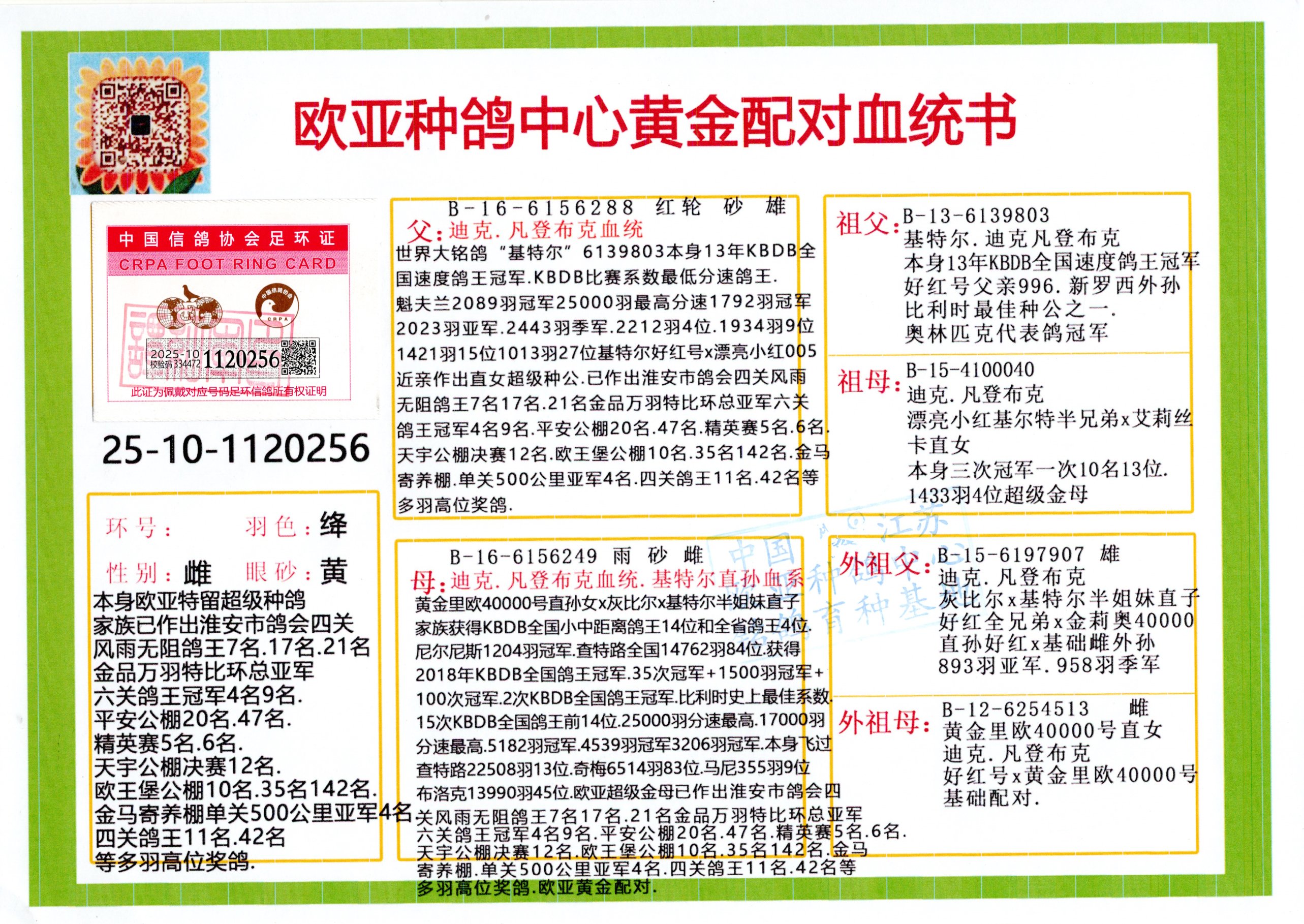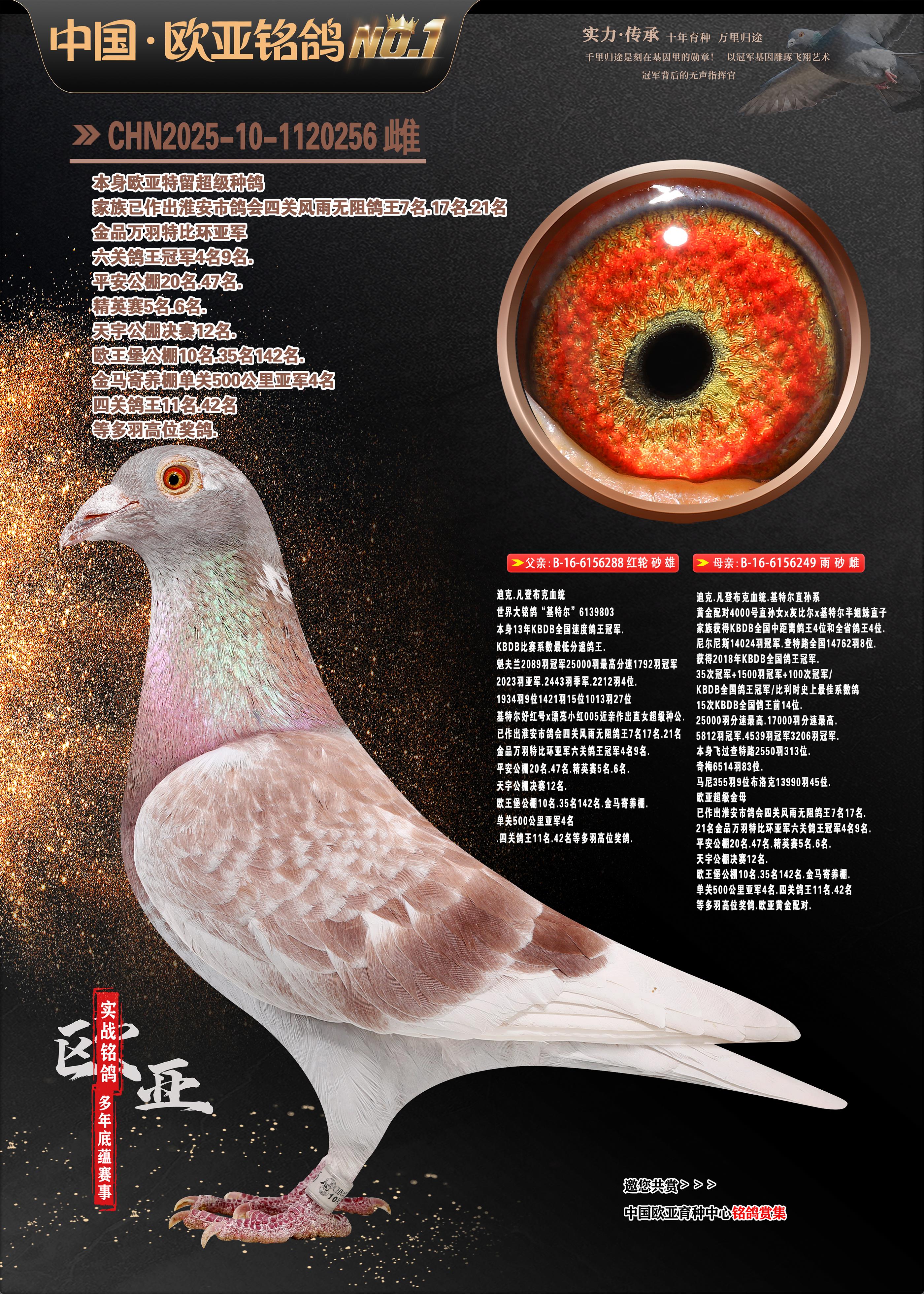 24年秋南京特比环欧亚荣获大团体冠军.小团体冠军551公里大特比13名.14名.16名.19名.20名.21名.24名.26名.27名.28名.42名.52名.54名.57名.65名.66名.68名.70名.71名.72名.74名.76名.80名.82名.83名.84名.85名.86名.90名.92名.110名.116名.121名.122名.128名.131名.158名.161名.164名.165名.166名.172名.174名.177名.182名.195名.196名.201名.205名.208名.210名.216名.253名.269名.275名.276名.294名.296名.299名,,24年秋云南天南铜都公棚决赛415名.天南铜都小棚决赛409名.云南玉活公棚决赛102名.490名.团体32名上笼二羽进二羽,天南铜都大棚506公里决赛445名。热烈祝贺河北省巨鹿县李兰生老师用欧亚泰山号血系连续十一年夺冠军,河北省国家赛冠军.全国季军等多次前十名高位,扬州王军王总用欧亚利奥24年春季获山东翔宇公棚决赛33名盖比53名。南京刘正龙刘总用欧亚盖比获得24年秋山东潍坊国际公棚决赛42名.精英赛30名.三关鸽王71名.决赛86名.加站赛16名.南京市特比环A组鸽王9名.B组鸽王5名.6名.C组鸽王5名.精英赛冠军4名.技能赛A组冠军4名.5名.秦淮区特比环荣获15名.46名.48名.87名。四川西昌徐亮徐总用欧亚利奥获得凉山州聚友决赛177名.第二关亚军双关鸽王19名.三关鸽王105名.云南豪庭公棚决赛603名。热烈祝贺24年四川重庆翔园鸽舍用欧亚泰山号荣获春季400公里冠军.秋季500公里冠军,河北王总用詹森X利奥获得千羽千翔公棚400公里冠军,广东蔡楷焕荣获24年秋爱好者 赛鸽俱乐部三关鸽王季军.一关420公里99名.二关450公里11名.三关520公里32名.单关季军.7名.12名,江西李卫兴荣获贵州红枫公棚8名.共翔俱乐部寄养棚四关综合鸽王30名.一关400公里78名.二关500公里55名.三关520公里37名.四关500公里57名.同父母获公棚18名.雷鸣获得武汉黄浦育翔中心冠军,四川陈文获得四川明鸿俱乐部300公里梦幻2名.3名.4名.9名.10名.13名.14名.15名.31名.34名.40名.41名.42名.43名.69名.71名.72名.73名.74名.94名.95名.97名.98名.99名.419公里决赛荣获总冠军7名.总共归巢9羽,四川徐亮获豪庭决赛603名,山西郑勇获得山西泰鑫公棚决赛255名詹森红狐,热烈祝贺马总获得开尔(飞跃队)决赛9名获奖金1310000万元.第一关52名,天津津福资赛180公里96名.获奖金429543万元,欧亚支持全国鸽友24年秋多人报喜 祝大家取得更好成绩,给欧亚报喜鸽友欧亚决定给每人赠送一羽超级种鸽。欧亚俱乐部特比环多关鸽王成绩:15年秋淮安特比环黑色星期一全会上笼9700多羽,当天无鸽归巢,第二天全会归巢357羽,本舍归巢158羽.前十名八羽.前一百名归巢57羽,16年春季获五关鸽王总冠军,总亚军四名.六名.七名.九名.十名.晶艺俱乐部520公里冠亚季军5名.6名.7名.9名.11名等,火车头冠军.季军6名.8名.9名.10名,16年秋晶艺俱乐部特比环520公里亚军.季军4名.6名.7名.9名,15年春南京白下特比环冠军.亚军.季军6名.7名.8名.9名.10名.指定鸽A B组获得冠军.亚军.季军4名.5名.,17年淮安特比环亚军.4名.5名.7名.8名.10名.六关鸽王总冠军.4名.6名.9名.10名,寄养棚宿迁刘总20羽特比环获冠军.季军.4名.7名.8名.9名等。18年荣获万羽特比环六关鸽王总冠军.总亚军.总季军.6名.8名.十名.单关四羽冠军.二羽亚军.四羽季军.前十名27羽。19年秋万羽特比环六关鸽王总亚军.总季军.5名.8名等,单关二羽冠军.三羽亚军.一羽季军前十名31羽。20年秋淮安市鸽会四关特比环大赛风雨无阻鸽王亚军.鸽王六名,金品俱乐部万羽特比环六关鸽王总冠军,总亚军.四名.五名.六名.七名.八名.十名.前二百名鸽王35羽,单关冠亚季军前十名四十多羽,火车头五关鸽王季军.六名.八名.前二百名鸽王十七羽。20年春荣获淮安五区一市四关鸽王总冠军.亚军.四名.八名.九名。21年秋荣获金品万羽特比环大赛六关鸽王总亚军.总季军.四名.七名.九名.十名.单关冠亚军季军前十名三十多羽。火车头协会鸽王六名.七名.十名.单关前十名十七羽。22年秋荣获鸽王总冠军.总亚军.5名.7名.8名.9名.11名.单关冠亚季军前十名三十多羽,第一关单关前二百名四十多羽,第二关前二百名三十多羽,第三关前二百名四十多羽,第四关前二百名四十多羽,第五关前一百名53羽。23年秋荣获鸽王季军.五名.八名.十名.13名.17名.20名.27名等多羽鸽王.单关前十名二十多羽。公棚.寄养棚部分成绩:16年秋宁夏黄河公棚总冠军电脑戈马力指定通炮冠军,17年送八羽参赛获得鸽王八名进奖四名,支持韩总荣获八名。支持鸽友荣获宁夏中卫公棚决赛总冠军.精英赛冠军,支持18年宁夏黄河公棚决赛冠军詹森X泰山。安徽鼎博寄养棚院内外四关鸽王总冠军.鸽王十七名.三十七名同窝,鸽王39名.42名.58名.67名。18年山东公棚预赛冠军.决赛65名.送八羽进奖五羽.指定获奔驰汽车一辆。支持鸽友获得云南蓝云公棚冠军.盖比X佛卡门。支持鸽友荣获云南银集公棚决赛冠军 詹森427X520血系 速度赛6700羽冠军。17年荣获金马俱乐部寄养棚四关鸽王总冠军.季军.六名.八名.第一关冠军.亚军.季军四名.七名.十一名.金牌教练奖。支持鸽友18年北京费翔公棚预赛九名电脑X桑杰士,支持鸽友荣获陕西威力公棚决赛11名.内蒙古临河寄养棚四关鸽王六名.詹森配泰山,支持河北王总用欧亚詹森427配胡本喜获20年秋开尔青年棚季军。云南东荣公棚16年预赛冠军.决赛77名.17年决赛12名.詹森红狐X泰山,17年平安公棚决赛4名 詹森427。欧亚获得21年金母寄养棚第一关四名.第二关5名.第三关5名.6名.7名.10名.三关鸽王总冠军,四关鸽王14名.十羽鸽王。支持河