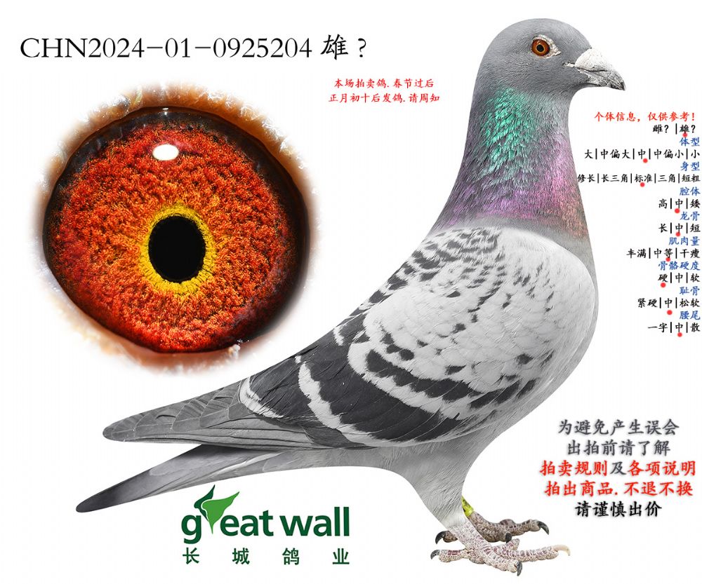 因拍卖鸽均是未做育过的种鸽或幼鸽,图内所标雌雄仅供参考,实际性别已实物为准。不做退换理由。