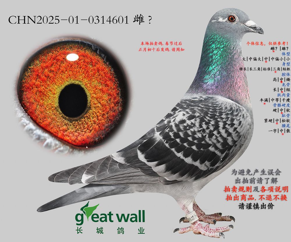因拍卖鸽均是未做育过的种鸽或幼鸽,图内所标雌雄仅供参考,实际性别已实物为准。不做退换理由。