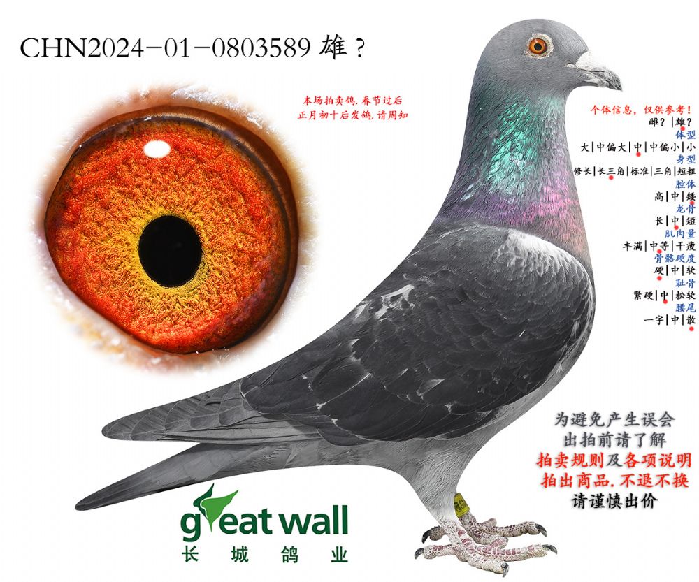 因拍卖鸽均是未做育过的种鸽或幼鸽,图内所标雌雄仅供参考,实际性别已实物为准。不做退换理由。