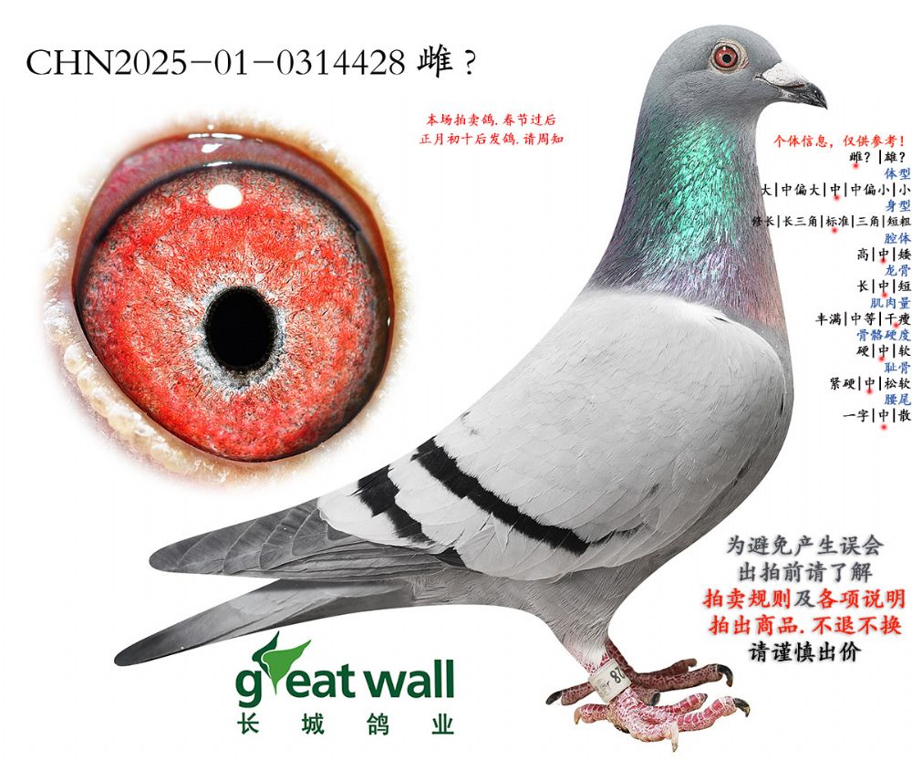 因拍卖鸽均是未做育过的种鸽或幼鸽,图内所标雌雄仅供参考,实际性别已实物为准。不做退换理由。