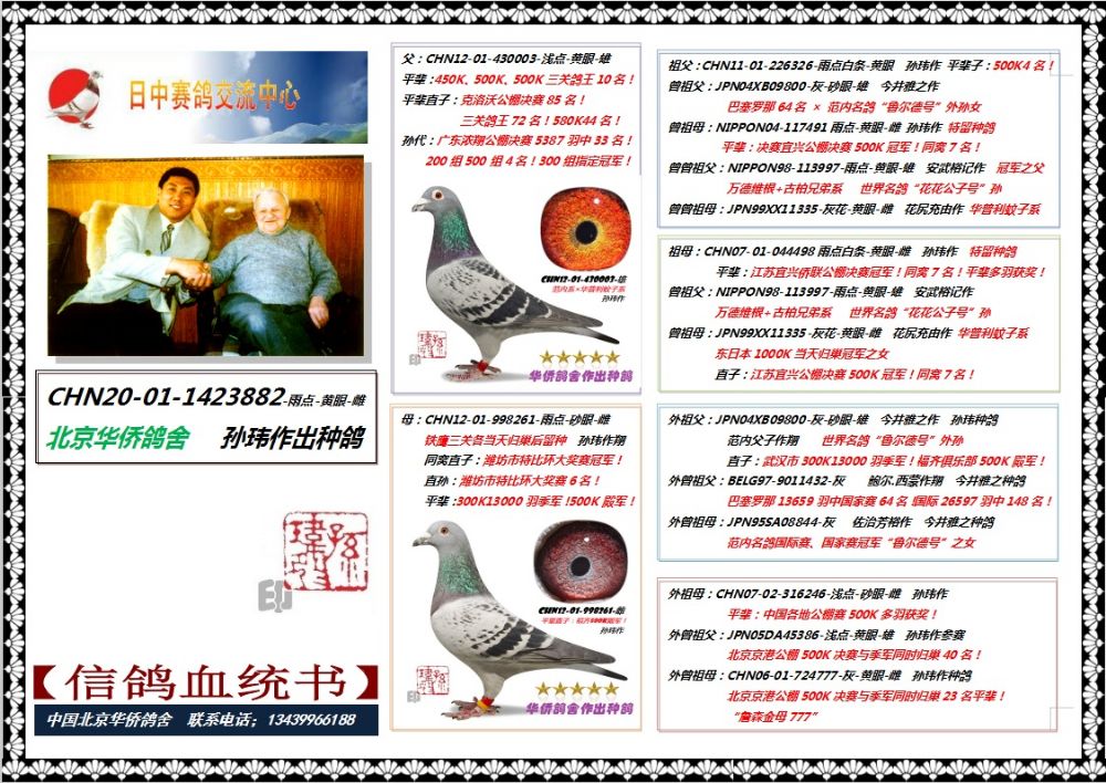 | 1652216 | 13号--“金翼奖”冠军白鼻号曾孙-0836946雄 | ¥1200元 | 0次 |