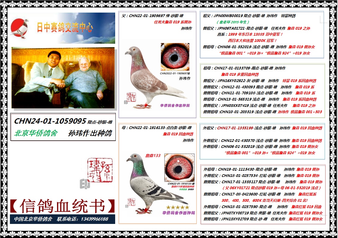 • 血统:詹森019系回血种鸽