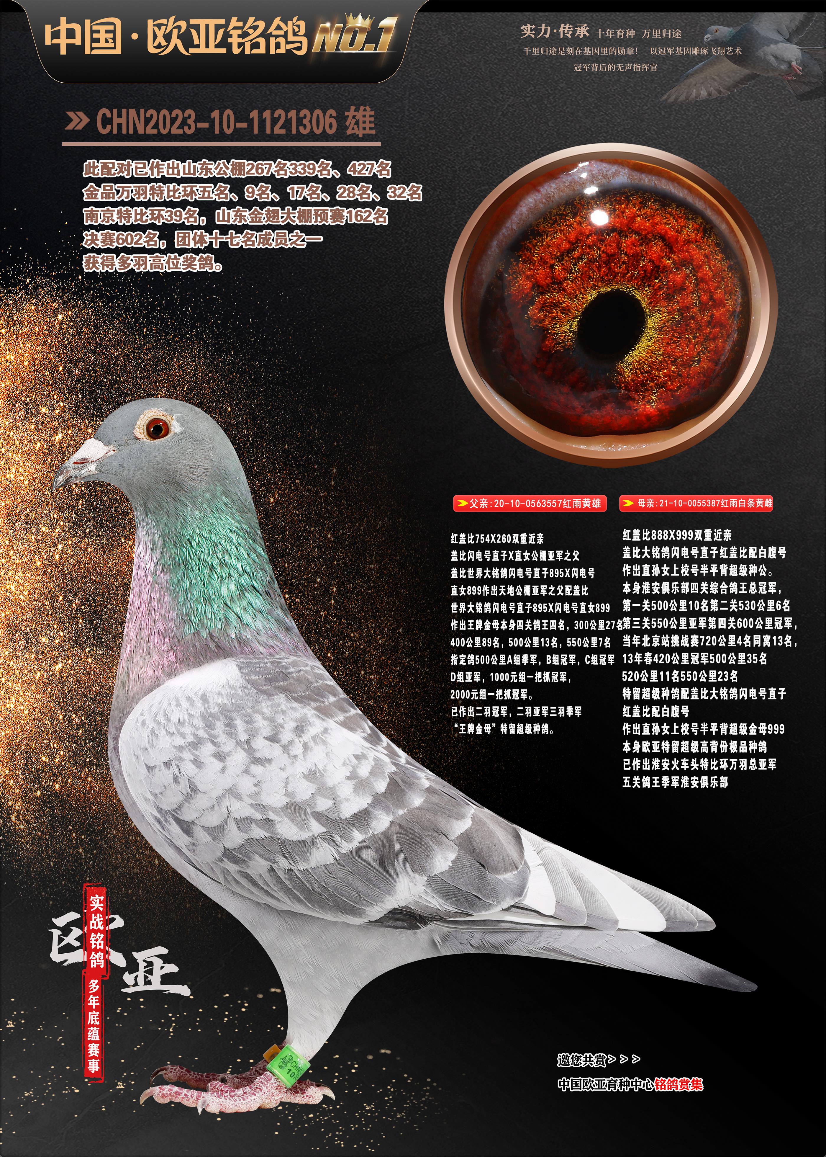24年秋南京特比环欧亚荣获大团体冠军.小团体冠军551公里大特比13名.14名.16名.19名.20名.21名.24名.26名.27名.28名.42名.52名.54名.57名.65名.66名.68名.70名.71名.72名.74名.76名.80名.82名.83名.84名.85名.86名.90名.92名.110名.116名.121名.122名.128名.131名.158名.161名.164名.165名.166名.172名.174名.177名.182名.195名.196名.201名.205名.208名.210名.216名.253名.269名.275名.276名.294名.296名.299名,,24年秋云南天南铜都公棚决赛415名.天南铜都小棚决赛409名.云南玉活公棚决赛102名.490名.团体32名上笼二羽进二羽,天南铜都大棚506公里决赛445名。热烈祝贺河北省巨鹿县李兰生老师用欧亚泰山号血系连续十一年夺冠军,河北省国家赛冠军.全国季军等多次前十名高位,扬州王军王总用欧亚利奥24年春季获山东翔宇公棚决赛33名盖比53名。南京刘正龙刘总用欧亚盖比获得24年秋山东潍坊国际公棚决赛42名.精英赛30名.三关鸽王71名.决赛86名.加站赛16名.南京市特比环A组鸽王9名.B组鸽王5名.6名.C组鸽王5名.精英赛冠军4名.技能赛A组冠军4名.5名.秦淮区特比环荣获15名.46名.48名.87名。四川西昌徐亮徐总用欧亚利奥获得凉山州聚友决赛177名.第二关亚军双关鸽王19名.三关鸽王105名.云南豪庭公棚决赛603名。热烈祝贺24年四川重庆翔园鸽舍用欧亚泰山号荣获春季400公里冠军.秋季500公里冠军,河北王总用詹森X利奥获得千羽千翔公棚400公里冠军,广东蔡楷焕荣获24年秋爱好者 赛鸽俱乐部三关鸽王季军.一关420公里99名.二关450公里11名.三关520公里32名.单关季军.7名.12名,江西李卫兴荣获贵州红枫公棚8名.共翔俱乐部寄养棚四关综合鸽王30名.一关400公里78名.二关500公里55名.三关520公里37名.四关500公里57名.同父母获公棚18名.雷鸣获得武汉黄浦育翔中心冠军,四川陈文获得四川明鸿俱乐部300公里梦幻2名.3名.4名.9名.10名.13名.14名.15名.31名.34名.40名.41名.42名.43名.69名.71名.72名.73名.74名.94名.95名.97名.98名.99名.419公里决赛荣获总冠军7名.总共归巢9羽,四川徐亮获豪庭决赛603名,山西郑勇获得山西泰鑫公棚决赛255名詹森红狐,热烈祝贺马总获得开尔(飞跃队)决赛9名获奖金1310000万元.第一关52名,天津津福资赛180公里96名.获奖金429543万元,欧亚支持全国鸽友24年秋多人报喜 祝大家取得更好成绩,给欧亚报喜鸽友欧亚决定给每人赠送一羽超级种鸽。欧亚俱乐部特比环多关鸽王成绩:15年秋淮安特比环黑色星期一全会上笼9700多羽,当天无鸽归巢,第二天全会归巢357羽,本舍归巢158羽.前十名八羽.前一百名归巢57羽,16年春季获五关鸽王总冠军,总亚军四名.六名.七名.九名.十名.晶艺俱乐部520公里冠亚季军5名.6名.7名.9名.11名等,火车头冠军.季军6名.8名.9名.10名,16年秋晶艺俱乐部特比环520公里亚军.季军4名.6名.7名.9名,15年春南京白下特比环冠军.亚军.季军6名.7名.8名.9名.10名.指定鸽A B组获得冠军.亚军.季军4名.5名.,17年淮安特比环亚军.4名.5名.7名.8名.10名.六关鸽王总冠军.4名.6名.9名.10名,寄养棚宿迁刘总20羽特比环获冠军.季军.4名.7名.8名.9名等。18年荣获万羽特比环六关鸽王总冠军.总亚军.总季军.6名.8名.十名.单关四羽冠军.二羽亚军.四羽季军.前十名27羽。19年秋万羽特比环六关鸽王总亚军.总季军.5名.8名等,单关二羽冠军.三羽亚军.一羽季军前十名31羽。20年秋淮安市鸽会四关特比环大赛风雨无阻鸽王亚军.鸽王六名,金品俱乐部万羽特比环六关鸽王总冠军,总亚军.四名.五名.六名.七名.八名.十名.前二百名鸽王35羽,单关冠亚季军前十名四十多羽,火车头五关鸽王季军.六名.八名.前二百名鸽王十七羽。20年春荣获淮安五区一市四关鸽王总冠军.亚军.四名.八名.九名。21年秋荣获金品万羽特比环大赛六关鸽王总亚军.总季军.四名.七名.九名.十名.单关冠亚军季军前十名三十多羽。火车头协会鸽王六名.七名.十名.单关前十名十七羽。22年秋荣获鸽王总冠军.总亚军.5名.7名.8名.9名.11名.单关冠亚季军前十名三十多羽,第一关单关前二百名四十多羽,第二关前二百名三十多羽,第三关前二百名四十多羽,第四关前二百名四十多羽,第五关前一百名53羽。23年秋荣获鸽王季军.五名.八名.十名.13名.17名.20名.27名等多羽鸽王.单关前十名二十多羽。公棚.寄养棚部分成绩:16年秋宁夏黄河公棚总冠军电脑戈马力指定通炮冠军,17年送八羽参赛获得鸽王八名进奖四名,支持韩总荣获八名。支持鸽友荣获宁夏中卫公棚决赛总冠军.精英赛冠军,支持18年宁夏黄河公棚决赛冠军詹森X泰山。安徽鼎博寄养棚院内外四关鸽王总冠军.鸽王十七名.三十七名同窝,鸽王39名.42名.58名.67名。18年山东公棚预赛冠军.决赛65名.送八羽进奖五羽.指定获奔驰汽车一辆。支持鸽友获得云南蓝云公棚冠军.盖比X佛卡门。支持鸽友荣获云南银集公棚决赛冠军 詹森427X520血系 速度赛6700羽冠军。17年荣获金马俱乐部寄养棚四关鸽王总冠军.季军.六名.八名.第一关冠军.亚军.季军四名.七名.十一名.金牌教练奖。支持鸽友18年北京费翔公棚预赛九名电脑X桑杰士,支持鸽友荣获陕西威力公棚决赛11名.内蒙古临河寄养棚四关鸽王六名.詹森配泰山,支持河北王总用欧亚詹森427配胡本喜获20年秋开尔青年棚季军。云南东荣公棚16年预赛冠军.决赛77名.17年决赛12名.詹森红狐X泰山,17年平安公棚决赛4名 詹森427。欧亚获得21年金母寄养棚第一关四名.第二关5名.第三关5名.6名.7名.10名.三关鸽王总冠军,四关鸽王14名.十羽鸽王。支持河