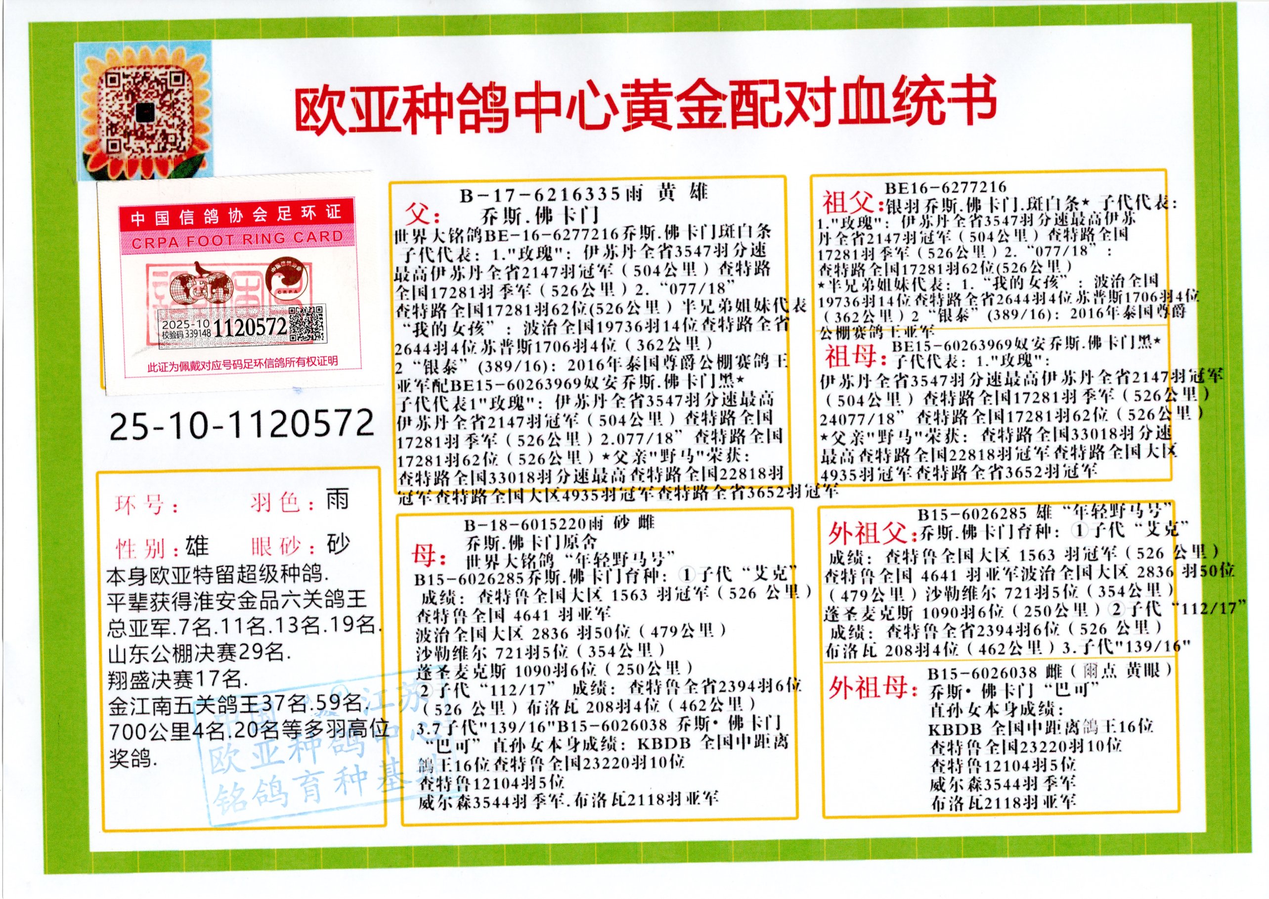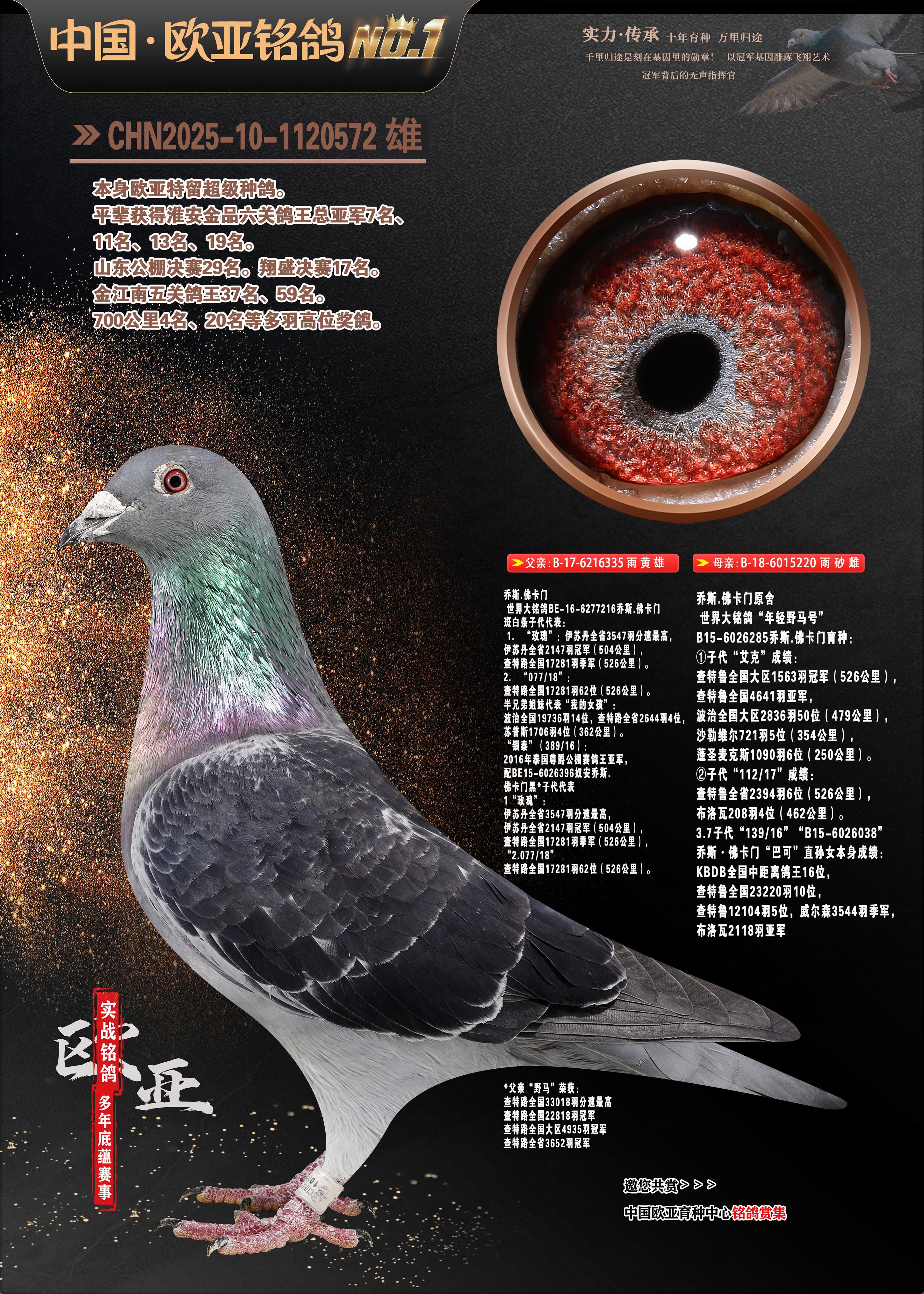 24年秋南京特比环欧亚荣获大团体冠军.小团体冠军551公里大特比13名.14名.16名.19名.20名.21名.24名.26名.27名.28名.42名.52名.54名.57名.65名.66名.68名.70名.71名.72名.74名.76名.80名.82名.83名.84名.85名.86名.90名.92名.110名.116名.121名.122名.128名.131名.158名.161名.164名.165名.166名.172名.174名.177名.182名.195名.196名.201名.205名.208名.210名.216名.253名.269名.275名.276名.294名.296名.299名,,24年秋云南天南铜都公棚决赛415名.天南铜都小棚决赛409名.云南玉活公棚决赛102名.490名.团体32名上笼二羽进二羽,天南铜都大棚506公里决赛445名。热烈祝贺河北省巨鹿县李兰生老师用欧亚泰山号血系连续十一年夺冠军,河北省国家赛冠军.全国季军等多次前十名高位,扬州王军王总用欧亚利奥24年春季获山东翔宇公棚决赛33名盖比53名。南京刘正龙刘总用欧亚盖比获得24年秋山东潍坊国际公棚决赛42名.精英赛30名.三关鸽王71名.决赛86名.加站赛16名.南京市特比环A组鸽王9名.B组鸽王5名.6名.C组鸽王5名.精英赛冠军4名.技能赛A组冠军4名.5名.秦淮区特比环荣获15名.46名.48名.87名。四川西昌徐亮徐总用欧亚利奥获得凉山州聚友决赛177名.第二关亚军双关鸽王19名.三关鸽王105名.云南豪庭公棚决赛603名。热烈祝贺24年四川重庆翔园鸽舍用欧亚泰山号荣获春季400公里冠军.秋季500公里冠军,河北王总用詹森X利奥获得千羽千翔公棚400公里冠军,广东蔡楷焕荣获24年秋爱好者 赛鸽俱乐部三关鸽王季军.一关420公里99名.二关450公里11名.三关520公里32名.单关季军.7名.12名,江西李卫兴荣获贵州红枫公棚8名.共翔俱乐部寄养棚四关综合鸽王30名.一关400公里78名.二关500公里55名.三关520公里37名.四关500公里57名.同父母获公棚18名.雷鸣获得武汉黄浦育翔中心冠军,四川陈文获得四川明鸿俱乐部300公里梦幻2名.3名.4名.9名.10名.13名.14名.15名.31名.34名.40名.41名.42名.43名.69名.71名.72名.73名.74名.94名.95名.97名.98名.99名.419公里决赛荣获总冠军7名.总共归巢9羽,四川徐亮获豪庭决赛603名,山西郑勇获得山西泰鑫公棚决赛255名詹森红狐,热烈祝贺马总获得开尔(飞跃队)决赛9名获奖金1310000万元.第一关52名,天津津福资赛180公里96名.获奖金429543万元,欧亚支持全国鸽友24年秋多人报喜 祝大家取得更好成绩,给欧亚报喜鸽友欧亚决定给每人赠送一羽超级种鸽。欧亚俱乐部特比环多关鸽王成绩:15年秋淮安特比环黑色星期一全会上笼9700多羽,当天无鸽归巢,第二天全会归巢357羽,本舍归巢158羽.前十名八羽.前一百名归巢57羽,16年春季获五关鸽王总冠军,总亚军四名.六名.七名.九名.十名.晶艺俱乐部520公里冠亚季军5名.6名.7名.9名.11名等,火车头冠军.季军6名.8名.9名.10名,16年秋晶艺俱乐部特比环520公里亚军.季军4名.6名.7名.9名,15年春南京白下特比环冠军.亚军.季军6名.7名.8名.9名.10名.指定鸽A B组获得冠军.亚军.季军4名.5名.,17年淮安特比环亚军.4名.5名.7名.8名.10名.六关鸽王总冠军.4名.6名.9名.10名,寄养棚宿迁刘总20羽特比环获冠军.季军.4名.7名.8名.9名等。18年荣获万羽特比环六关鸽王总冠军.总亚军.总季军.6名.8名.十名.单关四羽冠军.二羽亚军.四羽季军.前十名27羽。19年秋万羽特比环六关鸽王总亚军.总季军.5名.8名等,单关二羽冠军.三羽亚军.一羽季军前十名31羽。20年秋淮安市鸽会四关特比环大赛风雨无阻鸽王亚军.鸽王六名,金品俱乐部万羽特比环六关鸽王总冠军,总亚军.四名.五名.六名.七名.八名.十名.前二百名鸽王35羽,单关冠亚季军前十名四十多羽,火车头五关鸽王季军.六名.八名.前二百名鸽王十七羽。20年春荣获淮安五区一市四关鸽王总冠军.亚军.四名.八名.九名。21年秋荣获金品万羽特比环大赛六关鸽王总亚军.总季军.四名.七名.九名.十名.单关冠亚军季军前十名三十多羽。火车头协会鸽王六名.七名.十名.单关前十名十七羽。22年秋荣获鸽王总冠军.总亚军.5名.7名.8名.9名.11名.单关冠亚季军前十名三十多羽,第一关单关前二百名四十多羽,第二关前二百名三十多羽,第三关前二百名四十多羽,第四关前二百名四十多羽,第五关前一百名53羽。23年秋荣获鸽王季军.五名.八名.十名.13名.17名.20名.27名等多羽鸽王.单关前十名二十多羽。公棚.寄养棚部分成绩:16年秋宁夏黄河公棚总冠军电脑戈马力指定通炮冠军,17年送八羽参赛获得鸽王八名进奖四名,支持韩总荣获八名。支持鸽友荣获宁夏中卫公棚决赛总冠军.精英赛冠军,支持18年宁夏黄河公棚决赛冠军詹森X泰山。安徽鼎博寄养棚院内外四关鸽王总冠军.鸽王十七名.三十七名同窝,鸽王39名.42名.58名.67名。18年山东公棚预赛冠军.决赛65名.送八羽进奖五羽.指定获奔驰汽车一辆。支持鸽友获得云南蓝云公棚冠军.盖比X佛卡门。支持鸽友荣获云南银集公棚决赛冠军 詹森427X520血系 速度赛6700羽冠军。17年荣获金马俱乐部寄养棚四关鸽王总冠军.季军.六名.八名.第一关冠军.亚军.季军四名.七名.十一名.金牌教练奖。支持鸽友18年北京费翔公棚预赛九名电脑X桑杰士,支持鸽友荣获陕西威力公棚决赛11名.内蒙古临河寄养棚四关鸽王六名.詹森配泰山,支持河北王总用欧亚詹森427配胡本喜获20年秋开尔青年棚季军。云南东荣公棚16年预赛冠军.决赛77名.17年决赛12名.詹森红狐X泰山,17年平安公棚决赛4名 詹森427。欧亚获得21年金母寄养棚第一关四名.第二关5名.第三关5名.6名.7名.10名.三关鸽王总冠军,四关鸽王14名.十羽鸽王。支持河