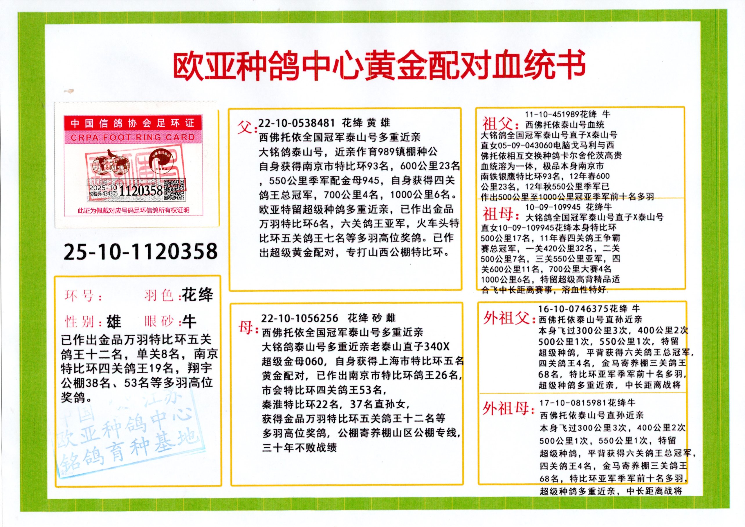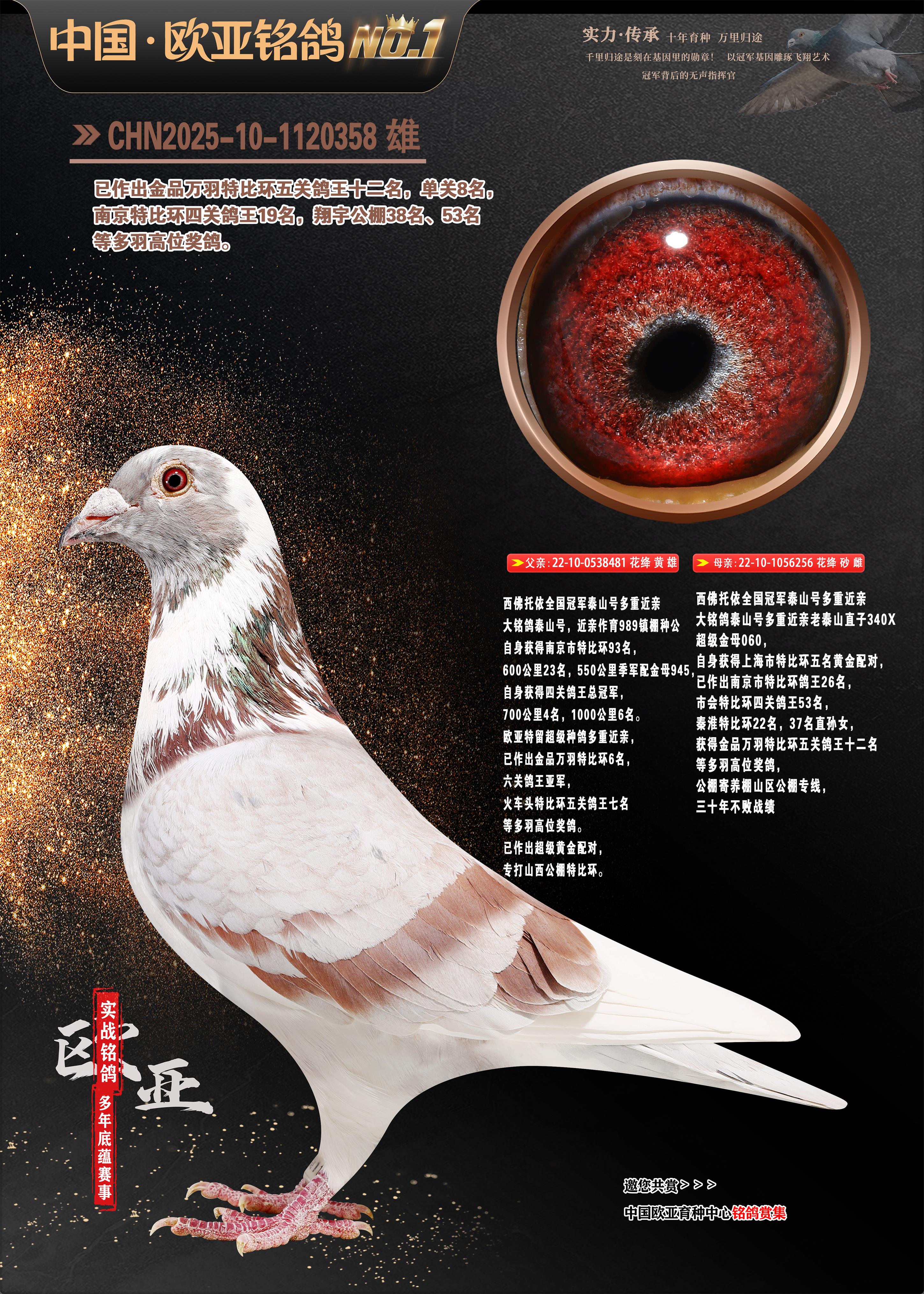 24年秋南京特比环欧亚荣获大团体冠军.小团体冠军551公里大特比13名.14名.16名.19名.20名.21名.24名.26名.27名.28名.42名.52名.54名.57名.65名.66名.68名.70名.71名.72名.74名.76名.80名.82名.83名.84名.85名.86名.90名.92名.110名.116名.121名.122名.128名.131名.158名.161名.164名.165名.166名.172名.174名.177名.182名.195名.196名.201名.205名.208名.210名.216名.253名.269名.275名.276名.294名.296名.299名,,24年秋云南天南铜都公棚决赛415名.天南铜都小棚决赛409名.云南玉活公棚决赛102名.490名.团体32名上笼二羽进二羽,天南铜都大棚506公里决赛445名。热烈祝贺河北省巨鹿县李兰生老师用欧亚泰山号血系连续十一年夺冠军,河北省国家赛冠军.全国季军等多次前十名高位,扬州王军王总用欧亚利奥24年春季获山东翔宇公棚决赛33名盖比53名。南京刘正龙刘总用欧亚盖比获得24年秋山东潍坊国际公棚决赛42名.精英赛30名.三关鸽王71名.决赛86名.加站赛16名.南京市特比环A组鸽王9名.B组鸽王5名.6名.C组鸽王5名.精英赛冠军4名.技能赛A组冠军4名.5名.秦淮区特比环荣获15名.46名.48名.87名。四川西昌徐亮徐总用欧亚利奥获得凉山州聚友决赛177名.第二关亚军双关鸽王19名.三关鸽王105名.云南豪庭公棚决赛603名。热烈祝贺24年四川重庆翔园鸽舍用欧亚泰山号荣获春季400公里冠军.秋季500公里冠军,河北王总用詹森X利奥获得千羽千翔公棚400公里冠军,广东蔡楷焕荣获24年秋爱好者 赛鸽俱乐部三关鸽王季军.一关420公里99名.二关450公里11名.三关520公里32名.单关季军.7名.12名,江西李卫兴荣获贵州红枫公棚8名.共翔俱乐部寄养棚四关综合鸽王30名.一关400公里78名.二关500公里55名.三关520公里37名.四关500公里57名.同父母获公棚18名.雷鸣获得武汉黄浦育翔中心冠军,四川陈文获得四川明鸿俱乐部300公里梦幻2名.3名.4名.9名.10名.13名.14名.15名.31名.34名.40名.41名.42名.43名.69名.71名.72名.73名.74名.94名.95名.97名.98名.99名.419公里决赛荣获总冠军7名.总共归巢9羽,四川徐亮获豪庭决赛603名,山西郑勇获得山西泰鑫公棚决赛255名詹森红狐,热烈祝贺马总获得开尔(飞跃队)决赛9名获奖金1310000万元.第一关52名,天津津福资赛180公里96名.获奖金429543万元,欧亚支持全国鸽友24年秋多人报喜 祝大家取得更好成绩,给欧亚报喜鸽友欧亚决定给每人赠送一羽超级种鸽。欧亚俱乐部特比环多关鸽王成绩:15年秋淮安特比环黑色星期一全会上笼9700多羽,当天无鸽归巢,第二天全会归巢357羽,本舍归巢158羽.前十名八羽.前一百名归巢57羽,16年春季获五关鸽王总冠军,总亚军四名.六名.七名.九名.十名.晶艺俱乐部520公里冠亚季军5名.6名.7名.9名.11名等,火车头冠军.季军6名.8名.9名.10名,16年秋晶艺俱乐部特比环520公里亚军.季军4名.6名.7名.9名,15年春南京白下特比环冠军.亚军.季军6名.7名.8名.9名.10名.指定鸽A B组获得冠军.亚军.季军4名.5名.,17年淮安特比环亚军.4名.5名.7名.8名.10名.六关鸽王总冠军.4名.6名.9名.10名,寄养棚宿迁刘总20羽特比环获冠军.季军.4名.7名.8名.9名等。18年荣获万羽特比环六关鸽王总冠军.总亚军.总季军.6名.8名.十名.单关四羽冠军.二羽亚军.四羽季军.前十名27羽。19年秋万羽特比环六关鸽王总亚军.总季军.5名.8名等,单关二羽冠军.三羽亚军.一羽季军前十名31羽。20年秋淮安市鸽会四关特比环大赛风雨无阻鸽王亚军.鸽王六名,金品俱乐部万羽特比环六关鸽王总冠军,总亚军.四名.五名.六名.七名.八名.十名.前二百名鸽王35羽,单关冠亚季军前十名四十多羽,火车头五关鸽王季军.六名.八名.前二百名鸽王十七羽。20年春荣获淮安五区一市四关鸽王总冠军.亚军.四名.八名.九名。21年秋荣获金品万羽特比环大赛六关鸽王总亚军.总季军.四名.七名.九名.十名.单关冠亚军季军前十名三十多羽。火车头协会鸽王六名.七名.十名.单关前十名十七羽。22年秋荣获鸽王总冠军.总亚军.5名.7名.8名.9名.11名.单关冠亚季军前十名三十多羽,第一关单关前二百名四十多羽,第二关前二百名三十多羽,第三关前二百名四十多羽,第四关前二百名四十多羽,第五关前一百名53羽。23年秋荣获鸽王季军.五名.八名.十名.13名.17名.20名.27名等多羽鸽王.单关前十名二十多羽。公棚.寄养棚部分成绩:16年秋宁夏黄河公棚总冠军电脑戈马力指定通炮冠军,17年送八羽参赛获得鸽王八名进奖四名,支持韩总荣获八名。支持鸽友荣获宁夏中卫公棚决赛总冠军.精英赛冠军,支持18年宁夏黄河公棚决赛冠军詹森X泰山。安徽鼎博寄养棚院内外四关鸽王总冠军.鸽王十七名.三十七名同窝,鸽王39名.42名.58名.67名。18年山东公棚预赛冠军.决赛65名.送八羽进奖五羽.指定获奔驰汽车一辆。支持鸽友获得云南蓝云公棚冠军.盖比X佛卡门。支持鸽友荣获云南银集公棚决赛冠军 詹森427X520血系 速度赛6700羽冠军。17年荣获金马俱乐部寄养棚四关鸽王总冠军.季军.六名.八名.第一关冠军.亚军.季军四名.七名.十一名.金牌教练奖。支持鸽友18年北京费翔公棚预赛九名电脑X桑杰士,支持鸽友荣获陕西威力公棚决赛11名.内蒙古临河寄养棚四关鸽王六名.詹森配泰山,支持河北王总用欧亚詹森427配胡本喜获20年秋开尔青年棚季军。云南东荣公棚16年预赛冠军.决赛77名.17年决赛12名.詹森红狐X泰山,17年平安公棚决赛4名 詹森427。欧亚获得21年金母寄养棚第一关四名.第二关5名.第三关5名.6名.7名.10名.三关鸽王总冠军,四关鸽王14名.十羽鸽王。支持河