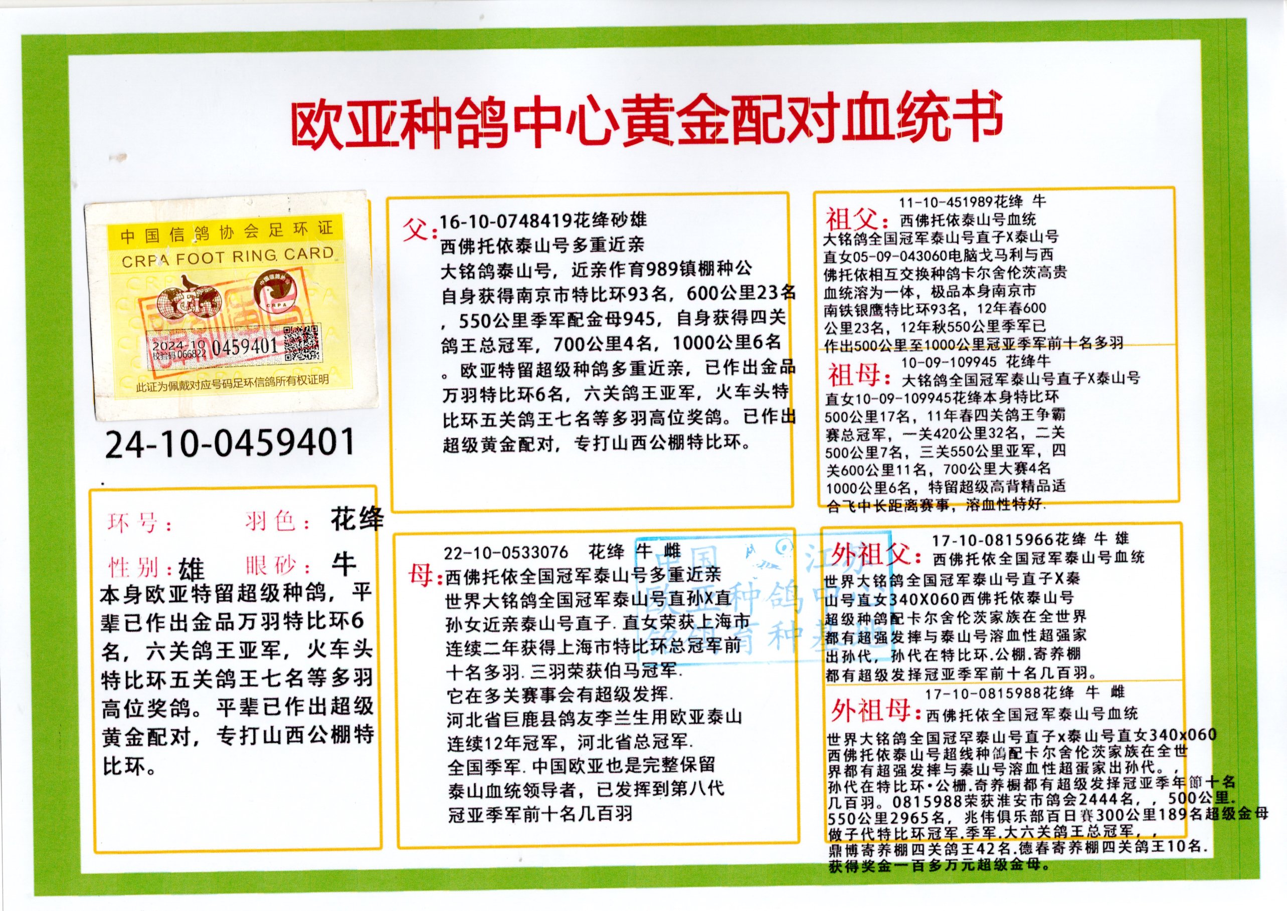 - 当前查看拍卖鸽:西佛依托全国冠军泰山号多重近亲419X0