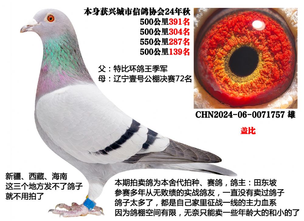 - 当前查看拍卖鸽:特比环鸽王季军X辽宁壹号公棚决赛72名(