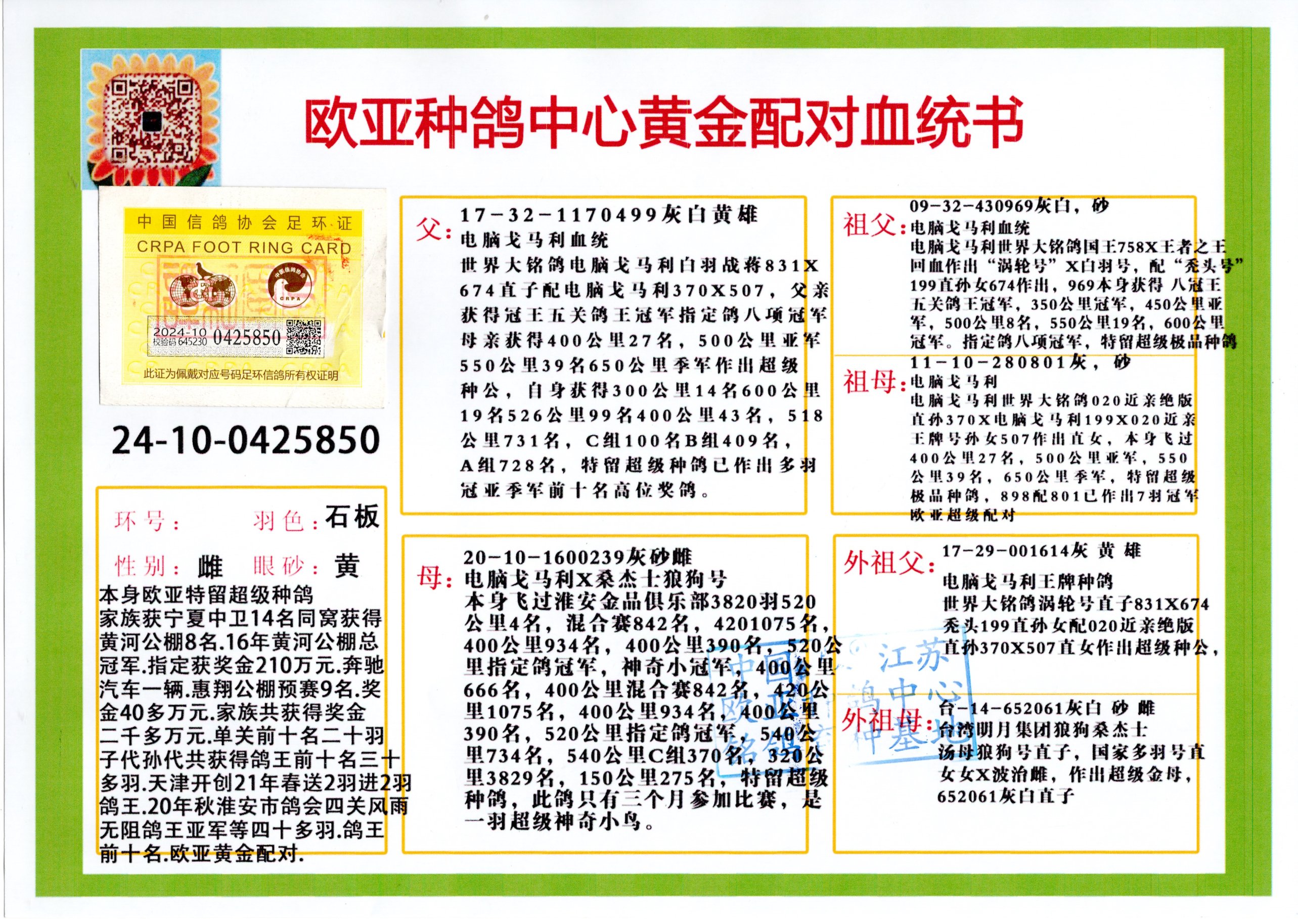 24年秋南京特比环欧亚荣获大团体冠军.小团体冠军551公里大特比13名.14名.16名.19名.20名.21名.24名.26名.27名.28名.42名.52名.54名.57名.65名.66名.68名.70名.71名.72名.74名.76名.80名.82名.83名.84名.85名.86名.90名.92名.110名.116名.121名.122名.128名.131名.158名.161名.164名.165名.166名.172名.174名.177名.182名.195名.196名.201名.205名.208名.210名.216名.253名.269名.275名.276名.294名.296名.299名,,24年秋云南天南铜都公棚决赛415名.天南铜都小棚决赛409名.云南玉活公棚决赛102名.490名.团体32名上笼二羽进二羽,天南铜都大棚506公里决赛445名。热烈祝贺河北省巨鹿县李兰生老师用欧亚泰山号血系连续十一年夺冠军,河北省国家赛冠军.全国季军等多次前十名高位,扬州王军王总用欧亚利奥24年春季获山东翔宇公棚决赛33名盖比53名。南京刘正龙刘总用欧亚盖比获得24年秋山东潍坊国际公棚决赛42名.精英赛30名.三关鸽王71名.决赛86名.加站赛16名.南京市特比环A组鸽王9名.B组鸽王5名.6名.C组鸽王5名.精英赛冠军4名.技能赛A组冠军4名.5名.秦淮区特比环荣获15名.46名.48名.87名。四川西昌徐亮徐总用欧亚利奥获得凉山州聚友决赛177名.第二关亚军双关鸽王19名.三关鸽王105名.云南豪庭A公棚决赛603名。热烈祝贺24年四川重庆翔园鸽舍用欧亚泰山号荣获春季400公里冠军.秋季500公里冠军,河北王总用詹森X利奥获得千羽千翔公棚400公里冠军,广东蔡楷焕荣获24年秋爱好者 赛鸽俱乐部三关鸽王季军.一关420公里99名.二关450公里11名.三关520公里32名.单关季军.7名.12名,江西李卫兴荣获贵州红枫公棚8名.共翔俱乐部寄养棚四关综合鸽王30名.一关400公里78名.二关500公里55名.三关520公里37名.四关500公里57名.同父母获公棚18名.雷鸣获得武汉黄浦育翔中心冠军,四川陈文获得四川明鸿俱乐部300公里梦幻2名.3名.4名.9名.10名.13名.14名.15名.31名.34名.40名.41名.42名.43名.69名.71名.72名.73名.74名.94名.95名.97名.98名.99名.419公里决赛荣获总冠军7名.总共归巢9羽,四川徐亮获豪庭决赛603名,山西郑勇获得山西泰鑫公棚决赛255名詹森红狐,热烈祝贺马总获得开尔(飞跃队)决赛9名获奖金1310000万元.第一关52名,天津津福资赛180公里96名.获奖金429543万元,欧亚支持全国鸽友24年秋多人报喜 祝大家取得更好成绩,给欧亚报喜鸽友欧亚决定给每人赠送一羽超级种鸽。欧亚俱乐部特比环多关鸽王成绩:15年秋淮安特比环黑色星期一全会上笼9700多羽,当天无鸽归巢,第二天全会归巢357羽,本舍归巢158羽.前十名八羽.前一百名归巢57羽,16年春季获五关鸽王总冠军,总亚军四名.六名.七名.九名.十名.晶艺俱乐部520公里冠亚季军5名.6名.7名.9名.11名等,火车头冠军.季军6名.8名.9名.10名,16年秋晶艺俱乐部特比环520公里亚军.季军4名.6名.7名.9名,15年春南京白下特比环冠军.亚军.季军6名.7名.8名.9名.10名.指定鸽A B组获得冠军.亚军.季军4名.5名.,17年淮安特比环亚军.4名.5名.7名.8名.10名.六关鸽王总冠军.4名.6名.9名.10名,寄养棚宿迁刘总20羽特比环获冠军.季军.4名.7名.8名.9名等。18年荣获万羽特比环六关鸽王总冠军.总亚军.总季军.6名.8名.十名.单关四羽冠军.二羽亚军.四羽季军.前十名27羽。19年秋万羽特比环六关鸽王总亚军.总季军.5名.8名等,单关二羽冠军.三羽亚军.一羽季军前十名31羽。20年秋淮安市鸽会四关特比环大赛风雨无阻鸽王亚军.鸽王六名,金品俱乐部万羽特比环六关鸽王总冠军,总亚军.四名.五名.六名.七名.八名.十名.前二百名鸽王35羽,单关冠亚季军前十名四十多羽,火车头五关鸽王季军.六名.八名.前二百名鸽王十七羽。20年春荣获淮安五区一市四关鸽王总冠军.亚军.四名.八名.九名。21年秋荣获金品万羽特比环大赛六关鸽王总亚军.总季军.四名.七名.九名.十名.单关冠亚军季军前十名三十多羽。火车头协会鸽王六名.七名.十名.单关前十名十七羽。22年秋荣获鸽王总冠军.总亚军.5名.7名.8名.9名.11名.单关冠亚季军前十名三十多羽,第一关单关前二百名四十多羽,第二关前二百名三十多羽,第三关前二百名四十多羽,第四关前二百名四十多羽,第五关前一百名53羽。23年秋荣获鸽王季军.五名.八名.十名.13名.17名.20名.27名等多羽鸽王.单关前十名二十多羽。公棚.寄养棚部分成绩:16年秋宁夏黄河公棚总冠军电脑戈马力指定通炮冠军,17年送八羽参赛获得鸽王八名进奖四名,支持韩总荣获八名。支持鸽友荣获宁夏中卫公棚决赛总冠军.精英赛冠军,支持18年宁夏黄河公棚决赛冠军詹森X泰山。安徽鼎博寄养棚院内外四关鸽王总冠军.鸽王十七名.三十七名同窝,鸽王39名.42名.58名.67名。18年山东公棚预赛冠军.决赛65名.送八羽进奖五羽.指定获奔驰汽车一辆。支持鸽友获得云南蓝云公棚冠军.盖比X佛卡门。支持鸽友荣获云南银集公棚决赛冠军 詹森427X520血系 速度赛6700羽冠军。17年荣获金马俱乐部寄养棚四关鸽王总冠军.季军.六名.八名.第一关冠军.亚军.季军四名.七名.十一名.金牌教练奖。支持鸽友18年北京费翔公棚预赛九名电脑X桑杰士,支持鸽友荣获陕西威力公棚决赛11名.内蒙古临河寄养棚四关鸽王六名.詹森配泰山,支持河北王总用欧亚詹森427配胡本喜获20年秋开尔青年棚季军。云南东荣公棚16年预赛冠军.决赛77名.17年决赛12名.詹森红狐X泰山,17年平安公棚决赛4名 詹森427。欧亚获得21年金母寄养棚第一关四名.第二关5名.第三关5名.6名.7名.10名.三关鸽王总冠军,四关鸽王14名.十羽鸽王。支持