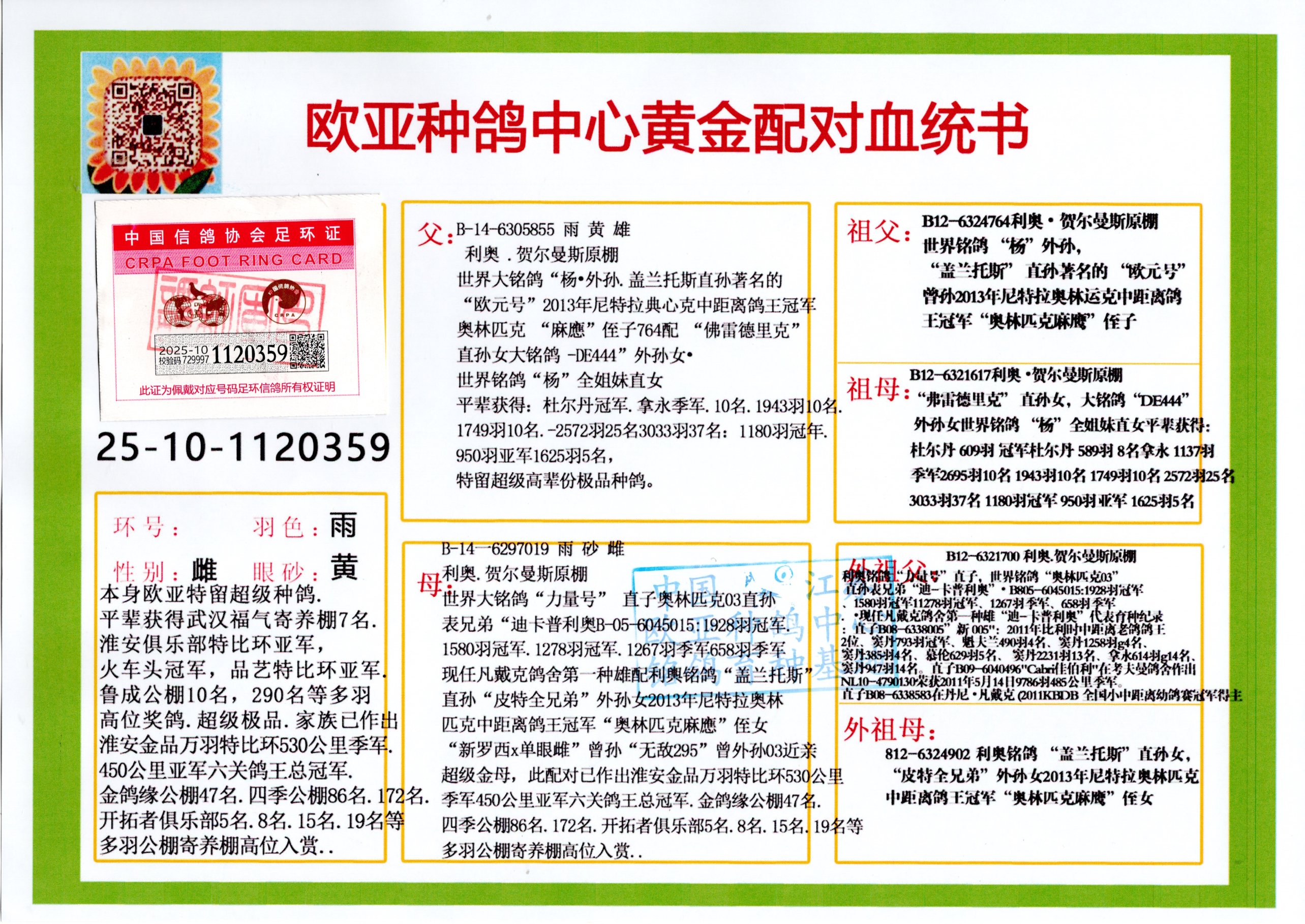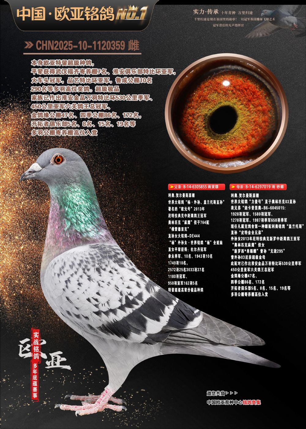 24年秋南京特比环欧亚荣获大团体冠军.小团体冠军551公里大特比13名.14名.16名.19名.20名.21名.24名.26名.27名.28名.42名.52名.54名.57名.65名.66名.68名.70名.71名.72名.74名.76名.80名.82名.83名.84名.85名.86名.90名.92名.110名.116名.121名.122名.128名.131名.158名.161名.164名.165名.166名.172名.174名.177名.182名.195名.196名.201名.205名.208名.210名.216名.253名.269名.275名.276名.294名.296名.299名,,24年秋云南天南铜都公棚决赛415名.天南铜都小棚决赛409名.云南玉活公棚决赛102名.490名.团体32名上笼二羽进二羽,天南铜都大棚506公里决赛445名。热烈祝贺河北省巨鹿县李兰生老师用欧亚泰山号血系连续十一年夺冠军,河北省国家赛冠军.全国季军等多次前十名高位,扬州王军王总用欧亚利奥24年春季获山东翔宇公棚决赛33名盖比53名。南京刘正龙刘总用欧亚盖比获得24年秋山东潍坊国际公棚决赛42名.精英赛30名.三关鸽王71名.决赛86名.加站赛16名.南京市特比环A组鸽王9名.B组鸽王5名.6名.C组鸽王5名.精英赛冠军4名.技能赛A组冠军4名.5名.秦淮区特比环荣获15名.46名.48名.87名。四川西昌徐亮徐总用欧亚利奥获得凉山州聚友决赛177名.第二关亚军双关鸽王19名.三关鸽王105名.云南豪庭A公棚决赛603名。热烈祝贺24年四川重庆翔园鸽舍用欧亚泰山号荣获春季400公里冠军.秋季500公里冠军,河北王总用詹森X利奥获得千羽千翔公棚400公里冠军,广东蔡楷焕荣获24年秋爱好者 赛鸽俱乐部三关鸽王季军.一关420公里99名.二关450公里11名.三关520公里32名.单关季军.7名.12名,江西李卫兴荣获贵州红枫公棚8名.共翔俱乐部寄养棚四关综合鸽王30名.一关400公里78名.二关500公里55名.三关520公里37名.四关500公里57名.同父母获公棚18名.雷鸣获得武汉黄浦育翔中心冠军,四川陈文获得四川明鸿俱乐部300公里梦幻2名.3名.4名.9名.10名.13名.14名.15名.31名.34名.40名.41名.42名.43名.69名.71名.72名.73名.74名.94名.95名.97名.98名.99名.419公里决赛荣获总冠军7名.总共归巢9羽,四川徐亮获豪庭决赛603名,山西郑勇获得山西泰鑫公棚决赛255名詹森红狐,热烈祝贺马总获得开尔(飞跃队)决赛9名获奖金1310000万元.第一关52名,天津津福资赛180公里96名.获奖金429543万元,欧亚支持全国鸽友24年秋多人报喜 祝大家取得更好成绩,给欧亚报喜鸽友欧亚决定给每人赠送一羽超级种鸽。欧亚俱乐部特比环多关鸽王成绩:15年秋淮安特比环黑色星期一全会上笼9700多羽,当天无鸽归巢,第二天全会归巢357羽,本舍归巢158羽.前十名八羽.前一百名归巢57羽,16年春季获五关鸽王总冠军,总亚军四名.六名.七名.九名.十名.晶艺俱乐部520公里冠亚季军5名.6名.7名.9名.11名等,火车头冠军.季军6名.8名.9名.10名,16年秋晶艺俱乐部特比环520公里亚军.季军4名.6名.7名.9名,15年春南京白下特比环冠军.亚军.季军6名.7名.8名.9名.10名.指定鸽A B组获得冠军.亚军.季军4名.5名.,17年淮安特比环亚军.4名.5名.7名.8名.10名.六关鸽王总冠军.4名.6名.9名.10名,寄养棚宿迁刘总20羽特比环获冠军.季军.4名.7名.8名.9名等。18年荣获万羽特比环六关鸽王总冠军.总亚军.总季军.6名.8名.十名.单关四羽冠军.二羽亚军.四羽季军.前十名27羽。19年秋万羽特比环六关鸽王总亚军.总季军.5名.8名等,单关二羽冠军.三羽亚军.一羽季军前十名31羽。20年秋淮安市鸽会四关特比环大赛风雨无阻鸽王亚军.鸽王六名,金品俱乐部万羽特比环六关鸽王总冠军,总亚军.四名.五名.六名.七名.八名.十名.前二百名鸽王35羽,单关冠亚季军前十名四十多羽,火车头五关鸽王季军.六名.八名.前二百名鸽王十七羽。20年春荣获淮安五区一市四关鸽王总冠军.亚军.四名.八名.九名。21年秋荣获金品万羽特比环大赛六关鸽王总亚军.总季军.四名.七名.九名.十名.单关冠亚军季军前十名三十多羽。火车头协会鸽王六名.七名.十名.单关前十名十七羽。22年秋荣获鸽王总冠军.总亚军.5名.7名.8名.9名.11名.单关冠亚季军前十名三十多羽,第一关单关前二百名四十多羽,第二关前二百名三十多羽,第三关前二百名四十多羽,第四关前二百名四十多羽,第五关前一百名53羽。23年秋荣获鸽王季军.五名.八名.十名.13名.17名.20名.27名等多羽鸽王.单关前十名二十多羽。公棚.寄养棚部分成绩:16年秋宁夏黄河公棚总冠军电脑戈马力指定通炮冠军,17年送八羽参赛获得鸽王八名进奖四名,支持韩总荣获八名。支持鸽友荣获宁夏中卫公棚决赛总冠军.精英赛冠军,支持18年宁夏黄河公棚决赛冠军詹森X泰山。安徽鼎博寄养棚院内外四关鸽王总冠军.鸽王十七名.三十七名同窝,鸽王39名.42名.58名.67名。18年山东公棚预赛冠军.决赛65名.送八羽进奖五羽.指定获奔驰汽车一辆。支持鸽友获得云南蓝云公棚冠军.盖比X佛卡门。支持鸽友荣获云南银集公棚决赛冠军 詹森427X520血系 速度赛6700羽冠军。17年荣获金马俱乐部寄养棚四关鸽王总冠军.季军.六名.八名.第一关冠军.亚军.季军四名.七名.十一名.金牌教练奖。支持鸽友18年北京费翔公棚预赛九名电脑X桑杰士,支持鸽友荣获陕西威力公棚决赛11名.内蒙古临河寄养棚四关鸽王六名.詹森配泰山,支持河北王总用欧亚詹森427配胡本喜获20年秋开尔青年棚季军。云南东荣公棚16年预赛冠军.决赛77名.17年决赛12名.詹森红狐X泰山,17年平安公棚决赛4名 詹森427。欧亚获得21年金母寄养棚第一关四名.第二关5名.第三关5名.6名.7名.10名.三关鸽王总冠军,四关鸽王14名.十羽鸽王。支持