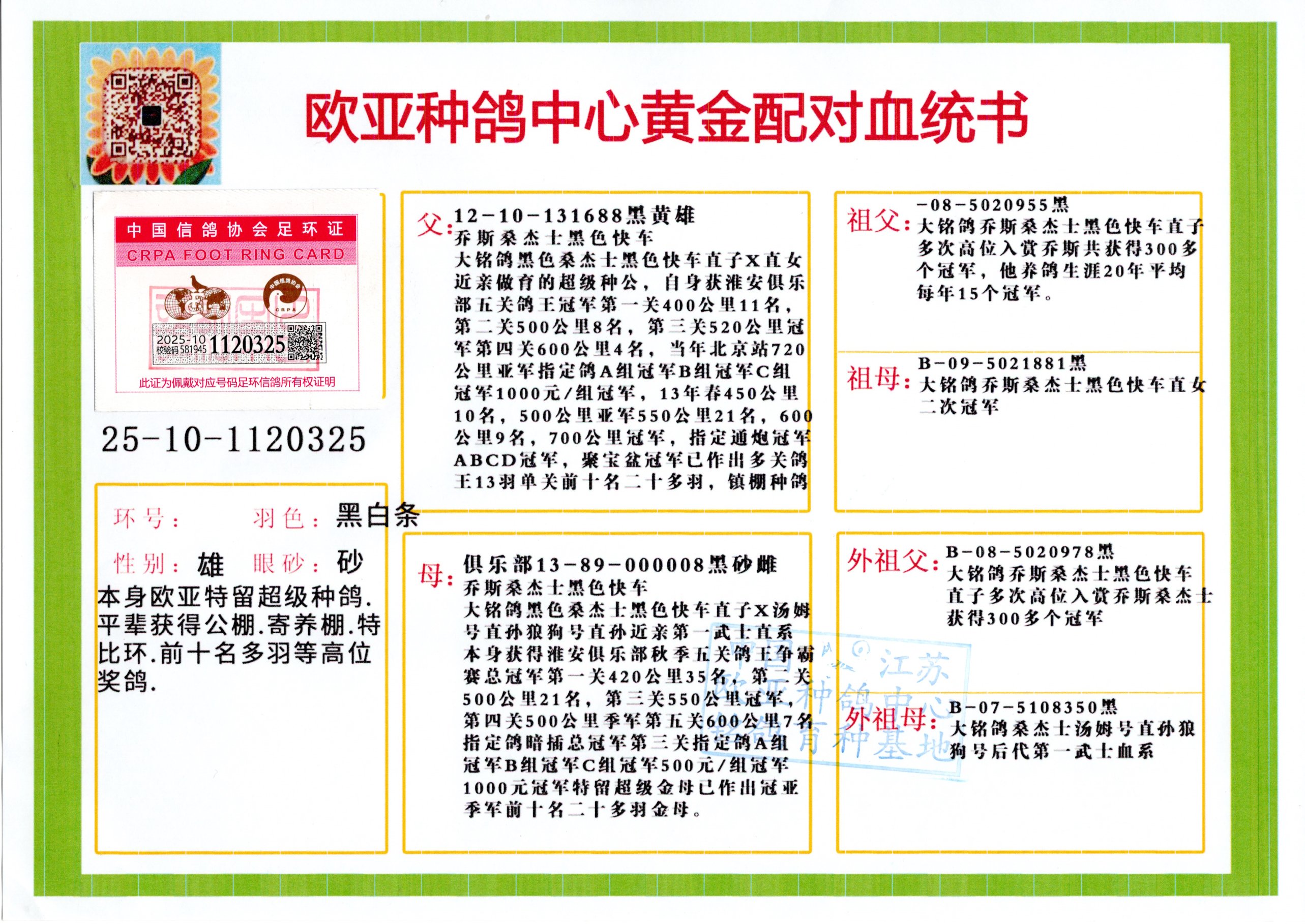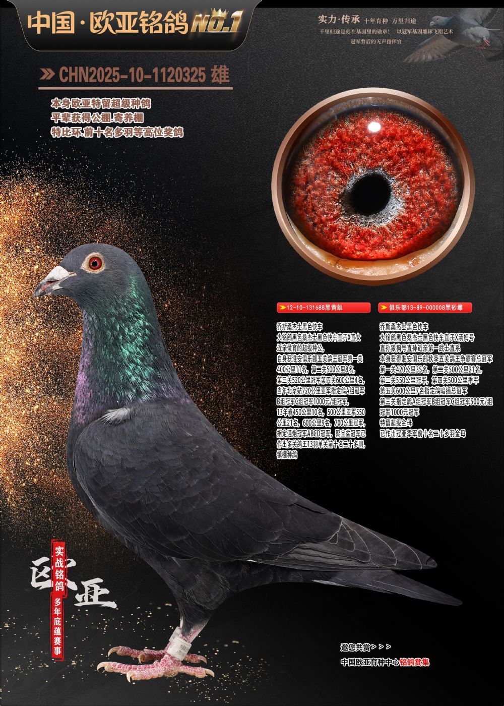24年秋南京特比环欧亚荣获大团体冠军.小团体冠军551公里大特比13名.14名.16名.19名.20名.21名.24名.26名.27名.28名.42名.52名.54名.57名.65名.66名.68名.70名.71名.72名.74名.76名.80名.82名.83名.84名.85名.86名.90名.92名.110名.116名.121名.122名.128名.131名.158名.161名.164名.165名.166名.172名.174名.177名.182名.195名.196名.201名.205名.208名.210名.216名.253名.269名.275名.276名.294名.296名.299名,,24年秋云南天南铜都公棚决赛415名.天南铜都小棚决赛409名.云南玉活公棚决赛102名.490名.团体32名上笼二羽进二羽,天南铜都大棚506公里决赛445名。热烈祝贺河北省巨鹿县李兰生老师用欧亚泰山号血系连续十一年夺冠军,河北省国家赛冠军.全国季军等多次前十名高位,扬州王军王总用欧亚利奥24年春季获山东翔宇公棚决赛33名盖比53名。南京刘正龙刘总用欧亚盖比获得24年秋山东潍坊国际公棚决赛42名.精英赛30名.三关鸽王71名.决赛86名.加站赛16名.南京市特比环A组鸽王9名.B组鸽王5名.6名.C组鸽王5名.精英赛冠军4名.技能赛A组冠军4名.5名.秦淮区特比环荣获15名.46名.48名.87名。四川西昌徐亮徐总用欧亚利奥获得凉山州聚友决赛177名.第二关亚军双关鸽王19名.三关鸽王105名.云南豪庭A公棚决赛603名。热烈祝贺24年四川重庆翔园鸽舍用欧亚泰山号荣获春季400公里冠军.秋季500公里冠军,河北王总用詹森X利奥获得千羽千翔公棚400公里冠军,广东蔡楷焕荣获24年秋爱好者 赛鸽俱乐部三关鸽王季军.一关420公里99名.二关450公里11名.三关520公里32名.单关季军.7名.12名,江西李卫兴荣获贵州红枫公棚8名.共翔俱乐部寄养棚四关综合鸽王30名.一关400公里78名.二关500公里55名.三关520公里37名.四关500公里57名.同父母获公棚18名.雷鸣获得武汉黄浦育翔中心冠军,四川陈文获得四川明鸿俱乐部300公里梦幻2名.3名.4名.9名.10名.13名.14名.15名.31名.34名.40名.41名.42名.43名.69名.71名.72名.73名.74名.94名.95名.97名.98名.99名.419公里决赛荣获总冠军7名.总共归巢9羽,四川徐亮获豪庭决赛603名,山西郑勇获得山西泰鑫公棚决赛255名詹森红狐,热烈祝贺马总获得开尔(飞跃队)决赛9名获奖金1310000万元.第一关52名,天津津福资赛180公里96名.获奖金429543万元,欧亚支持全国鸽友24年秋多人报喜 祝大家取得更好成绩,给欧亚报喜鸽友欧亚决定给每人赠送一羽超级种鸽。欧亚俱乐部特比环多关鸽王成绩:15年秋淮安特比环黑色星期一全会上笼9700多羽,当天无鸽归巢,第二天全会归巢357羽,本舍归巢158羽.前十名八羽.前一百名归巢57羽,16年春季获五关鸽王总冠军,总亚军四名.六名.七名.九名.十名.晶艺俱乐部520公里冠亚季军5名.6名.7名.9名.11名等,火车头冠军.季军6名.8名.9名.10名,16年秋晶艺俱乐部特比环520公里亚军.季军4名.6名.7名.9名,15年春南京白下特比环冠军.亚军.季军6名.7名.8名.9名.10名.指定鸽A B组获得冠军.亚军.季军4名.5名.,17年淮安特比环亚军.4名.5名.7名.8名.10名.六关鸽王总冠军.4名.6名.9名.10名,寄养棚宿迁刘总20羽特比环获冠军.季军.4名.7名.8名.9名等。18年荣获万羽特比环六关鸽王总冠军.总亚军.总季军.6名.8名.十名.单关四羽冠军.二羽亚军.四羽季军.前十名27羽。19年秋万羽特比环六关鸽王总亚军.总季军.5名.8名等,单关二羽冠军.三羽亚军.一羽季军前十名31羽。20年秋淮安市鸽会四关特比环大赛风雨无阻鸽王亚军.鸽王六名,金品俱乐部万羽特比环六关鸽王总冠军,总亚军.四名.五名.六名.七名.八名.十名.前二百名鸽王35羽,单关冠亚季军前十名四十多羽,火车头五关鸽王季军.六名.八名.前二百名鸽王十七羽。20年春荣获淮安五区一市四关鸽王总冠军.亚军.四名.八名.九名。21年秋荣获金品万羽特比环大赛六关鸽王总亚军.总季军.四名.七名.九名.十名.单关冠亚军季军前十名三十多羽。火车头协会鸽王六名.七名.十名.单关前十名十七羽。22年秋荣获鸽王总冠军.总亚军.5名.7名.8名.9名.11名.单关冠亚季军前十名三十多羽,第一关单关前二百名四十多羽,第二关前二百名三十多羽,第三关前二百名四十多羽,第四关前二百名四十多羽,第五关前一百名53羽。23年秋荣获鸽王季军.五名.八名.十名.13名.17名.20名.27名等多羽鸽王.单关前十名二十多羽。公棚.寄养棚部分成绩:16年秋宁夏黄河公棚总冠军电脑戈马力指定通炮冠军,17年送八羽参赛获得鸽王八名进奖四名,支持韩总荣获八名。支持鸽友荣获宁夏中卫公棚决赛总冠军.精英赛冠军,支持18年宁夏黄河公棚决赛冠军詹森X泰山。安徽鼎博寄养棚院内外四关鸽王总冠军.鸽王十七名.三十七名同窝,鸽王39名.42名.58名.67名。18年山东公棚预赛冠军.决赛65名.送八羽进奖五羽.指定获奔驰汽车一辆。支持鸽友获得云南蓝云公棚冠军.盖比X佛卡门。支持鸽友荣获云南银集公棚决赛冠军 詹森427X520血系 速度赛6700羽冠军。17年荣获金马俱乐部寄养棚四关鸽王总冠军.季军.六名.八名.第一关冠军.亚军.季军四名.七名.十一名.金牌教练奖。支持鸽友18年北京费翔公棚预赛九名电脑X桑杰士,支持鸽友荣获陕西威力公棚决赛11名.内蒙古临河寄养棚四关鸽王六名.詹森配泰山,支持河北王总用欧亚詹森427配胡本喜获20年秋开尔青年棚季军。云南东荣公棚16年预赛冠军.决赛77名.17年决赛12名.詹森红狐X泰山,17年平安公棚决赛4名 詹森427。欧亚获得21年金母寄养棚第一关四名.第二关5名.第三关5名.6名.7名.10名.三关鸽王总冠军,四关鸽王14名.十羽鸽王。支持