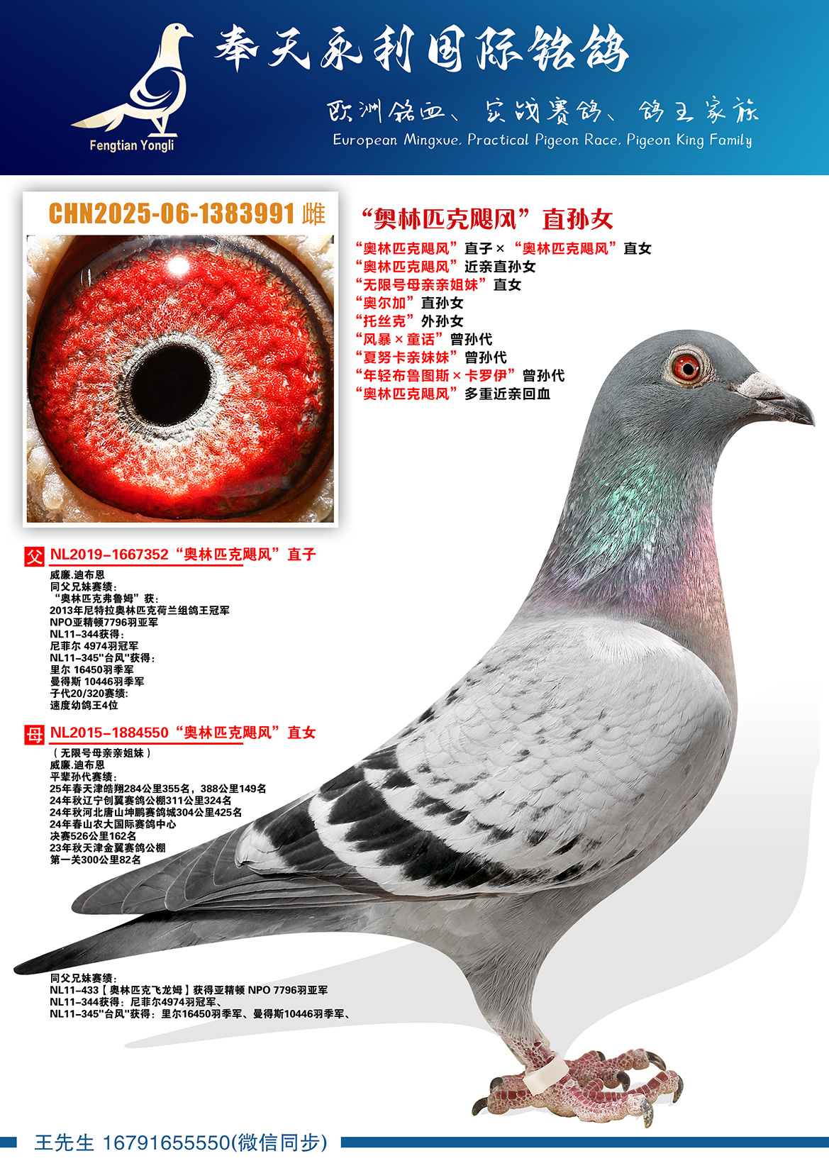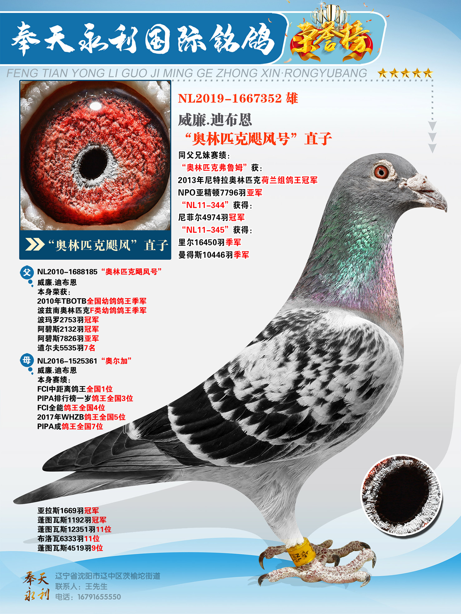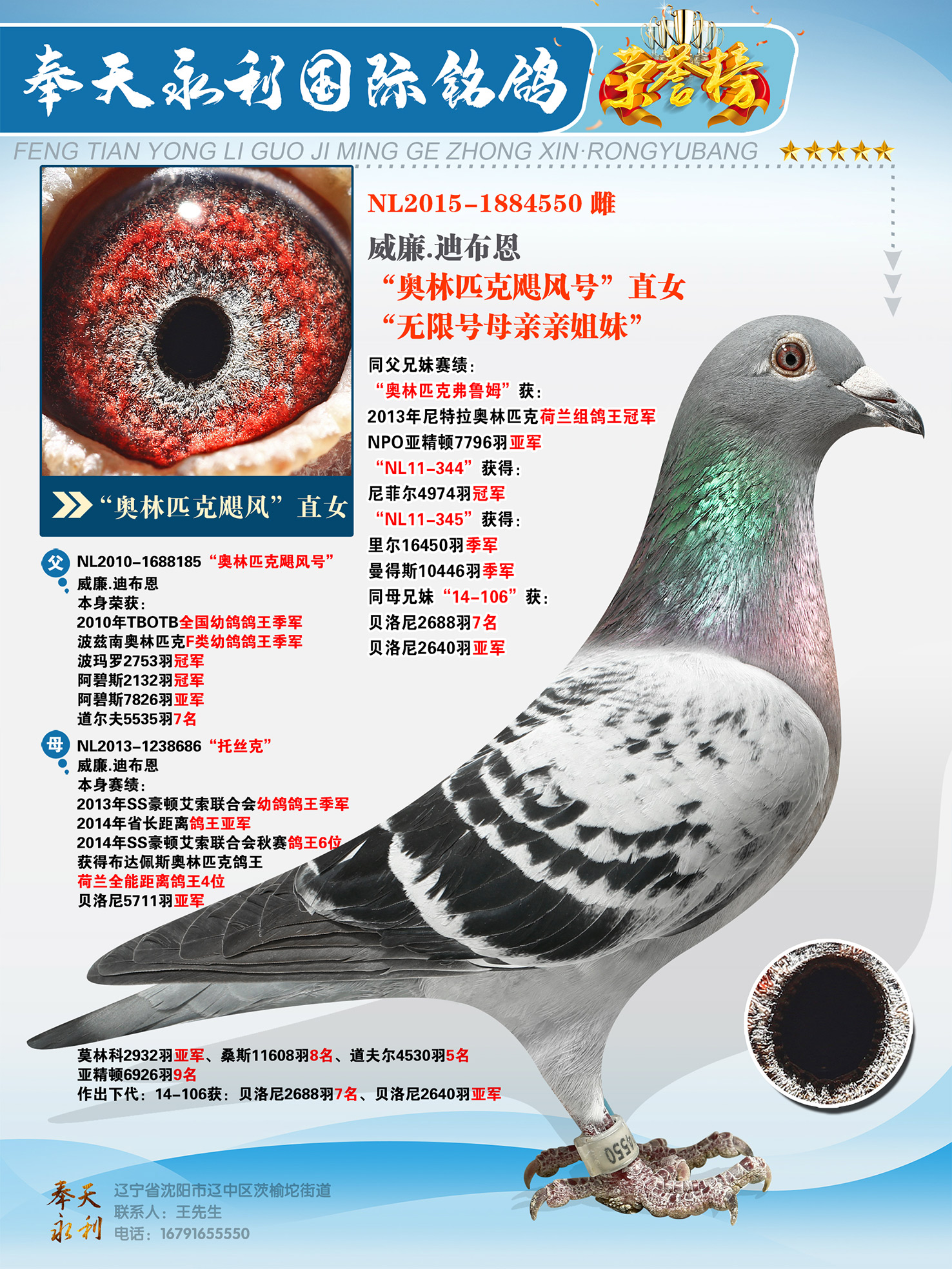 NL11-345"台风"获得:里尔16450羽季军、曼得斯10446羽季军、