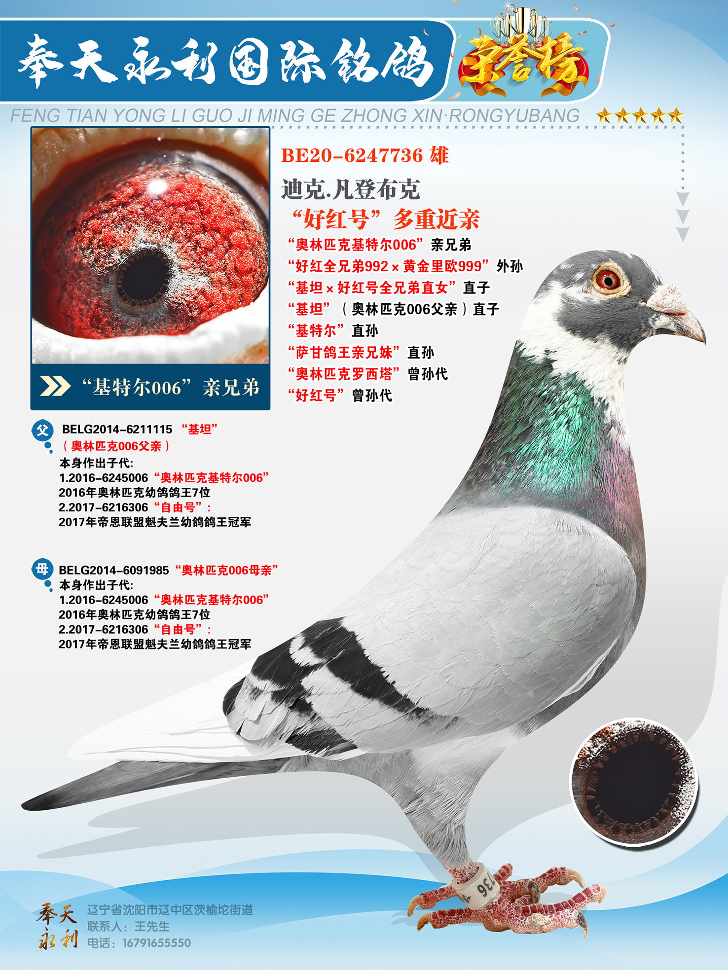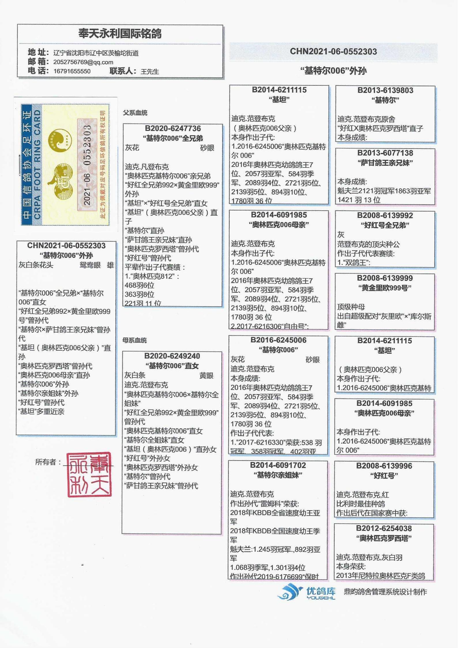 作出子代 “2020-4205164”:1026羽冠军、2289 羽冠军、1745 羽冠军、1001羽冠军 、995羽冠军、1626羽6位