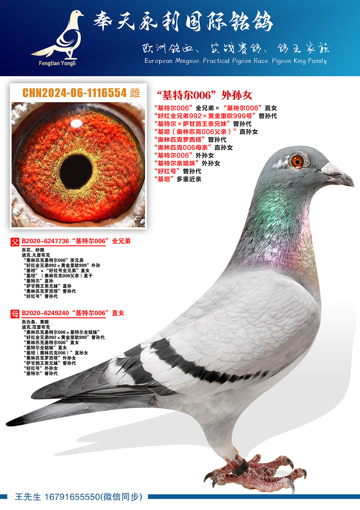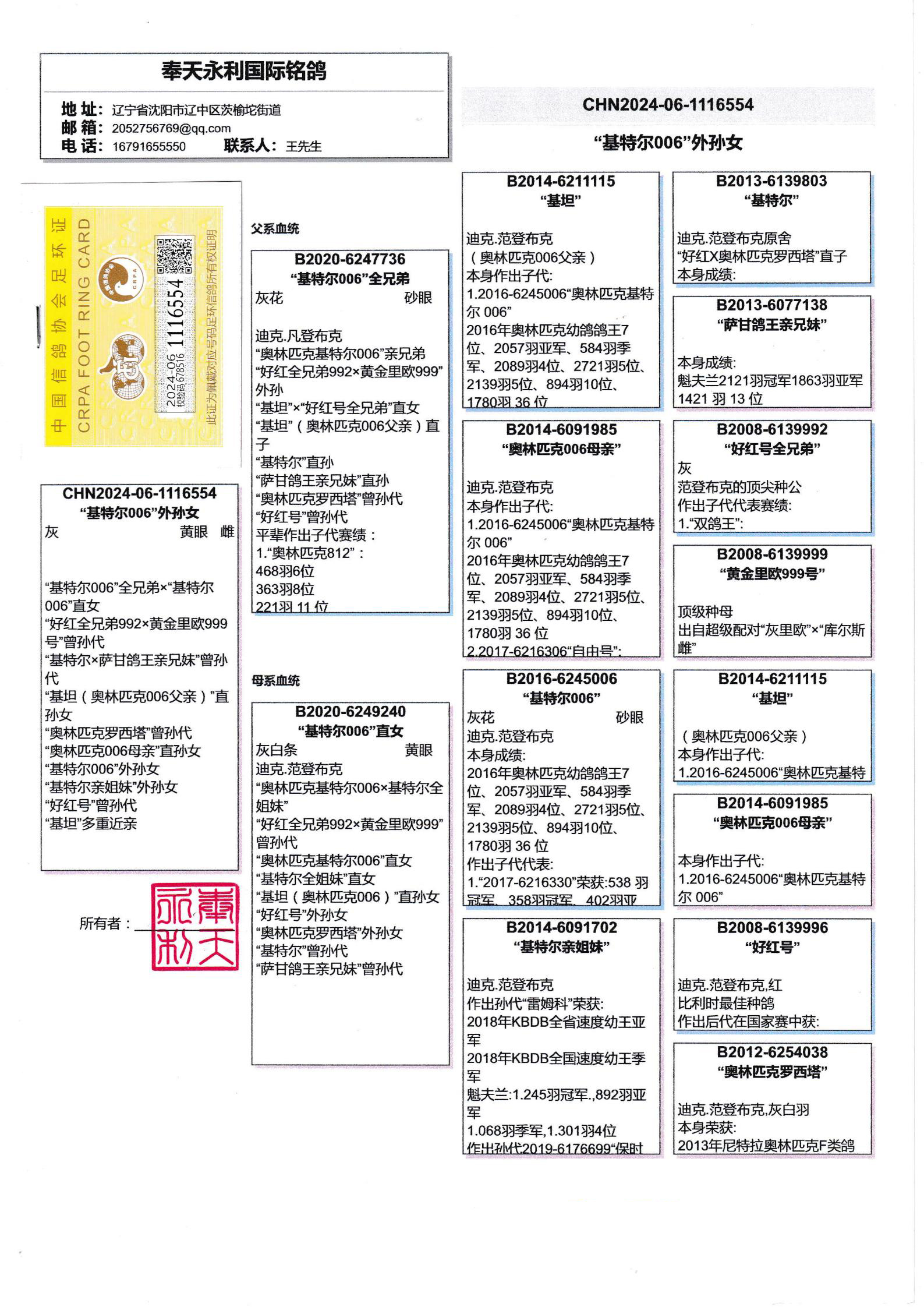 作出子代 “2020-4205164”:1026羽冠军、2289 羽冠军、1745 羽冠军、1001羽冠军 、995羽冠军、1626羽6位