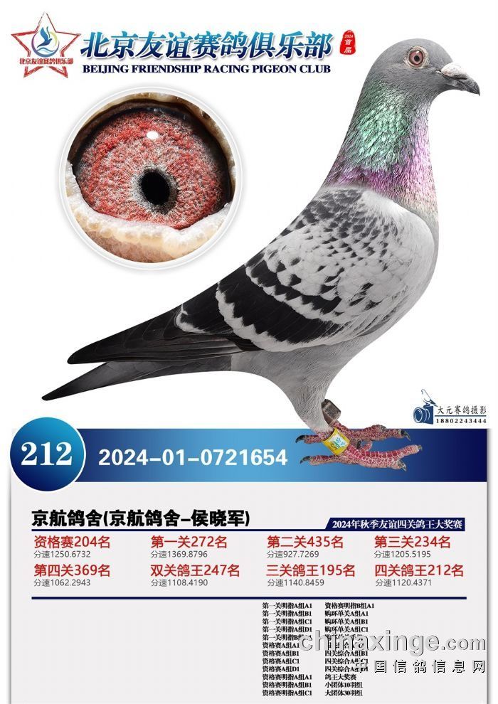 北京友谊赛鸽俱乐部四关综合鸽王212名;
