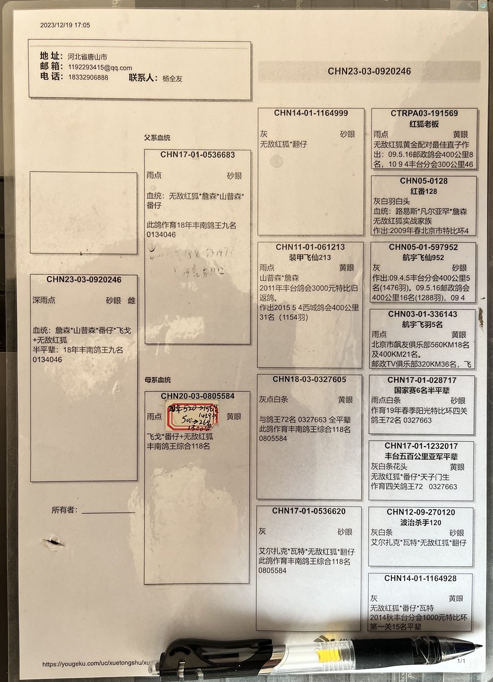 母:CHN20-03-0805584 飞戈X番仔X无敌红狐; 丰南鸽王综合118名;