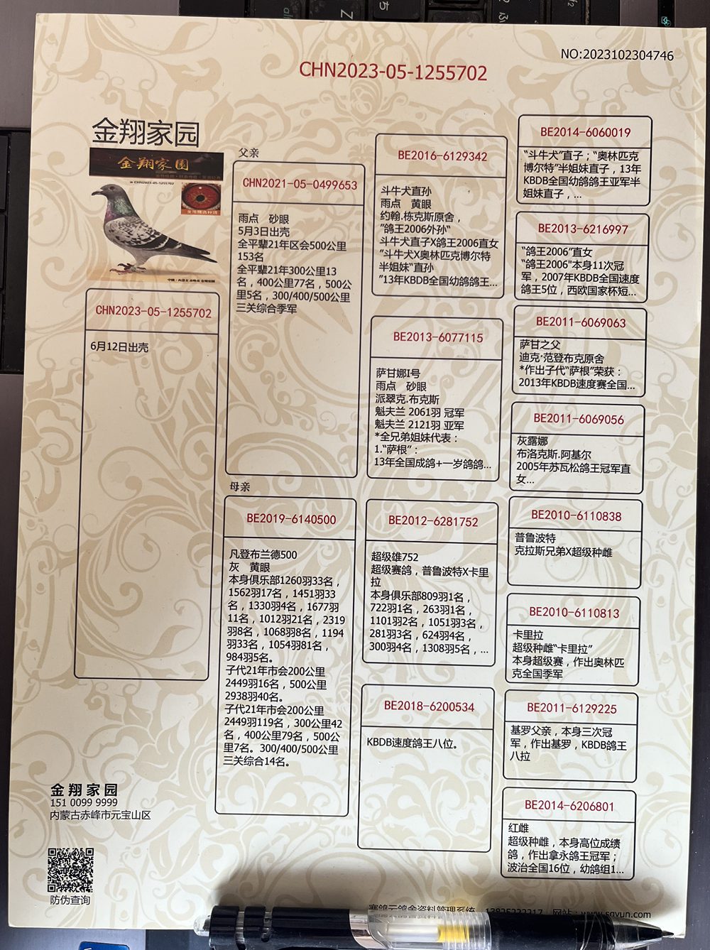 母:BE2019-6140500 凡登布兰德500 灰 黄眼 本身俱乐部1260羽33名,1562羽17名,1451羽33名,1330羽4名,1677羽11名,1012羽21名,2319羽8名,1068羽8名,1194羽33名,1054羽81名,984羽5名。 子代21年市会200公里2449羽16名,500公里2938羽40名。 子代21年市会200公里2449羽119名,300公里42名,400公里79名,500公里7名。300/400/500公里三关综合14名;