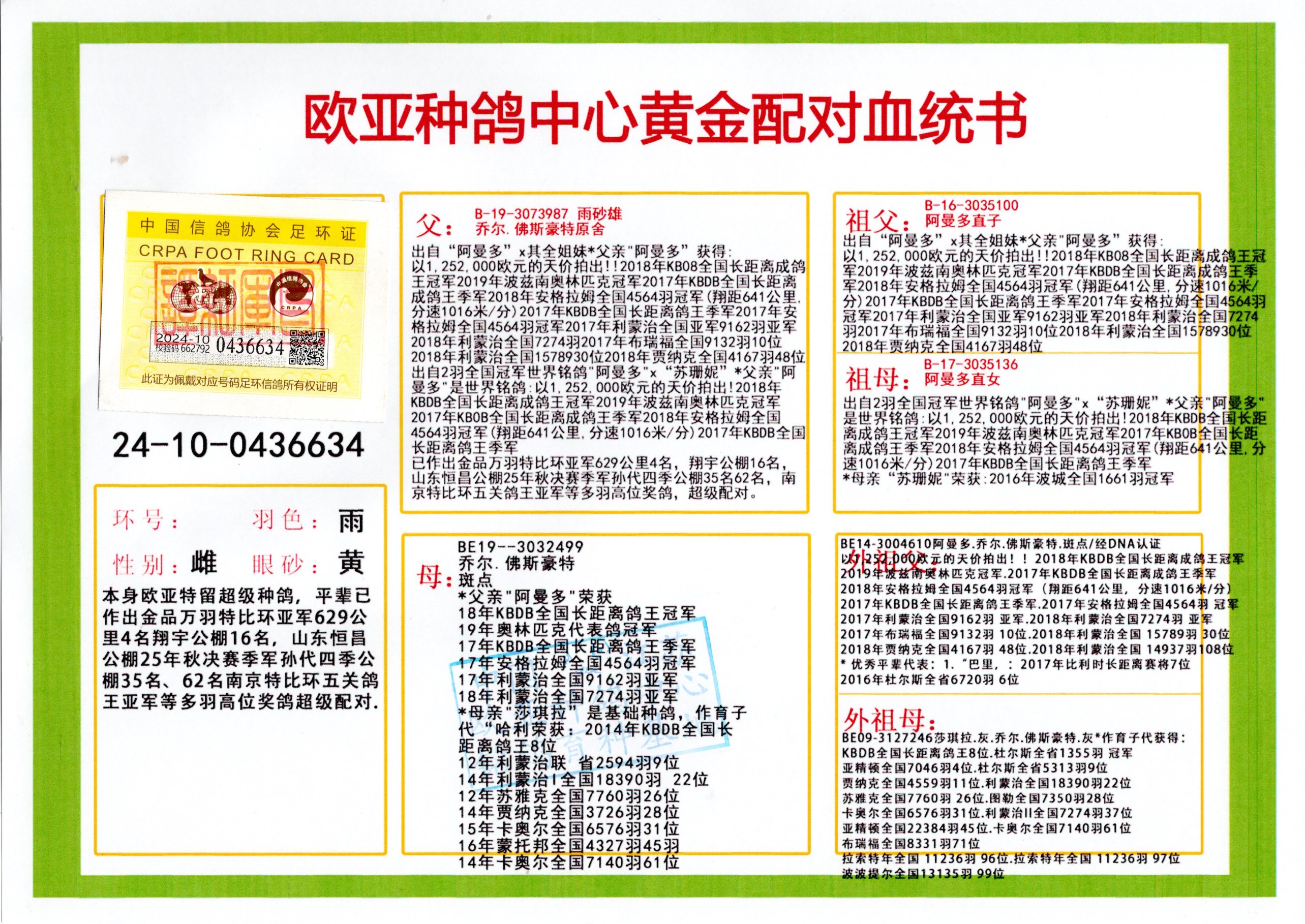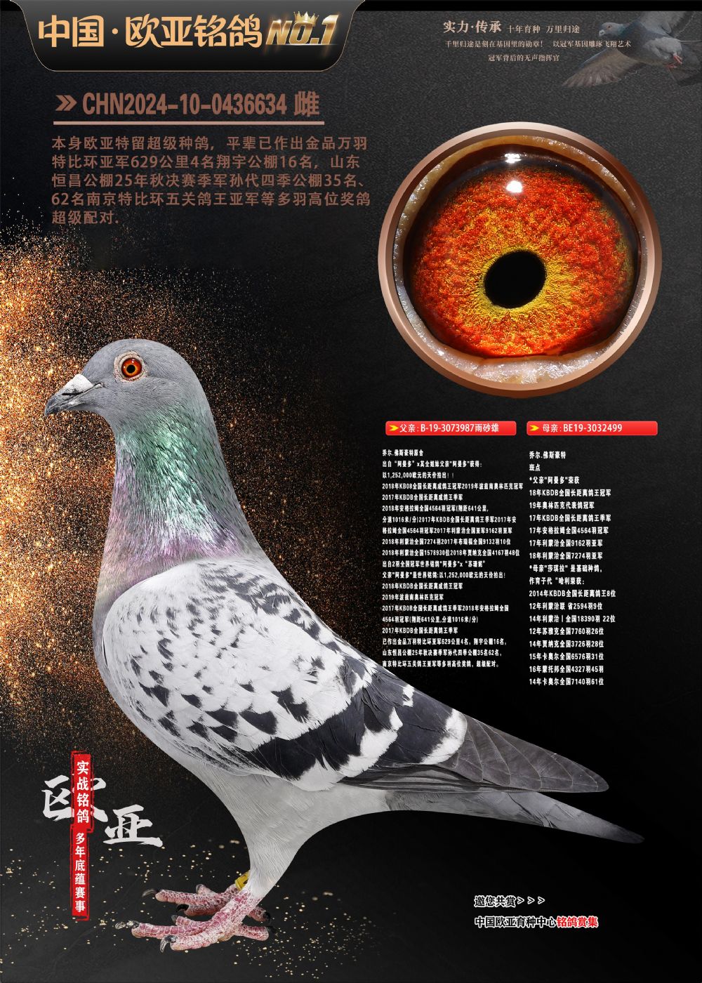 24年秋南京特比环欧亚荣获大团体冠军.小团体冠军551公里大特比13名.14名.16名.19名.20名.21名.24名.26名.27名.28名.42名.52名.54名.57名.65名.66名.68名.70名.71名.72名.74名.76名.80名.82名.83名.84名.85名.86名.90名.92名.110名.116名.121名.122名.128名.131名.158名.161名.164名.165名.166名.172名.174名.177名.182名.195名.196名.201名.205名.208名.210名.216名.253名.269名.275名.276名.294名.296名.299名,,24年秋云南天南铜都公棚决赛415名.天南铜都小棚决赛409名.云南玉活公棚决赛102名.490名.团体32名上笼二羽进二羽,天南铜都大棚506公里决赛445名。热烈祝贺河北省巨鹿县李兰生老师用欧亚泰山号血系连续十一年夺冠军,河北省国家赛冠军.全国季军等多次前十名高位,扬州王军王总用欧亚利奥24年春季获山东翔宇公棚决赛33名盖比53名。南京刘正龙刘总用欧亚盖比获得24年秋山东潍坊国际公棚决赛42名.精英赛30名.三关鸽王71名.决赛86名.加站赛16名.南京市特比环A组鸽王9名.B组鸽王5名.6名.C组鸽王5名.精英赛冠军4名.技能赛A组冠军4名.5名.秦淮区特比环荣获15名.46名.48名.87名。四川西昌徐亮徐总用欧亚利奥获得凉山州聚友决赛177名.第二关亚军双关鸽王19名.三关鸽王105名.云南豪庭公棚决赛603名。热烈祝贺24年四川重庆翔园鸽舍用欧亚泰山号荣获春季400公里冠军.秋季500公里冠军,河北王总用詹森X利奥获得千羽千翔公棚400公里冠军,广东蔡楷焕荣获24年秋爱好者 赛鸽俱乐部三关鸽王季军.一关420公里99名.二关450公里11名.三关520公里32名.单关季军.7名.12名,江西李卫兴荣获贵州红枫公棚8名.共翔俱乐部寄养棚四关综合鸽王30名.一关400公里78名.二关500公里55名.三关520公里37名.四关500公里57名.同父母获公棚18名.雷鸣获得武汉黄浦育翔中心冠军,四川陈文获得四川明鸿俱乐部300公里梦幻2名.3名.4名.9名.10名.13名.14名.15名.31名.34名.40名.41名.42名.43名.69名.71名.72名.73名.74名.94名.95名.97名.98名.99名.419公里决赛荣获总冠军7名.总共归巢9羽,四川徐亮获豪庭决赛603名,山西郑勇获得山西泰鑫公棚决赛255名詹森红狐,热烈祝贺马总获得开尔(飞跃队)决赛9名获奖金1310000万元.第一关52名,天津津福资赛180公里96名.获奖金429543万元,欧亚支持全国鸽友24年秋多人报喜 祝大家取得更好成绩,给欧亚报喜鸽友欧亚决定给每人赠送一羽超级种鸽。欧亚俱乐部特比环多关鸽王成绩:15年秋淮安特比环黑色星期一全会上笼9700多羽,当天无鸽归巢,第二天全会归巢357羽,本舍归巢158羽.前十名八羽.前一百名归巢57羽,16年春季获五关鸽王总冠军,总亚军四名.六名.七名.九名.十名.晶艺俱乐部520公里冠亚季军5名.6名.7名.9名.11名等,火车头冠军.季军6名.8名.9名.10名,16年秋晶艺俱乐部特比环520公里亚军.季军4名.6名.7名.9名,15年春南京白下特比环冠军.亚军.季军6名.7名.8名.9名.10名.指定鸽A B组获得冠军.亚军.季军4名.5名.,17年淮安特比环亚军.4名.5名.7名.8名.10名.六关鸽王总冠军.4名.6名.9名.10名,寄养棚宿迁刘总20羽特比环获冠军.季军.4名.7名.8名.9名等。18年荣获万羽特比环六关鸽王总冠军.总亚军.总季军.6名.8名.十名.单关四羽冠军.二羽亚军.四羽季军.前十名27羽。19年秋万羽特比环六关鸽王总亚军.总季军.5名.8名等,单关二羽冠军.三羽亚军.一羽季军前十名31羽。20年秋淮安市鸽会四关特比环大赛风雨无阻鸽王亚军.鸽王六名,金品俱乐部万羽特比环六关鸽王总冠军,总亚军.四名.五名.六名.七名.八名.十名.前二百名鸽王35羽,单关冠亚季军前十名四十多羽,火车头五关鸽王季军.六名.八名.前二百名鸽王十七羽。20年春荣获淮安五区一市四关鸽王总冠军.亚军.四名.八名.九名。21年秋荣获金品万羽特比环大赛六关鸽王总亚军.总季军.四名.七名.九名.十名.单关冠亚军季军前十名三十多羽。火车头协会鸽王六名.七名.十名.单关前十名十七羽。22年秋荣获鸽王总冠军.总亚军.5名.7名.8名.9名.11名.单关冠亚季军前十名三十多羽,第一关单关前二百名四十多羽,第二关前二百名三十多羽,第三关前二百名四十多羽,第四关前二百名四十多羽,第五关前一百名53羽。23年秋荣获鸽王季军.五名.八名.十名.13名.17名.20名.27名等多羽鸽王.单关前十名二十多羽。公棚.寄养棚部分成绩:16年秋宁夏黄河公棚总冠军电脑戈马力指定通炮冠军,17年送八羽参赛获得鸽王八名进奖四名,支持韩总荣获八名。支持鸽友荣获宁夏中卫公棚决赛总冠军.精英赛冠军,支持18年宁夏黄河公棚决赛冠军詹森X泰山。安徽鼎博寄养棚院内外四关鸽王总冠军.鸽王十七名.三十七名同窝,鸽王39名.42名.58名.67名。18年山东公棚预赛冠军.决赛65名.送八羽进奖五羽.指定获奔驰汽车一辆。支持鸽友获得云南蓝云公棚冠军.盖比X佛卡门。支持鸽友荣获云南银集公棚决赛冠军 詹森427X520血系 速度赛6700羽冠军。17年荣获金马俱乐部寄养棚四关鸽王总冠军.季军.六名.八名.第一关冠军.亚军.季军四名.七名.十一名.金牌教练奖。支持鸽友18年北京费翔公棚预赛九名电脑X桑杰士,支持鸽友荣获陕西威力公棚决赛11名.内蒙古临河寄养棚四关鸽王六名.詹森配泰山,支持河北王总用欧亚詹森427配胡本喜获20年秋开尔青年棚季军。云南东荣公棚16年预赛冠军.决赛77名.17年决赛12名.詹森红狐X泰山,17年平安公棚决赛4名 詹森427。欧亚获得21年金母寄养棚第一关四名.第二关5名.第三关5名.6名.7名.10名.三关鸽王总冠军,四关鸽王14名.十羽鸽王。支持河