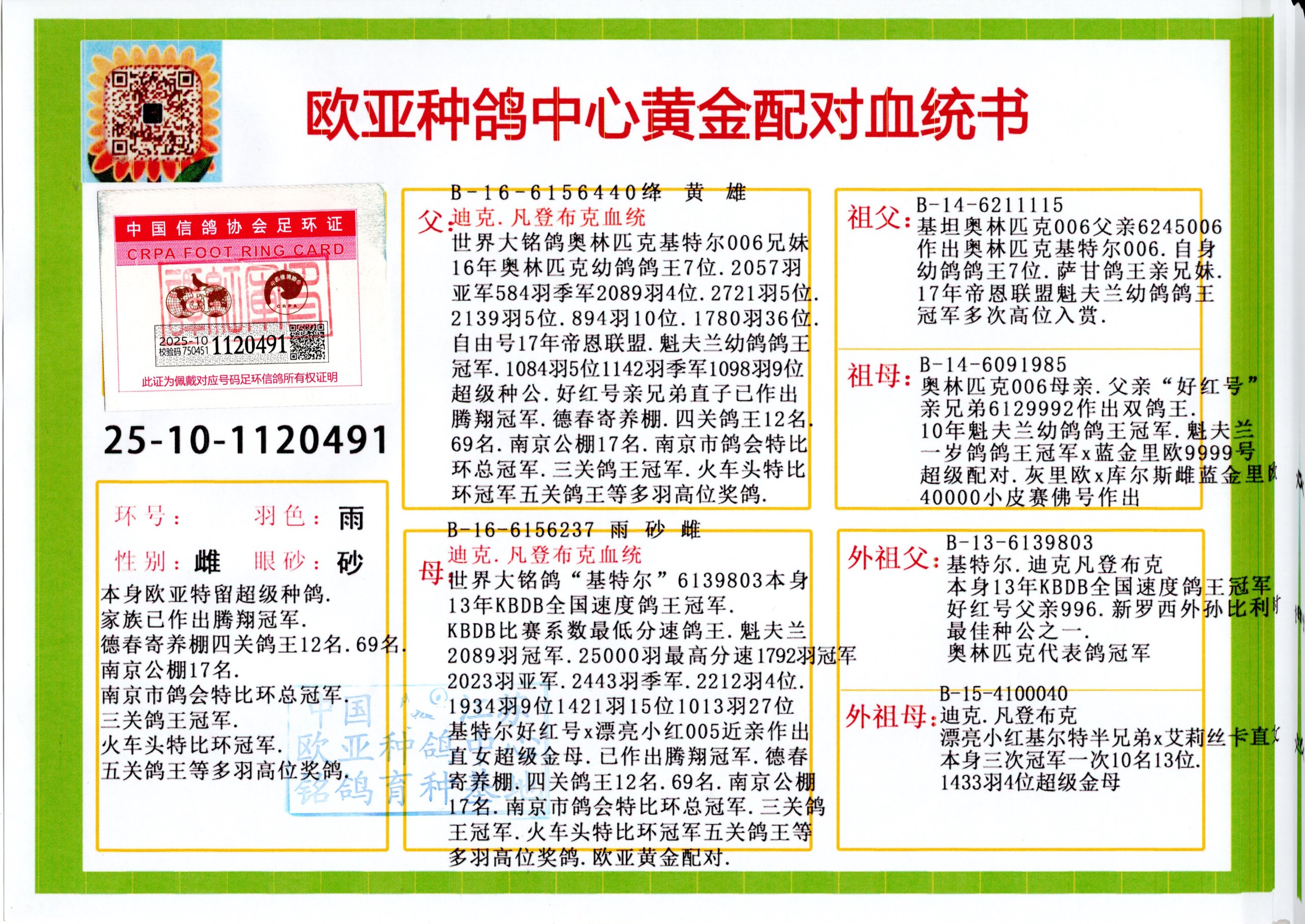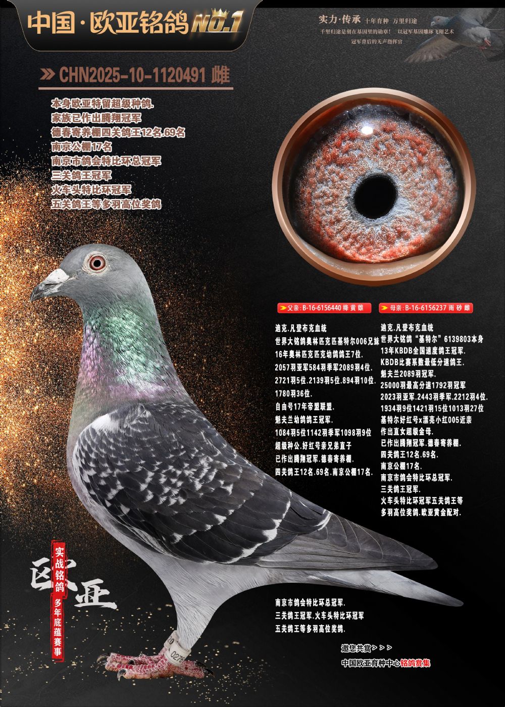 24年秋南京特比环欧亚荣获大团体冠军.小团体冠军551公里大特比13名.14名.16名.19名.20名.21名.24名.26名.27名.28名.42名.52名.54名.57名.65名.66名.68名.70名.71名.72名.74名.76名.80名.82名.83名.84名.85名.86名.90名.92名.110名.116名.121名.122名.128名.131名.158名.161名.164名.165名.166名.172名.174名.177名.182名.195名.196名.201名.205名.208名.210名.216名.253名.269名.275名.276名.294名.296名.299名,,24年秋云南天南铜都公棚决赛415名.天南铜都小棚决赛409名.云南玉活公棚决赛102名.490名.团体32名上笼二羽进二羽,天南铜都大棚506公里决赛445名。热烈祝贺河北省巨鹿县李兰生老师用欧亚泰山号血系连续十一年夺冠军,河北省国家赛冠军.全国季军等多次前十名高位,扬州王军王总用欧亚利奥24年春季获山东翔宇公棚决赛33名盖比53名。南京刘正龙刘总用欧亚盖比获得24年秋山东潍坊国际公棚决赛42名.精英赛30名.三关鸽王71名.决赛86名.加站赛16名.南京市特比环A组鸽王9名.B组鸽王5名.6名.C组鸽王5名.精英赛冠军4名.技能赛A组冠军4名.5名.秦淮区特比环荣获15名.46名.48名.87名。四川西昌徐亮徐总用欧亚利奥获得凉山州聚友决赛177名.第二关亚军双关鸽王19名.三关鸽王105名.云南豪庭公棚决赛603名。热烈祝贺24年四川重庆翔园鸽舍用欧亚泰山号荣获春季400公里冠军.秋季500公里冠军,河北王总用詹森X利奥获得千羽千翔公棚400公里冠军,广东蔡楷焕荣获24年秋爱好者 赛鸽俱乐部三关鸽王季军.一关420公里99名.二关450公里11名.三关520公里32名.单关季军.7名.12名,江西李卫兴荣获贵州红枫公棚8名.共翔俱乐部寄养棚四关综合鸽王30名.一关400公里78名.二关500公里55名.三关520公里37名.四关500公里57名.同父母获公棚18名.雷鸣获得武汉黄浦育翔中心冠军,四川陈文获得四川明鸿俱乐部300公里梦幻2名.3名.4名.9名.10名.13名.14名.15名.31名.34名.40名.41名.42名.43名.69名.71名.72名.73名.74名.94名.95名.97名.98名.99名.419公里决赛荣获总冠军7名.总共归巢9羽,四川徐亮获豪庭决赛603名,山西郑勇获得山西泰鑫公棚决赛255名詹森红狐,热烈祝贺马总获得开尔(飞跃队)决赛9名获奖金1310000万元.第一关52名,天津津福资赛180公里96名.获奖金429543万元,欧亚支持全国鸽友24年秋多人报喜 祝大家取得更好成绩,给欧亚报喜鸽友欧亚决定给每人赠送一羽超级种鸽。欧亚俱乐部特比环多关鸽王成绩:15年秋淮安特比环黑色星期一全会上笼9700多羽,当天无鸽归巢,第二天全会归巢357羽,本舍归巢158羽.前十名八羽.前一百名归巢57羽,16年春季获五关鸽王总冠军,总亚军四名.六名.七名.九名.十名.晶艺俱乐部520公里冠亚季军5名.6名.7名.9名.11名等,火车头冠军.季军6名.8名.9名.10名,16年秋晶艺俱乐部特比环520公里亚军.季军4名.6名.7名.9名,15年春南京白下特比环冠军.亚军.季军6名.7名.8名.9名.10名.指定鸽A B组获得冠军.亚军.季军4名.5名.,17年淮安特比环亚军.4名.5名.7名.8名.10名.六关鸽王总冠军.4名.6名.9名.10名,寄养棚宿迁刘总20羽特比环获冠军.季军.4名.7名.8名.9名等。18年荣获万羽特比环六关鸽王总冠军.总亚军.总季军.6名.8名.十名.单关四羽冠军.二羽亚军.四羽季军.前十名27羽。19年秋万羽特比环六关鸽王总亚军.总季军.5名.8名等,单关二羽冠军.三羽亚军.一羽季军前十名31羽。20年秋淮安市鸽会四关特比环大赛风雨无阻鸽王亚军.鸽王六名,金品俱乐部万羽特比环六关鸽王总冠军,总亚军.四名.五名.六名.七名.八名.十名.前二百名鸽王35羽,单关冠亚季军前十名四十多羽,火车头五关鸽王季军.六名.八名.前二百名鸽王十七羽。20年春荣获淮安五区一市四关鸽王总冠军.亚军.四名.八名.九名。21年秋荣获金品万羽特比环大赛六关鸽王总亚军.总季军.四名.七名.九名.十名.单关冠亚军季军前十名三十多羽。火车头协会鸽王六名.七名.十名.单关前十名十七羽。22年秋荣获鸽王总冠军.总亚军.5名.7名.8名.9名.11名.单关冠亚季军前十名三十多羽,第一关单关前二百名四十多羽,第二关前二百名三十多羽,第三关前二百名四十多羽,第四关前二百名四十多羽,第五关前一百名53羽。23年秋荣获鸽王季军.五名.八名.十名.13名.17名.20名.27名等多羽鸽王.单关前十名二十多羽。公棚.寄养棚部分成绩:16年秋宁夏黄河公棚总冠军电脑戈马力指定通炮冠军,17年送八羽参赛获得鸽王八名进奖四名,支持韩总荣获八名。支持鸽友荣获宁夏中卫公棚决赛总冠军.精英赛冠军,支持18年宁夏黄河公棚决赛冠军詹森X泰山。安徽鼎博寄养棚院内外四关鸽王总冠军.鸽王十七名.三十七名同窝,鸽王39名.42名.58名.67名。18年山东公棚预赛冠军.决赛65名.送八羽进奖五羽.指定获奔驰汽车一辆。支持鸽友获得云南蓝云公棚冠军.盖比X佛卡门。支持鸽友荣获云南银集公棚决赛冠军 詹森427X520血系 速度赛6700羽冠军。17年荣获金马俱乐部寄养棚四关鸽王总冠军.季军.六名.八名.第一关冠军.亚军.季军四名.七名.十一名.金牌教练奖。支持鸽友18年北京费翔公棚预赛九名电脑X桑杰士,支持鸽友荣获陕西威力公棚决赛11名.内蒙古临河寄养棚四关鸽王六名.詹森配泰山,支持河北王总用欧亚詹森427配胡本喜获20年秋开尔青年棚季军。云南东荣公棚16年预赛冠军.决赛77名.17年决赛12名.詹森红狐X泰山,17年平安公棚决赛4名 詹森427。欧亚获得21年金母寄养棚第一关四名.第二关5名.第三关5名.6名.7名.10名.三关鸽王总冠军,四关鸽王14名.十羽鸽王。支持河