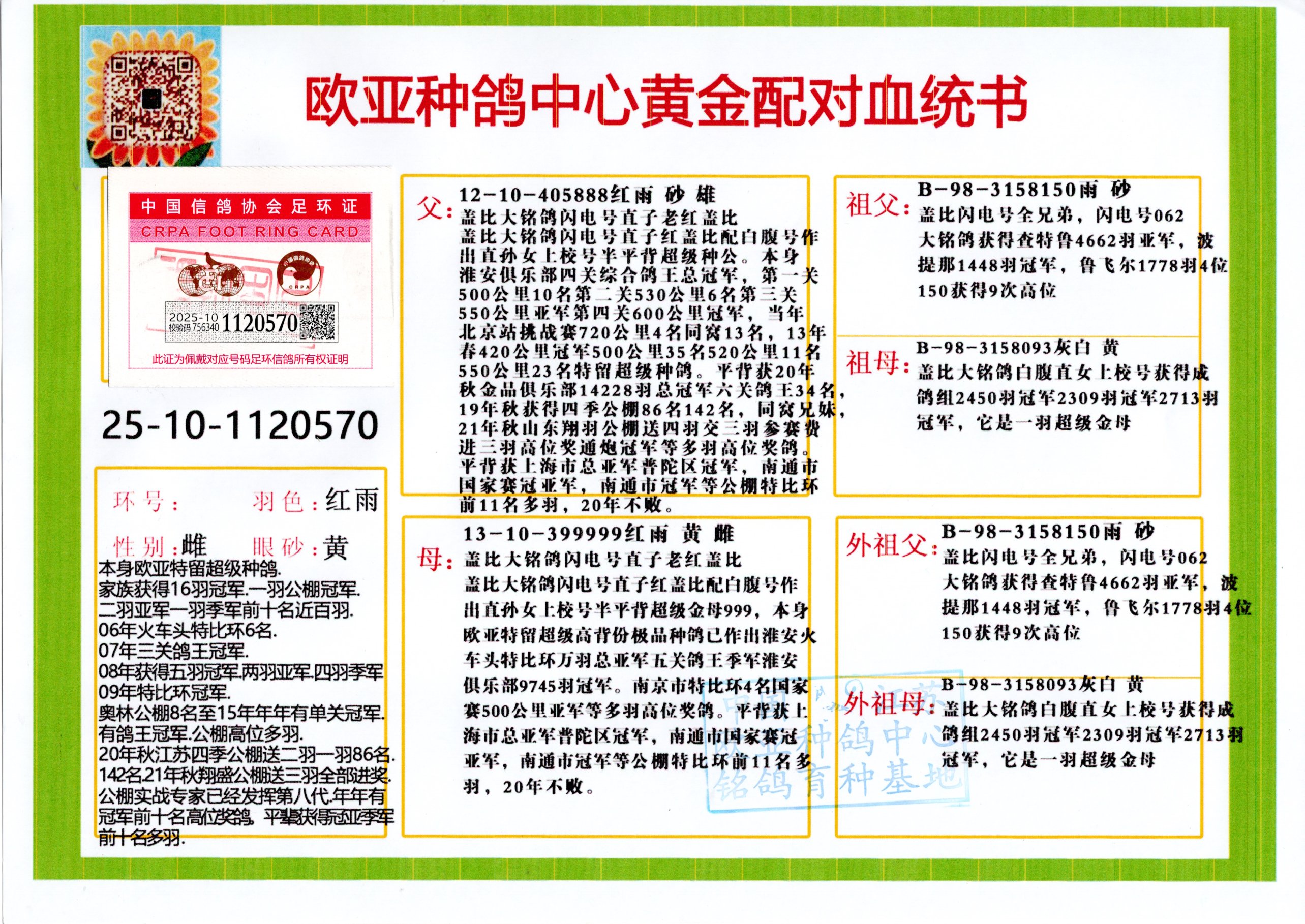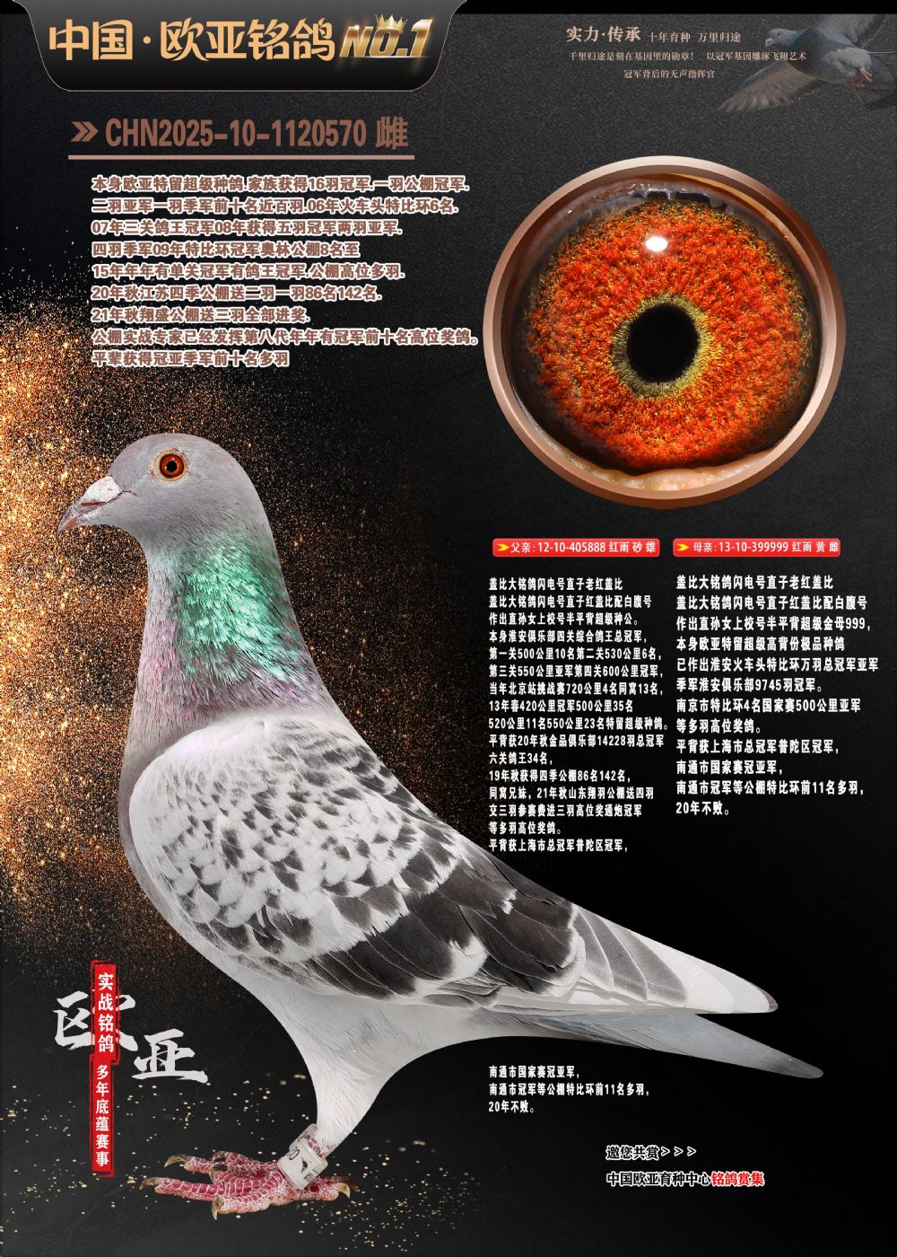 24年秋南京特比环欧亚荣获大团体冠军.小团体冠军551公里大特比13名.14名.16名.19名.20名.21名.24名.26名.27名.28名.42名.52名.54名.57名.65名.66名.68名.70名.71名.72名.74名.76名.80名.82名.83名.84名.85名.86名.90名.92名.110名.116名.121名.122名.128名.131名.158名.161名.164名.165名.166名.172名.174名.177名.182名.195名.196名.201名.205名.208名.210名.216名.253名.269名.275名.276名.294名.296名.299名,,24年秋云南天南铜都公棚决赛415名.天南铜都小棚决赛409名.云南玉活公棚决赛102名.490名.团体32名上笼二羽进二羽,天南铜都大棚506公里决赛445名。热烈祝贺河北省巨鹿县李兰生老师用欧亚泰山号血系连续十一年夺冠军,河北省国家赛冠军.全国季军等多次前十名高位,扬州王军王总用欧亚利奥24年春季获山东翔宇公棚决赛33名盖比53名。南京刘正龙刘总用欧亚盖比获得24年秋山东潍坊国际公棚决赛42名.精英赛30名.三关鸽王71名.决赛86名.加站赛16名.南京市特比环A组鸽王9名.B组鸽王5名.6名.C组鸽王5名.精英赛冠军4名.技能赛A组冠军4名.5名.秦淮区特比环荣获15名.46名.48名.87名。四川西昌徐亮徐总用欧亚利奥获得凉山州聚友决赛177名.第二关亚军双关鸽王19名.三关鸽王105名.云南豪庭公棚决赛603名。热烈祝贺24年四川重庆翔园鸽舍用欧亚泰山号荣获春季400公里冠军.秋季500公里冠军,河北王总用詹森X利奥获得千羽千翔公棚400公里冠军,广东蔡楷焕荣获24年秋爱好者 赛鸽俱乐部三关鸽王季军.一关420公里99名.二关450公里11名.三关520公里32名.单关季军.7名.12名,江西李卫兴荣获贵州红枫公棚8名.共翔俱乐部寄养棚四关综合鸽王30名.一关400公里78名.二关500公里55名.三关520公里37名.四关500公里57名.同父母获公棚18名.雷鸣获得武汉黄浦育翔中心冠军,四川陈文获得四川明鸿俱乐部300公里梦幻2名.3名.4名.9名.10名.13名.14名.15名.31名.34名.40名.41名.42名.43名.69名.71名.72名.73名.74名.94名.95名.97名.98名.99名.419公里决赛荣获总冠军7名.总共归巢9羽,四川徐亮获豪庭决赛603名,山西郑勇获得山西泰鑫公棚决赛255名詹森红狐,热烈祝贺马总获得开尔(飞跃队)决赛9名获奖金1310000万元.第一关52名,天津津福资赛180公里96名.获奖金429543万元,欧亚支持全国鸽友24年秋多人报喜 祝大家取得更好成绩,给欧亚报喜鸽友欧亚决定给每人赠送一羽超级种鸽。欧亚俱乐部特比环多关鸽王成绩:15年秋淮安特比环黑色星期一全会上笼9700多羽,当天无鸽归巢,第二天全会归巢357羽,本舍归巢158羽.前十名八羽.前一百名归巢57羽,16年春季获五关鸽王总冠军,总亚军四名.六名.七名.九名.十名.晶艺俱乐部520公里冠亚季军5名.6名.7名.9名.11名等,火车头冠军.季军6名.8名.9名.10名,16年秋晶艺俱乐部特比环520公里亚军.季军4名.6名.7名.9名,15年春南京白下特比环冠军.亚军.季军6名.7名.8名.9名.10名.指定鸽A B组获得冠军.亚军.季军4名.5名.,17年淮安特比环亚军.4名.5名.7名.8名.10名.六关鸽王总冠军.4名.6名.9名.10名,寄养棚宿迁刘总20羽特比环获冠军.季军.4名.7名.8名.9名等。18年荣获万羽特比环六关鸽王总冠军.总亚军.总季军.6名.8名.十名.单关四羽冠军.二羽亚军.四羽季军.前十名27羽。19年秋万羽特比环六关鸽王总亚军.总季军.5名.8名等,单关二羽冠军.三羽亚军.一羽季军前十名31羽。20年秋淮安市鸽会四关特比环大赛风雨无阻鸽王亚军.鸽王六名,金品俱乐部万羽特比环六关鸽王总冠军,总亚军.四名.五名.六名.七名.八名.十名.前二百名鸽王35羽,单关冠亚季军前十名四十多羽,火车头五关鸽王季军.六名.八名.前二百名鸽王十七羽。20年春荣获淮安五区一市四关鸽王总冠军.亚军.四名.八名.九名。21年秋荣获金品万羽特比环大赛六关鸽王总亚军.总季军.四名.七名.九名.十名.单关冠亚军季军前十名三十多羽。火车头协会鸽王六名.七名.十名.单关前十名十七羽。22年秋荣获鸽王总冠军.总亚军.5名.7名.8名.9名.11名.单关冠亚季军前十名三十多羽,第一关单关前二百名四十多羽,第二关前二百名三十多羽,第三关前二百名四十多羽,第四关前二百名四十多羽,第五关前一百名53羽。23年秋荣获鸽王季军.五名.八名.十名.13名.17名.20名.27名等多羽鸽王.单关前十名二十多羽。公棚.寄养棚部分成绩:16年秋宁夏黄河公棚总冠军电脑戈马力指定通炮冠军,17年送八羽参赛获得鸽王八名进奖四名,支持韩总荣获八名。支持鸽友荣获宁夏中卫公棚决赛总冠军.精英赛冠军,支持18年宁夏黄河公棚决赛冠军詹森X泰山。安徽鼎博寄养棚院内外四关鸽王总冠军.鸽王十七名.三十七名同窝,鸽王39名.42名.58名.67名。18年山东公棚预赛冠军.决赛65名.送八羽进奖五羽.指定获奔驰汽车一辆。支持鸽友获得云南蓝云公棚冠军.盖比X佛卡门。支持鸽友荣获云南银集公棚决赛冠军 詹森427X520血系 速度赛6700羽冠军。17年荣获金马俱乐部寄养棚四关鸽王总冠军.季军.六名.八名.第一关冠军.亚军.季军四名.七名.十一名.金牌教练奖。支持鸽友18年北京费翔公棚预赛九名电脑X桑杰士,支持鸽友荣获陕西威力公棚决赛11名.内蒙古临河寄养棚四关鸽王六名.詹森配泰山,支持河北王总用欧亚詹森427配胡本喜获20年秋开尔青年棚季军。云南东荣公棚16年预赛冠军.决赛77名.17年决赛12名.詹森红狐X泰山,17年平安公棚决赛4名 詹森427。欧亚获得21年金母寄养棚第一关四名.第二关5名.第三关5名.6名.7名.10名.三关鸽王总冠军,四关鸽王14名.十羽鸽王。支持河