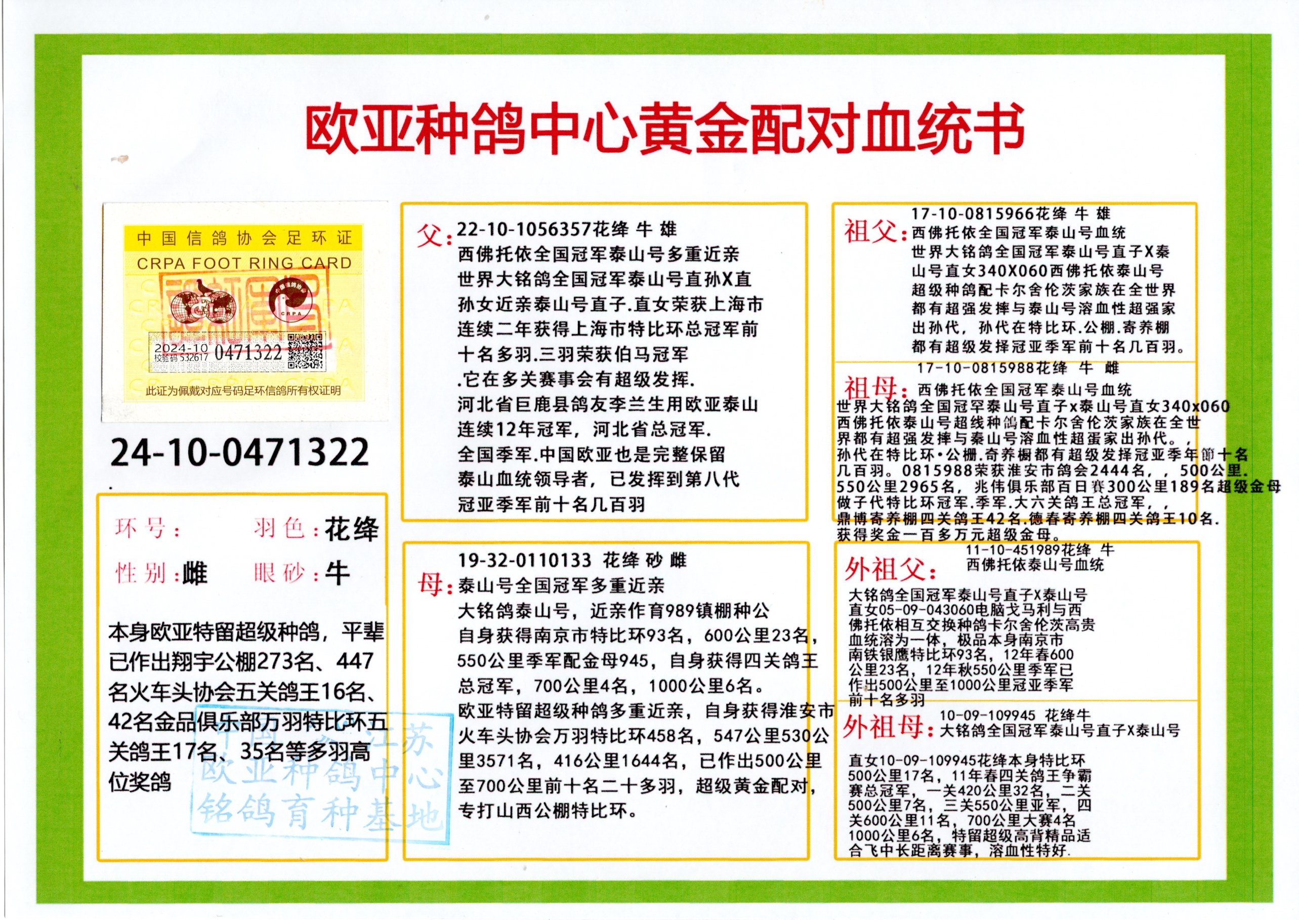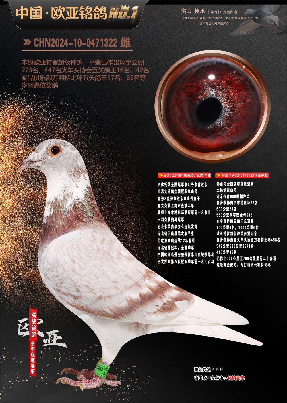24年秋南京特比环欧亚荣获大团体冠军.小团体冠军551公里大特比13名.14名.16名.19名.20名.21名.24名.26名.27名.28名.42名.52名.54名.57名.65名.66名.68名.70名.71名.72名.74名.76名.80名.82名.83名.84名.85名.86名.90名.92名.110名.116名.121名.122名.128名.131名.158名.161名.164名.165名.166名.172名.174名.177名.182名.195名.196名.201名.205名.208名.210名.216名.253名.269名.275名.276名.294名.296名.299名,,24年秋云南天南铜都公棚决赛415名.天南铜都小棚决赛409名.云南玉活公棚决赛102名.490名.团体32名上笼二羽进二羽,天南铜都大棚506公里决赛445名。热烈祝贺河北省巨鹿县李兰生老师用欧亚泰山号血系连续十一年夺冠军,河北省国家赛冠军.全国季军等多次前十名高位,扬州王军王总用欧亚利奥24年春季获山东翔宇公棚决赛33名盖比53名。南京刘正龙刘总用欧亚盖比获得24年秋山东潍坊国际公棚决赛42名.精英赛30名.三关鸽王71名.决赛86名.加站赛16名.南京市特比环A组鸽王9名.B组鸽王5名.6名.C组鸽王5名.精英赛冠军4名.技能赛A组冠军4名.5名.秦淮区特比环荣获15名.46名.48名.87名。四川西昌徐亮徐总用欧亚利奥获得凉山州聚友决赛177名.第二关亚军双关鸽王19名.三关鸽王105名.云南豪庭公棚决赛603名。热烈祝贺24年四川重庆翔园鸽舍用欧亚泰山号荣获春季400公里冠军.秋季500公里冠军,河北王总用詹森X利奥获得千羽千翔公棚400公里冠军,广东蔡楷焕荣获24年秋爱好者 赛鸽俱乐部三关鸽王季军.一关420公里99名.二关450公里11名.三关520公里32名.单关季军.7名.12名,江西李卫兴荣获贵州红枫公棚8名.共翔俱乐部寄养棚四关综合鸽王30名.一关400公里78名.二关500公里55名.三关520公里37名.四关500公里57名.同父母获公棚18名.雷鸣获得武汉黄浦育翔中心冠军,四川陈文获得四川明鸿俱乐部300公里梦幻2名.3名.4名.9名.10名.13名.14名.15名.31名.34名.40名.41名.42名.43名.69名.71名.72名.73名.74名.94名.95名.97名.98名.99名.419公里决赛荣获总冠军7名.总共归巢9羽,四川徐亮获豪庭决赛603名,山西郑勇获得山西泰鑫公棚决赛255名詹森红狐,热烈祝贺马总获得开尔(飞跃队)决赛9名获奖金1310000万元.第一关52名,天津津福资赛180公里96名.获奖金429543万元,欧亚支持全国鸽友24年秋多人报喜 祝大家取得更好成绩,给欧亚报喜鸽友欧亚决定给每人赠送一羽超级种鸽。欧亚俱乐部特比环多关鸽王成绩:15年秋淮安特比环黑色星期一全会上笼9700多羽,当天无鸽归巢,第二天全会归巢357羽,本舍归巢158羽.前十名八羽.前一百名归巢57羽,16年春季获五关鸽王总冠军,总亚军四名.六名.七名.九名.十名.晶艺俱乐部520公里冠亚季军5名.6名.7名.9名.11名等,火车头冠军.季军6名.8名.9名.10名,16年秋晶艺俱乐部特比环520公里亚军.季军4名.6名.7名.9名,15年春南京白下特比环冠军.亚军.季军6名.7名.8名.9名.10名.指定鸽A B组获得冠军.亚军.季军4名.5名.,17年淮安特比环亚军.4名.5名.7名.8名.10名.六关鸽王总冠军.4名.6名.9名.10名,寄养棚宿迁刘总20羽特比环获冠军.季军.4名.7名.8名.9名等。18年荣获万羽特比环六关鸽王总冠军.总亚军.总季军.6名.8名.十名.单关四羽冠军.二羽亚军.四羽季军.前十名27羽。19年秋万羽特比环六关鸽王总亚军.总季军.5名.8名等,单关二羽冠军.三羽亚军.一羽季军前十名31羽。20年秋淮安市鸽会四关特比环大赛风雨无阻鸽王亚军.鸽王六名,金品俱乐部万羽特比环六关鸽王总冠军,总亚军.四名.五名.六名.七名.八名.十名.前二百名鸽王35羽,单关冠亚季军前十名四十多羽,火车头五关鸽王季军.六名.八名.前二百名鸽王十七羽。20年春荣获淮安五区一市四关鸽王总冠军.亚军.四名.八名.九名。21年秋荣获金品万羽特比环大赛六关鸽王总亚军.总季军.四名.七名.九名.十名.单关冠亚军季军前十名三十多羽。火车头协会鸽王六名.七名.十名.单关前十名十七羽。22年秋荣获鸽王总冠军.总亚军.5名.7名.8名.9名.11名.单关冠亚季军前十名三十多羽,第一关单关前二百名四十多羽,第二关前二百名三十多羽,第三关前二百名四十多羽,第四关前二百名四十多羽,第五关前一百名53羽。23年秋荣获鸽王季军.五名.八名.十名.13名.17名.20名.27名等多羽鸽王.单关前十名二十多羽。公棚.寄养棚部分成绩:16年秋宁夏黄河公棚总冠军电脑戈马力指定通炮冠军,17年送八羽参赛获得鸽王八名进奖四名,支持韩总荣获八名。支持鸽友荣获宁夏中卫公棚决赛总冠军.精英赛冠军,支持18年宁夏黄河公棚决赛冠军詹森X泰山。安徽鼎博寄养棚院内外四关鸽王总冠军.鸽王十七名.三十七名同窝,鸽王39名.42名.58名.67名。18年山东公棚预赛冠军.决赛65名.送八羽进奖五羽.指定获奔驰汽车一辆。支持鸽友获得云南蓝云公棚冠军.盖比X佛卡门。支持鸽友荣获云南银集公棚决赛冠军 詹森427X520血系 速度赛6700羽冠军。17年荣获金马俱乐部寄养棚四关鸽王总冠军.季军.六名.八名.第一关冠军.亚军.季军四名.七名.十一名.金牌教练奖。支持鸽友18年北京费翔公棚预赛九名电脑X桑杰士,支持鸽友荣获陕西威力公棚决赛11名.内蒙古临河寄养棚四关鸽王六名.詹森配泰山,支持河北王总用欧亚詹森427配胡本喜获20年秋开尔青年棚季军。云南东荣公棚16年预赛冠军.决赛77名.17年决赛12名.詹森红狐X泰山,17年平安公棚决赛4名 詹森427。欧亚获得21年金母寄养棚第一关四名.第二关5名.第三关5名.6名.7名.10名.三关鸽王总冠军,四关鸽王14名.十羽鸽王。支持河
