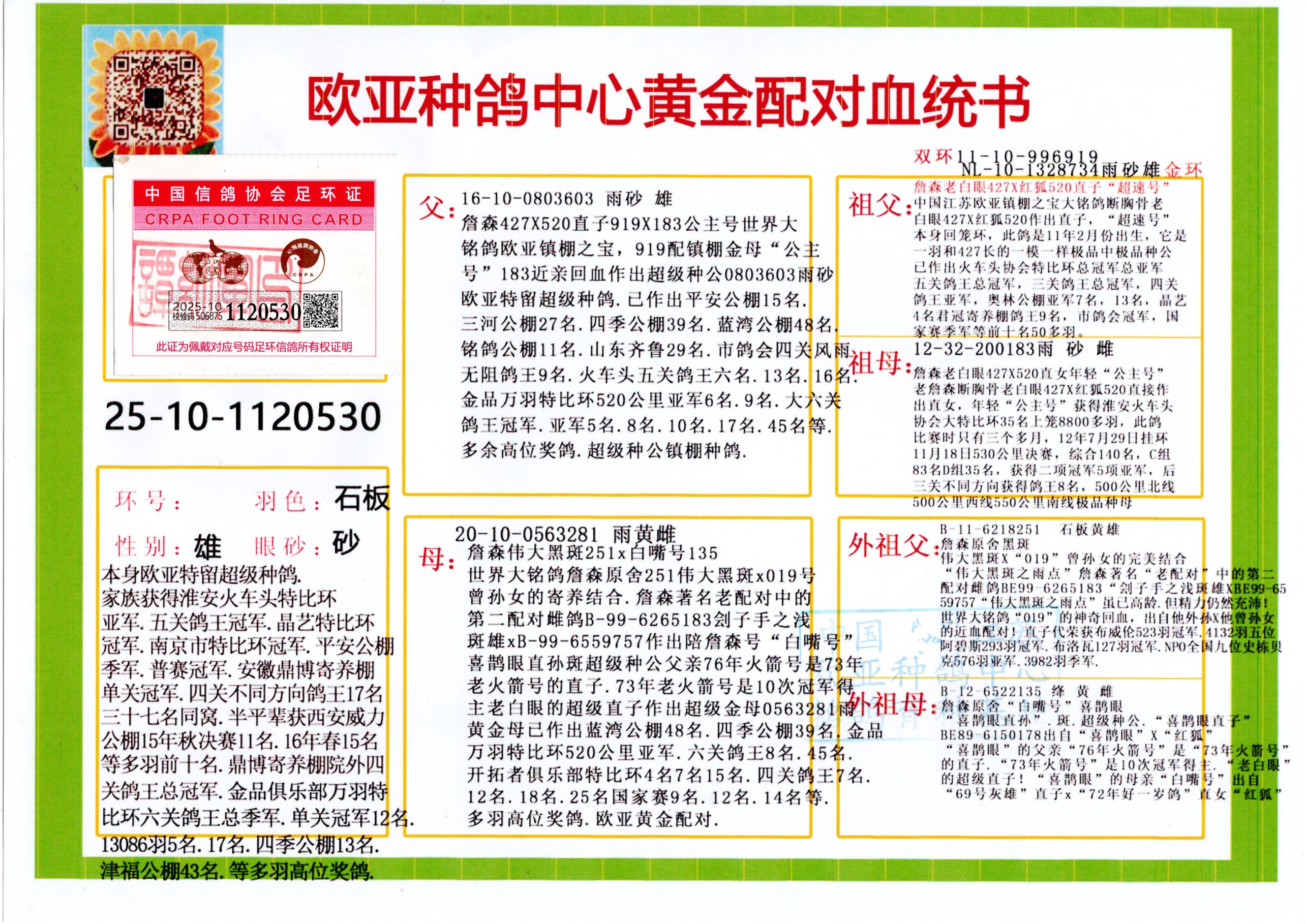 24年秋南京特比环欧亚荣获大团体冠军.小团体冠军551公里大特比13名.14名.16名.19名.20名.21名.24名.26名.27名.28名.42名.52名.54名.57名.65名.66名.68名.70名.71名.72名.74名.76名.80名.82名.83名.84名.85名.86名.90名.92名.110名.116名.121名.122名.128名.131名.158名.161名.164名.165名.166名.172名.174名.177名.182名.195名.196名.201名.205名.208名.210名.216名.253名.269名.275名.276名.294名.296名.299名,,24年秋云南天南铜都公棚决赛415名.天南铜都小棚决赛409名.云南玉活公棚决赛102名.490名.团体32名上笼二羽进二羽,天南铜都大棚506公里决赛445名。热烈祝贺河北省巨鹿县李兰生老师用欧亚泰山号血系连续十一年夺冠军,河北省国家赛冠军.全国季军等多次前十名高位,扬州王军王总用欧亚利奥24年春季获山东翔宇公棚决赛33名盖比53名。南京刘正龙刘总用欧亚盖比获得24年秋山东潍坊国际公棚决赛42名.精英赛30名.三关鸽王71名.决赛86名.加站赛16名.南京市特比环A组鸽王9名.B组鸽王5名.6名.C组鸽王5名.精英赛冠军4名.技能赛A组冠军4名.5名.秦淮区特比环荣获15名.46名.48名.87名。四川西昌徐亮徐总用欧亚利奥获得凉山州聚友决赛177名.第二关亚军双关鸽王19名.三关鸽王105名.云南豪庭公棚决赛603名。热烈祝贺24年四川重庆翔园鸽舍用欧亚泰山号荣获春季400公里冠军.秋季500公里冠军,河北王总用詹森X利奥获得千羽千翔公棚400公里冠军,广东蔡楷焕荣获24年秋爱好者 赛鸽俱乐部三关鸽王季军.一关420公里99名.二关450公里11名.三关520公里32名.单关季军.7名.12名,江西李卫兴荣获贵州红枫公棚8名.共翔俱乐部寄养棚四关综合鸽王30名.一关400公里78名.二关500公里55名.三关520公里37名.四关500公里57名.同父母获公棚18名.雷鸣获得武汉黄浦育翔中心冠军,四川陈文获得四川明鸿俱乐部300公里梦幻2名.3名.4名.9名.10名.13名.14名.15名.31名.34名.40名.41名.42名.43名.69名.71名.72名.73名.74名.94名.95名.97名.98名.99名.419公里决赛荣获总冠军7名.总共归巢9羽,四川徐亮获豪庭决赛603名,山西郑勇获得山西泰鑫公棚决赛255名詹森红狐,热烈祝贺马总获得开尔(飞跃队)决赛9名获奖金1310000万元.第一关52名,天津津福资赛180公里96名.获奖金429543万元,欧亚支持全国鸽友24年秋多人报喜 祝大家取得更好成绩,给欧亚报喜鸽友欧亚决定给每人赠送一羽超级种鸽。欧亚俱乐部特比环多关鸽王成绩:15年秋淮安特比环黑色星期一全会上笼9700多羽,当天无鸽归巢,第二天全会归巢357羽,本舍归巢158羽.前十名八羽.前一百名归巢57羽,16年春季获五关鸽王总冠军,总亚军四名.六名.七名.九名.十名.晶艺俱乐部520公里冠亚季军5名.6名.7名.9名.11名等,火车头冠军.季军6名.8名.9名.10名,16年秋晶艺俱乐部特比环520公里亚军.季军4名.6名.7名.9名,15年春南京白下特比环冠军.亚军.季军6名.7名.8名.9名.10名.指定鸽A B组获得冠军.亚军.季军4名.5名.,17年淮安特比环亚军.4名.5名.7名.8名.10名.六关鸽王总冠军.4名.6名.9名.10名,寄养棚宿迁刘总20羽特比环获冠军.季军.4名.7名.8名.9名等。18年荣获万羽特比环六关鸽王总冠军.总亚军.总季军.6名.8名.十名.单关四羽冠军.二羽亚军.四羽季军.前十名27羽。19年秋万羽特比环六关鸽王总亚军.总季军.5名.8名等,单关二羽冠军.三羽亚军.一羽季军前十名31羽。20年秋淮安市鸽会四关特比环大赛风雨无阻鸽王亚军.鸽王六名,金品俱乐部万羽特比环六关鸽王总冠军,总亚军.四名.五名.六名.七名.八名.十名.前二百名鸽王35羽,单关冠亚季军前十名四十多羽,火车头五关鸽王季军.六名.八名.前二百名鸽王十七羽。20年春荣获淮安五区一市四关鸽王总冠军.亚军.四名.八名.九名。21年秋荣获金品万羽特比环大赛六关鸽王总亚军.总季军.四名.七名.九名.十名.单关冠亚军季军前十名三十多羽。火车头协会鸽王六名.七名.十名.单关前十名十七羽。22年秋荣获鸽王总冠军.总亚军.5名.7名.8名.9名.11名.单关冠亚季军前十名三十多羽,第一关单关前二百名四十多羽,第二关前二百名三十多羽,第三关前二百名四十多羽,第四关前二百名四十多羽,第五关前一百名53羽。23年秋荣获鸽王季军.五名.八名.十名.13名.17名.20名.27名等多羽鸽王.单关前十名二十多羽。公棚.寄养棚部分成绩:16年秋宁夏黄河公棚总冠军电脑戈马力指定通炮冠军,17年送八羽参赛获得鸽王八名进奖四名,支持韩总荣获八名。支持鸽友荣获宁夏中卫公棚决赛总冠军.精英赛冠军,支持18年宁夏黄河公棚决赛冠军詹森X泰山。安徽鼎博寄养棚院内外四关鸽王总冠军.鸽王十七名.三十七名同窝,鸽王39名.42名.58名.67名。18年山东公棚预赛冠军.决赛65名.送八羽进奖五羽.指定获奔驰汽车一辆。支持鸽友获得云南蓝云公棚冠军.盖比X佛卡门。支持鸽友荣获云南银集公棚决赛冠军 詹森427X520血系 速度赛6700羽冠军。17年荣获金马俱乐部寄养棚四关鸽王总冠军.季军.六名.八名.第一关冠军.亚军.季军四名.七名.十一名.金牌教练奖。支持鸽友18年北京费翔公棚预赛九名电脑X桑杰士,支持鸽友荣获陕西威力公棚决赛11名.内蒙古临河寄养棚四关鸽王六名.詹森配泰山,支持河北王总用欧亚詹森427配胡本喜获20年秋开尔青年棚季军。云南东荣公棚16年预赛冠军.决赛77名.17年决赛12名.詹森红狐X泰山,17年平安公棚决赛4名 詹森427。欧亚获得21年金母寄养棚第一关四名.第二关5名.第三关5名.6名.7名.10名.三关鸽王总冠军,四关鸽王14名.十羽鸽王。支持河