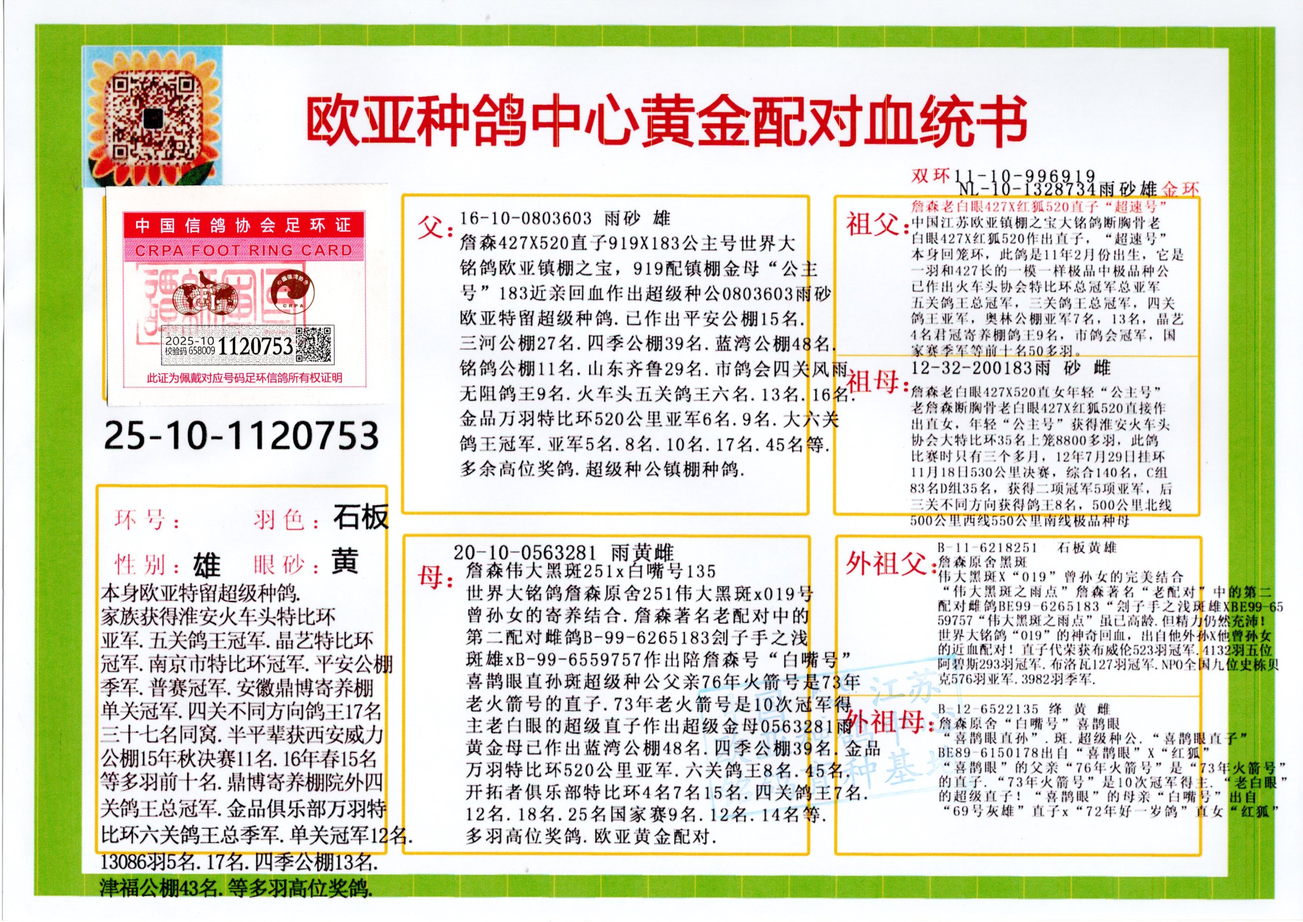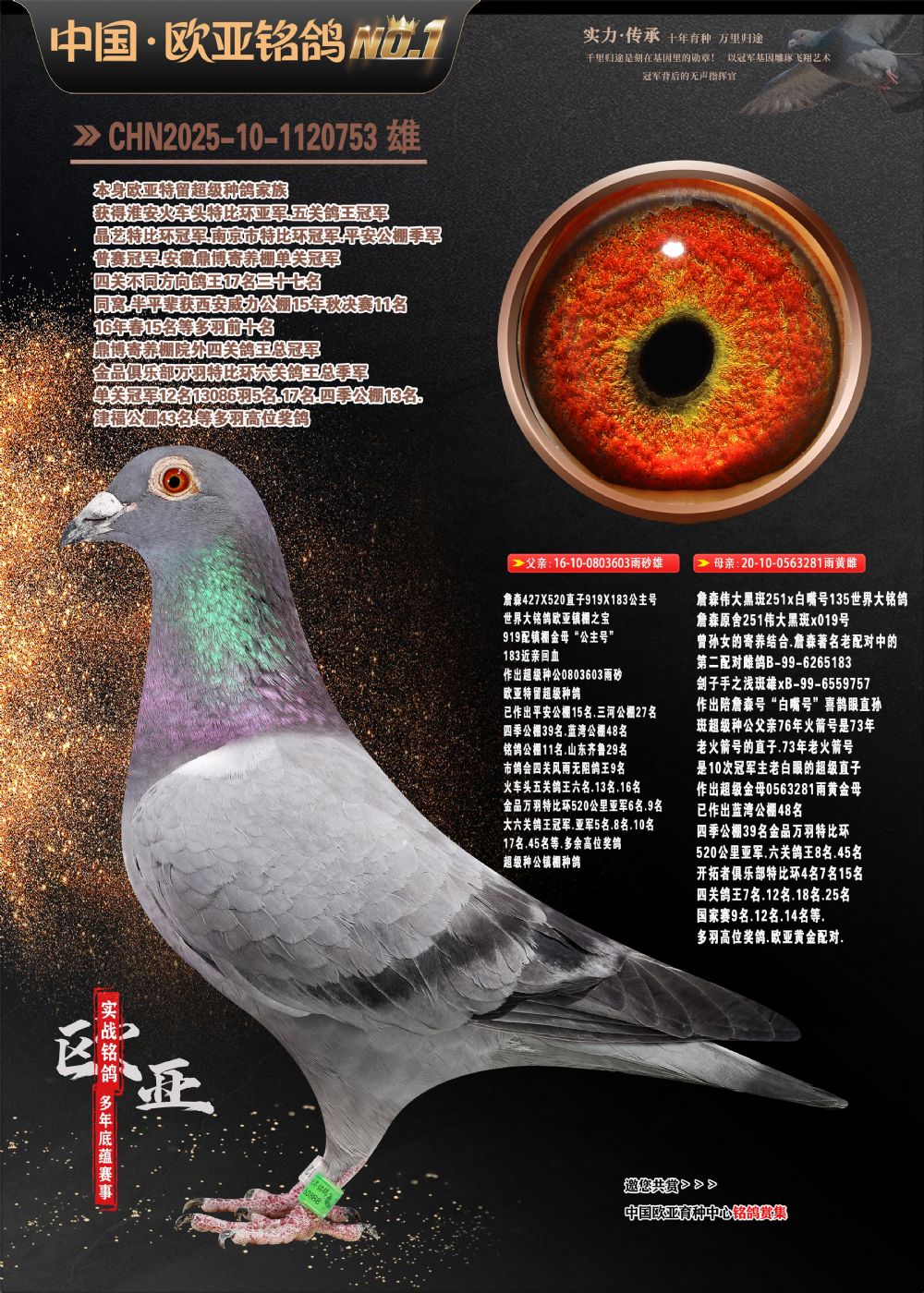 24年秋南京特比环欧亚荣获大团体冠军.小团体冠军551公里大特比13名.14名.16名.19名.20名.21名.24名.26名.27名.28名.42名.52名.54名.57名.65名.66名.68名.70名.71名.72名.74名.76名.80名.82名.83名.84名.85名.86名.90名.92名.110名.116名.121名.122名.128名.131名.158名.161名.164名.165名.166名.172名.174名.177名.182名.195名.196名.201名.205名.208名.210名.216名.253名.269名.275名.276名.294名.296名.299名,,24年秋云南天南铜都公棚决赛415名.天南铜都小棚决赛409名.云南玉活公棚决赛102名.490名.团体32名上笼二羽进二羽,天南铜都大棚506公里决赛445名。热烈祝贺河北省巨鹿县李兰生老师用欧亚泰山号血系连续十一年夺冠军,河北省国家赛冠军.全国季军等多次前十名高位,扬州王军王总用欧亚利奥24年春季获山东翔宇公棚决赛33名盖比53名。南京刘正龙刘总用欧亚盖比获得24年秋山东潍坊国际公棚决赛42名.精英赛30名.三关鸽王71名.决赛86名.加站赛16名.南京市特比环A组鸽王9名.B组鸽王5名.6名.C组鸽王5名.精英赛冠军4名.技能赛A组冠军4名.5名.秦淮区特比环荣获15名.46名.48名.87名。四川西昌徐亮徐总用欧亚利奥获得凉山州聚友决赛177名.第二关亚军双关鸽王19名.三关鸽王105名.云南豪庭公棚决赛603名。热烈祝贺24年四川重庆翔园鸽舍用欧亚泰山号荣获春季400公里冠军.秋季500公里冠军,河北王总用詹森X利奥获得千羽千翔公棚400公里冠军,广东蔡楷焕荣获24年秋爱好者 赛鸽俱乐部三关鸽王季军.一关420公里99名.二关450公里11名.三关520公里32名.单关季军.7名.12名,江西李卫兴荣获贵州红枫公棚8名.共翔俱乐部寄养棚四关综合鸽王30名.一关400公里78名.二关500公里55名.三关520公里37名.四关500公里57名.同父母获公棚18名.雷鸣获得武汉黄浦育翔中心冠军,四川陈文获得四川明鸿俱乐部300公里梦幻2名.3名.4名.9名.10名.13名.14名.15名.31名.34名.40名.41名.42名.43名.69名.71名.72名.73名.74名.94名.95名.97名.98名.99名.419公里决赛荣获总冠军7名.总共归巢9羽,四川徐亮获豪庭决赛603名,山西郑勇获得山西泰鑫公棚决赛255名詹森红狐,热烈祝贺马总获得开尔(飞跃队)决赛9名获奖金1310000万元.第一关52名,天津津福资赛180公里96名.获奖金429543万元,欧亚支持全国鸽友24年秋多人报喜 祝大家取得更好成绩,给欧亚报喜鸽友欧亚决定给每人赠送一羽超级种鸽。欧亚俱乐部特比环多关鸽王成绩:15年秋淮安特比环黑色星期一全会上笼9700多羽,当天无鸽归巢,第二天全会归巢357羽,本舍归巢158羽.前十名八羽.前一百名归巢57羽,16年春季获五关鸽王总冠军,总亚军四名.六名.七名.九名.十名.晶艺俱乐部520公里冠亚季军5名.6名.7名.9名.11名等,火车头冠军.季军6名.8名.9名.10名,16年秋晶艺俱乐部特比环520公里亚军.季军4名.6名.7名.9名,15年春南京白下特比环冠军.亚军.季军6名.7名.8名.9名.10名.指定鸽A B组获得冠军.亚军.季军4名.5名.,17年淮安特比环亚军.4名.5名.7名.8名.10名.六关鸽王总冠军.4名.6名.9名.10名,寄养棚宿迁刘总20羽特比环获冠军.季军.4名.7名.8名.9名等。18年荣获万羽特比环六关鸽王总冠军.总亚军.总季军.6名.8名.十名.单关四羽冠军.二羽亚军.四羽季军.前十名27羽。19年秋万羽特比环六关鸽王总亚军.总季军.5名.8名等,单关二羽冠军.三羽亚军.一羽季军前十名31羽。20年秋淮安市鸽会四关特比环大赛风雨无阻鸽王亚军.鸽王六名,金品俱乐部万羽特比环六关鸽王总冠军,总亚军.四名.五名.六名.七名.八名.十名.前二百名鸽王35羽,单关冠亚季军前十名四十多羽,火车头五关鸽王季军.六名.八名.前二百名鸽王十七羽。20年春荣获淮安五区一市四关鸽王总冠军.亚军.四名.八名.九名。21年秋荣获金品万羽特比环大赛六关鸽王总亚军.总季军.四名.七名.九名.十名.单关冠亚军季军前十名三十多羽。火车头协会鸽王六名.七名.十名.单关前十名十七羽。22年秋荣获鸽王总冠军.总亚军.5名.7名.8名.9名.11名.单关冠亚季军前十名三十多羽,第一关单关前二百名四十多羽,第二关前二百名三十多羽,第三关前二百名四十多羽,第四关前二百名四十多羽,第五关前一百名53羽。23年秋荣获鸽王季军.五名.八名.十名.13名.17名.20名.27名等多羽鸽王.单关前十名二十多羽。公棚.寄养棚部分成绩:16年秋宁夏黄河公棚总冠军电脑戈马力指定通炮冠军,17年送八羽参赛获得鸽王八名进奖四名,支持韩总荣获八名。支持鸽友荣获宁夏中卫公棚决赛总冠军.精英赛冠军,支持18年宁夏黄河公棚决赛冠军詹森X泰山。安徽鼎博寄养棚院内外四关鸽王总冠军.鸽王十七名.三十七名同窝,鸽王39名.42名.58名.67名。18年山东公棚预赛冠军.决赛65名.送八羽进奖五羽.指定获奔驰汽车一辆。支持鸽友获得云南蓝云公棚冠军.盖比X佛卡门。支持鸽友荣获云南银集公棚决赛冠军 詹森427X520血系 速度赛6700羽冠军。17年荣获金马俱乐部寄养棚四关鸽王总冠军.季军.六名.八名.第一关冠军.亚军.季军四名.七名.十一名.金牌教练奖。支持鸽友18年北京费翔公棚预赛九名电脑X桑杰士,支持鸽友荣获陕西威力公棚决赛11名.内蒙古临河寄养棚四关鸽王六名.詹森配泰山,支持河北王总用欧亚詹森427配胡本喜获20年秋开尔青年棚季军。云南东荣公棚16年预赛冠军.决赛77名.17年决赛12名.詹森红狐X泰山,17年平安公棚决赛4名 詹森427。欧亚获得21年金母寄养棚第一关四名.第二关5名.第三关5名.6名.7名.10名.三关鸽王总冠军,四关鸽王14名.十羽鸽王。支持河