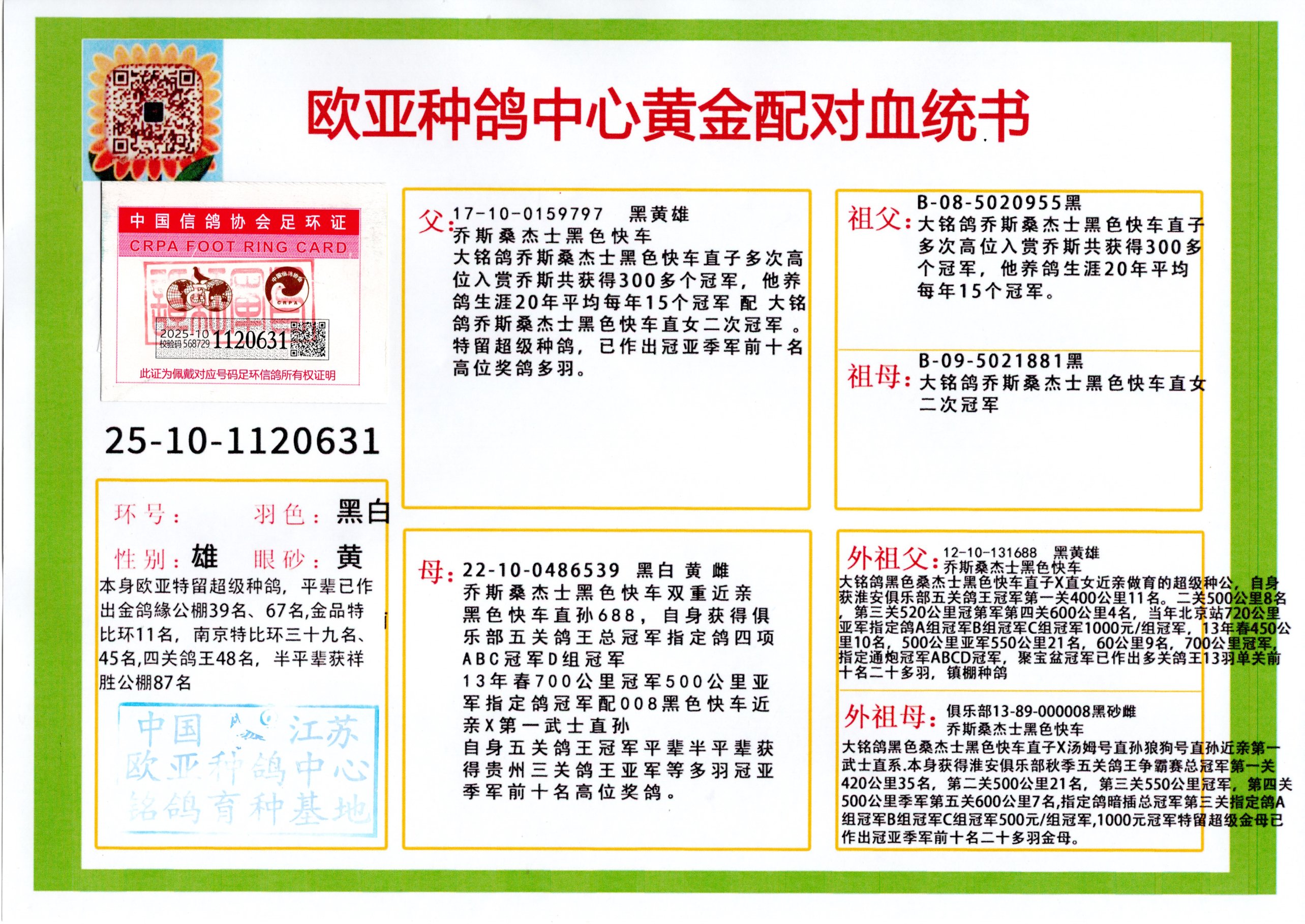 24年秋南京特比环欧亚荣获大团体冠军.小团体冠军551公里大特比13名.14名.16名.19名.20名.21名.24名.26名.27名.28名.42名.52名.54名.57名.65名.66名.68名.70名.71名.72名.74名.76名.80名.82名.83名.84名.85名.86名.90名.92名.110名.116名.121名.122名.128名.131名.158名.161名.164名.165名.166名.172名.174名.177名.182名.195名.196名.201名.205名.208名.210名.216名.253名.269名.275名.276名.294名.296名.299名,,24年秋云南天南铜都公棚决赛415名.天南铜都小棚决赛409名.云南玉活公棚决赛102名.490名.团体32名上笼二羽进二羽,天南铜都大棚506公里决赛445名。热烈祝贺河北省巨鹿县李兰生老师用欧亚泰山号血系连续十一年夺冠军,河北省国家赛冠军.全国季军等多次前十名高位,扬州王军王总用欧亚利奥24年春季获山东翔宇公棚决赛33名盖比53名。南京刘正龙刘总用欧亚盖比获得24年秋山东潍坊国际公棚决赛42名.精英赛30名.三关鸽王71名.决赛86名.加站赛16名.南京市特比环A组鸽王9名.B组鸽王5名.6名.C组鸽王5名.精英赛冠军4名.技能赛A组冠军4名.5名.秦淮区特比环荣获15名.46名.48名.87名。四川西昌徐亮徐总用欧亚利奥获得凉山州聚友决赛177名.第二关亚军双关鸽王19名.三关鸽王105名.云南豪庭公棚决赛603名。热烈祝贺24年四川重庆翔园鸽舍用欧亚泰山号荣获春季400公里冠军.秋季500公里冠军,河北王总用詹森X利奥获得千羽千翔公棚400公里冠军,广东蔡楷焕荣获24年秋爱好者 赛鸽俱乐部三关鸽王季军.一关420公里99名.二关450公里11名.三关520公里32名.单关季军.7名.12名,江西李卫兴荣获贵州红枫公棚8名.共翔俱乐部寄养棚四关综合鸽王30名.一关400公里78名.二关500公里55名.三关520公里37名.四关500公里57名.同父母获公棚18名.雷鸣获得武汉黄浦育翔中心冠军,四川陈文获得四川明鸿俱乐部300公里梦幻2名.3名.4名.9名.10名.13名.14名.15名.31名.34名.40名.41名.42名.43名.69名.71名.72名.73名.74名.94名.95名.97名.98名.99名.419公里决赛荣获总冠军7名.总共归巢9羽,四川徐亮获豪庭决赛603名,山西郑勇获得山西泰鑫公棚决赛255名詹森红狐,热烈祝贺马总获得开尔(飞跃队)决赛9名获奖金1310000万元.第一关52名,天津津福资赛180公里96名.获奖金429543万元,欧亚支持全国鸽友24年秋多人报喜 祝大家取得更好成绩,给欧亚报喜鸽友欧亚决定给每人赠送一羽超级种鸽。欧亚俱乐部特比环多关鸽王成绩:15年秋淮安特比环黑色星期一全会上笼9700多羽,当天无鸽归巢,第二天全会归巢357羽,本舍归巢158羽.前十名八羽.前一百名归巢57羽,16年春季获五关鸽王总冠军,总亚军四名.六名.七名.九名.十名.晶艺俱乐部520公里冠亚季军5名.6名.7名.9名.11名等,火车头冠军.季军6名.8名.9名.10名,16年秋晶艺俱乐部特比环520公里亚军.季军4名.6名.7名.9名,15年春南京白下特比环冠军.亚军.季军6名.7名.8名.9名.10名.指定鸽A B组获得冠军.亚军.季军4名.5名.,17年淮安特比环亚军.4名.5名.7名.8名.10名.六关鸽王总冠军.4名.6名.9名.10名,寄养棚宿迁刘总20羽特比环获冠军.季军.4名.7名.8名.9名等。18年荣获万羽特比环六关鸽王总冠军.总亚军.总季军.6名.8名.十名.单关四羽冠军.二羽亚军.四羽季军.前十名27羽。19年秋万羽特比环六关鸽王总亚军.总季军.5名.8名等,单关二羽冠军.三羽亚军.一羽季军前十名31羽。20年秋淮安市鸽会四关特比环大赛风雨无阻鸽王亚军.鸽王六名,金品俱乐部万羽特比环六关鸽王总冠军,总亚军.四名.五名.六名.七名.八名.十名.前二百名鸽王35羽,单关冠亚季军前十名四十多羽,火车头五关鸽王季军.六名.八名.前二百名鸽王十七羽。20年春荣获淮安五区一市四关鸽王总冠军.亚军.四名.八名.九名。21年秋荣获金品万羽特比环大赛六关鸽王总亚军.总季军.四名.七名.九名.十名.单关冠亚军季军前十名三十多羽。火车头协会鸽王六名.七名.十名.单关前十名十七羽。22年秋荣获鸽王总冠军.总亚军.5名.7名.8名.9名.11名.单关冠亚季军前十名三十多羽,第一关单关前二百名四十多羽,第二关前二百名三十多羽,第三关前二百名四十多羽,第四关前二百名四十多羽,第五关前一百名53羽。23年秋荣获鸽王季军.五名.八名.十名.13名.17名.20名.27名等多羽鸽王.单关前十名二十多羽。公棚.寄养棚部分成绩:16年秋宁夏黄河公棚总冠军电脑戈马力指定通炮冠军,17年送八羽参赛获得鸽王八名进奖四名,支持韩总荣获八名。支持鸽友荣获宁夏中卫公棚决赛总冠军.精英赛冠军,支持18年宁夏黄河公棚决赛冠军詹森X泰山。安徽鼎博寄养棚院内外四关鸽王总冠军.鸽王十七名.三十七名同窝,鸽王39名.42名.58名.67名。18年山东公棚预赛冠军.决赛65名.送八羽进奖五羽.指定获奔驰汽车一辆。支持鸽友获得云南蓝云公棚冠军.盖比X佛卡门。支持鸽友荣获云南银集公棚决赛冠军 詹森427X520血系 速度赛6700羽冠军。17年荣获金马俱乐部寄养棚四关鸽王总冠军.季军.六名.八名.第一关冠军.亚军.季军四名.七名.十一名.金牌教练奖。支持鸽友18年北京费翔公棚预赛九名电脑X桑杰士,支持鸽友荣获陕西威力公棚决赛11名.内蒙古临河寄养棚四关鸽王六名.詹森配泰山,支持河北王总用欧亚詹森427配胡本喜获20年秋开尔青年棚季军。云南东荣公棚16年预赛冠军.决赛77名.17年决赛12名.詹森红狐X泰山,17年平安公棚决赛4名 詹森427。欧亚获得21年金母寄养棚第一关四名.第二关5名.第三关5名.6名.7名.10名.三关鸽王总冠军,四关鸽王14名.十羽鸽王。支持河