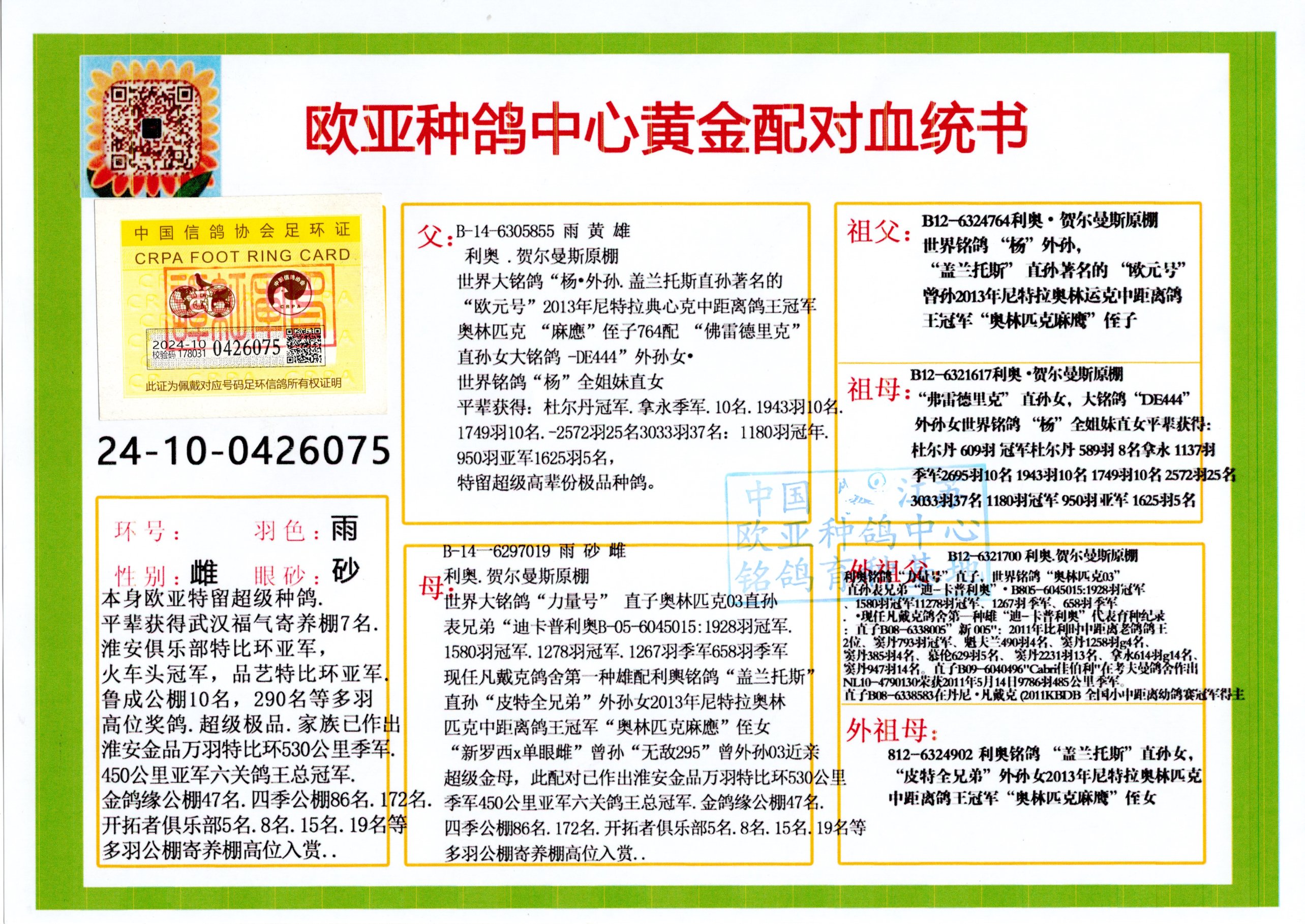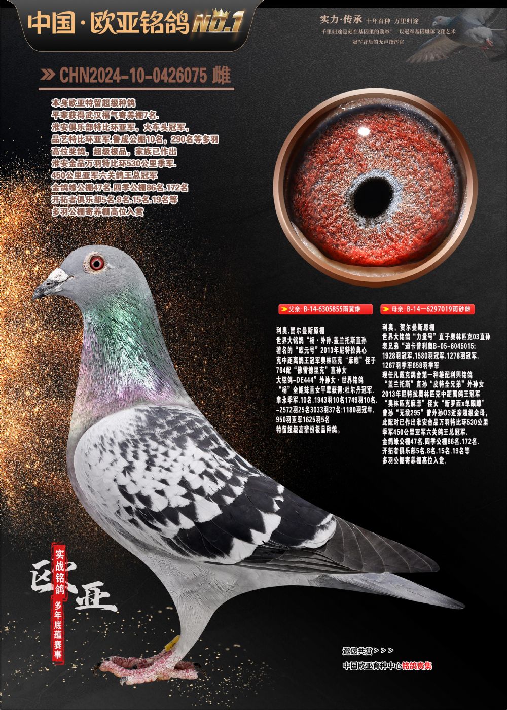 24年秋南京特比环欧亚荣获大团体冠军.小团体冠军551公里大特比13名.14名.16名.19名.20名.21名.24名.26名.27名.28名.42名.52名.54名.57名.65名.66名.68名.70名.71名.72名.74名.76名.80名.82名.83名.84名.85名.86名.90名.92名.110名.116名.121名.122名.128名.131名.158名.161名.164名.165名.166名.172名.174名.177名.182名.195名.196名.201名.205名.208名.210名.216名.253名.269名.275名.276名.294名.296名.299名,,24年秋云南天南铜都公棚决赛415名.天南铜都小棚决赛409名.云南玉活公棚决赛102名.490名.团体32名上笼二羽进二羽,天南铜都大棚506公里决赛445名。热烈祝贺河北省巨鹿县李兰生老师用欧亚泰山号血系连续十一年夺冠军,河北省国家赛冠军.全国季军等多次前十名高位,扬州王军王总用欧亚利奥24年春季获山东翔宇公棚决赛33名盖比53名。南京刘正龙刘总用欧亚盖比获得24年秋山东潍坊国际公棚决赛42名.精英赛30名.三关鸽王71名.决赛86名.加站赛16名.南京市特比环A组鸽王9名.B组鸽王5名.6名.C组鸽王5名.精英赛冠军4名.技能赛A组冠军4名.5名.秦淮区特比环荣获15名.46名.48名.87名。四川西昌徐亮徐总用欧亚利奥获得凉山州聚友决赛177名.第二关亚军双关鸽王19名.三关鸽王105名.云南豪庭公棚决赛603名。热烈祝贺24年四川重庆翔园鸽舍用欧亚泰山号荣获春季400公里冠军.秋季500公里冠军,河北王总用詹森X利奥获得千羽千翔公棚400公里冠军,广东蔡楷焕荣获24年秋爱好者 赛鸽俱乐部三关鸽王季军.一关420公里99名.二关450公里11名.三关520公里32名.单关季军.7名.12名,江西李卫兴荣获贵州红枫公棚8名.共翔俱乐部寄养棚四关综合鸽王30名.一关400公里78名.二关500公里55名.三关520公里37名.四关500公里57名.同父母获公棚18名.雷鸣获得武汉黄浦育翔中心冠军,四川陈文获得四川明鸿俱乐部300公里梦幻2名.3名.4名.9名.10名.13名.14名.15名.31名.34名.40名.41名.42名.43名.69名.71名.72名.73名.74名.94名.95名.97名.98名.99名.419公里决赛荣获总冠军7名.总共归巢9羽,四川徐亮获豪庭决赛603名,山西郑勇获得山西泰鑫公棚决赛255名詹森红狐,热烈祝贺马总获得开尔(飞跃队)决赛9名获奖金1310000万元.第一关52名,天津津福资赛180公里96名.获奖金429543万元,欧亚支持全国鸽友24年秋多人报喜 祝大家取得更好成绩,给欧亚报喜鸽友欧亚决定给每人赠送一羽超级种鸽。欧亚俱乐部特比环多关鸽王成绩:15年秋淮安特比环黑色星期一全会上笼9700多羽,当天无鸽归巢,第二天全会归巢357羽,本舍归巢158羽.前十名八羽.前一百名归巢57羽,16年春季获五关鸽王总冠军,总亚军四名.六名.七名.九名.十名.晶艺俱乐部520公里冠亚季军5名.6名.7名.9名.11名等,火车头冠军.季军6名.8名.9名.10名,16年秋晶艺俱乐部特比环520公里亚军.季军4名.6名.7名.9名,15年春南京白下特比环冠军.亚军.季军6名.7名.8名.9名.10名.指定鸽A B组获得冠军.亚军.季军4名.5名.,17年淮安特比环亚军.4名.5名.7名.8名.10名.六关鸽王总冠军.4名.6名.9名.10名,寄养棚宿迁刘总20羽特比环获冠军.季军.4名.7名.8名.9名等。18年荣获万羽特比环六关鸽王总冠军.总亚军.总季军.6名.8名.十名.单关四羽冠军.二羽亚军.四羽季军.前十名27羽。19年秋万羽特比环六关鸽王总亚军.总季军.5名.8名等,单关二羽冠军.三羽亚军.一羽季军前十名31羽。20年秋淮安市鸽会四关特比环大赛风雨无阻鸽王亚军.鸽王六名,金品俱乐部万羽特比环六关鸽王总冠军,总亚军.四名.五名.六名.七名.八名.十名.前二百名鸽王35羽,单关冠亚季军前十名四十多羽,火车头五关鸽王季军.六名.八名.前二百名鸽王十七羽。20年春荣获淮安五区一市四关鸽王总冠军.亚军.四名.八名.九名。21年秋荣获金品万羽特比环大赛六关鸽王总亚军.总季军.四名.七名.九名.十名.单关冠亚军季军前十名三十多羽。火车头协会鸽王六名.七名.十名.单关前十名十七羽。22年秋荣获鸽王总冠军.总亚军.5名.7名.8名.9名.11名.单关冠亚季军前十名三十多羽,第一关单关前二百名四十多羽,第二关前二百名三十多羽,第三关前二百名四十多羽,第四关前二百名四十多羽,第五关前一百名53羽。23年秋荣获鸽王季军.五名.八名.十名.13名.17名.20名.27名等多羽鸽王.单关前十名二十多羽。公棚.寄养棚部分成绩:16年秋宁夏黄河公棚总冠军电脑戈马力指定通炮冠军,17年送八羽参赛获得鸽王八名进奖四名,支持韩总荣获八名。支持鸽友荣获宁夏中卫公棚决赛总冠军.精英赛冠军,支持18年宁夏黄河公棚决赛冠军詹森X泰山。安徽鼎博寄养棚院内外四关鸽王总冠军.鸽王十七名.三十七名同窝,鸽王39名.42名.58名.67名。18年山东公棚预赛冠军.决赛65名.送八羽进奖五羽.指定获奔驰汽车一辆。支持鸽友获得云南蓝云公棚冠军.盖比X佛卡门。支持鸽友荣获云南银集公棚决赛冠军 詹森427X520血系 速度赛6700羽冠军。17年荣获金马俱乐部寄养棚四关鸽王总冠军.季军.六名.八名.第一关冠军.亚军.季军四名.七名.十一名.金牌教练奖。支持鸽友18年北京费翔公棚预赛九名电脑X桑杰士,支持鸽友荣获陕西威力公棚决赛11名.内蒙古临河寄养棚四关鸽王六名.詹森配泰山,支持河北王总用欧亚詹森427配胡本喜获20年秋开尔青年棚季军。云南东荣公棚16年预赛冠军.决赛77名.17年决赛12名.詹森红狐X泰山,17年平安公棚决赛4名 詹森427。欧亚获得21年金母寄养棚第一关四名.第二关5名.第三关5名.6名.7名.10名.三关鸽王总冠军,四关鸽王14名.十羽鸽王。支持河